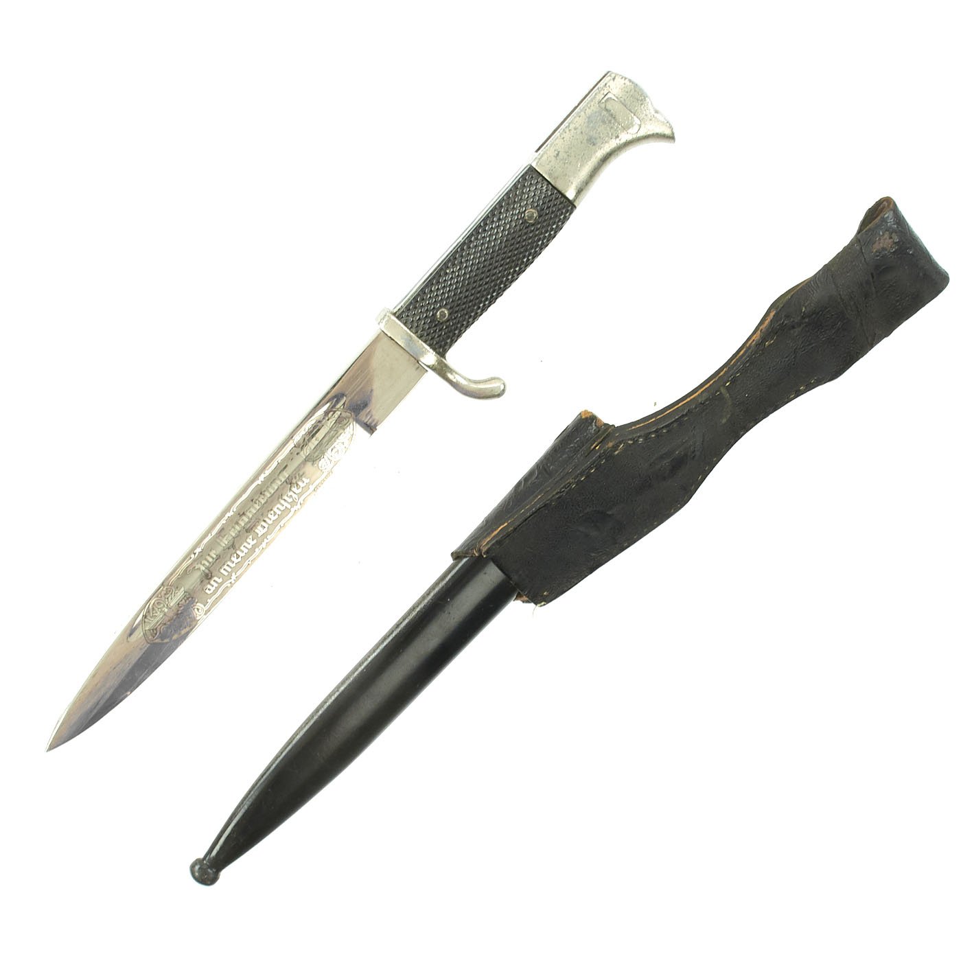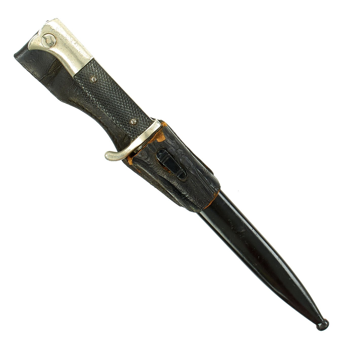 Original Item: Only One Available. The K-98 dress bayonet was a dress version of the combat style, and was worn by enlisted and NCO personnel for dress and parade occasions. The bayonets were finished with a high-quality nickel plating, with stag or bakelite grip plates and black painted scabbard. The choice of blade length was left to the purchaser, being nickel-plated short or long version. There was usually a red or green colored felt insert in the rifle slot and the bayonet was suspended from a black or brown leather frog. Some had a functional bayonet latch, while it was ornamental on some.