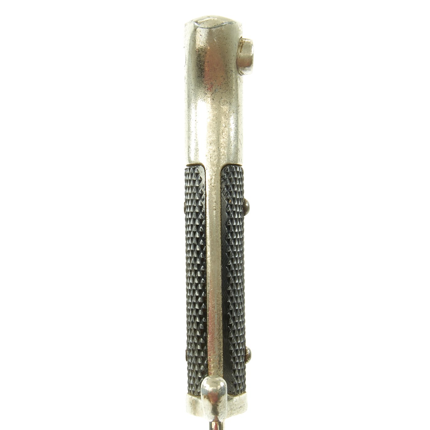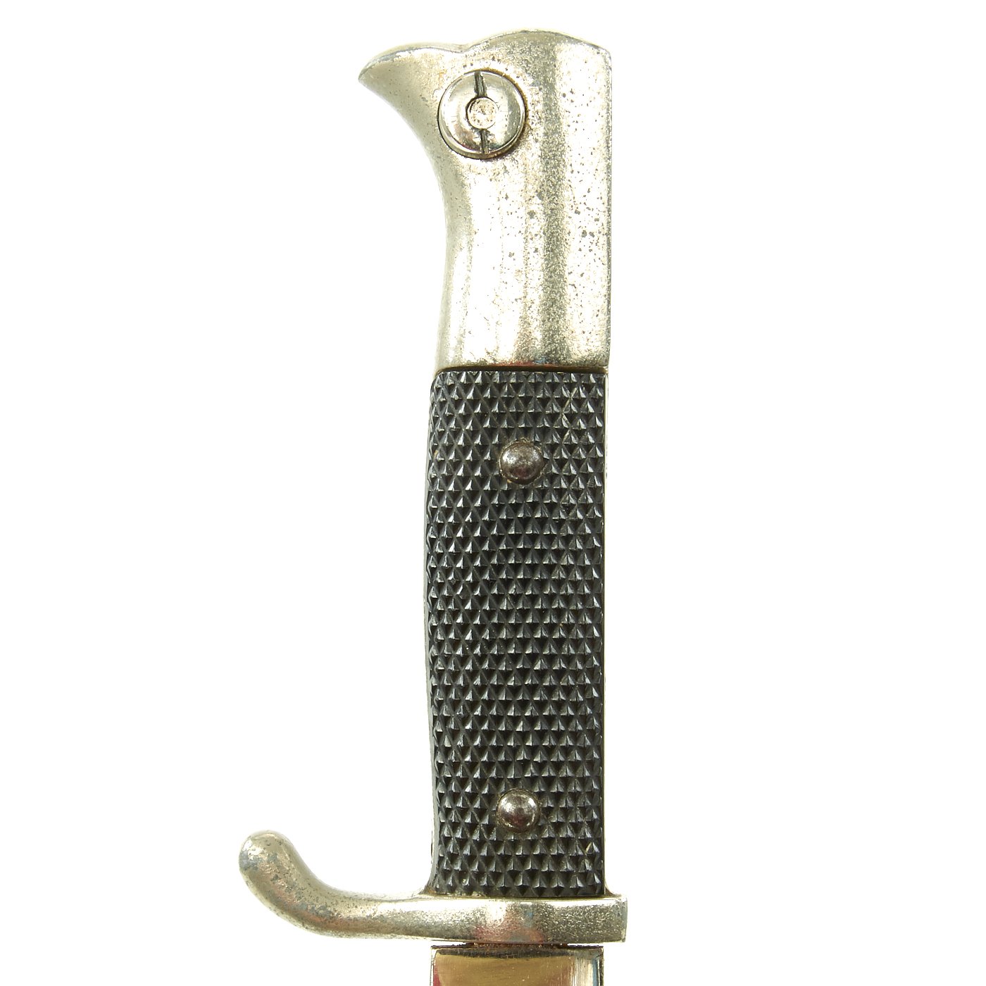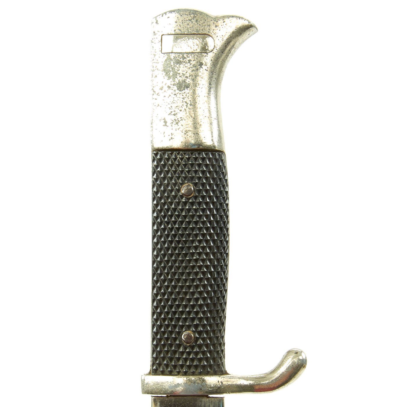The blade on this example is nickel-plated, as were all dress bayonets. It does have slight wear to the plating and oxidation, with some runner wear and light scratching. It has not been sharpened, and still retains its blunt factory edge.