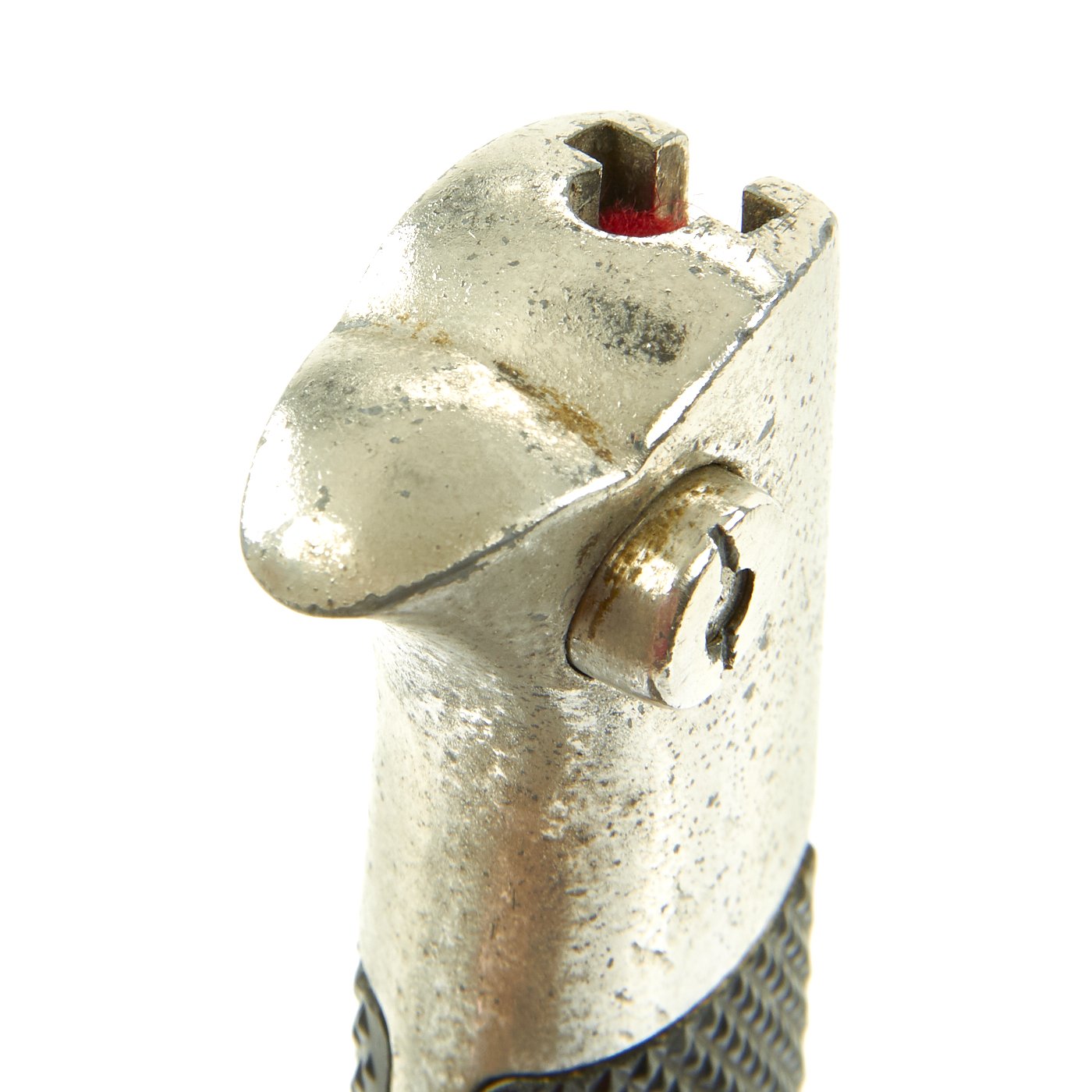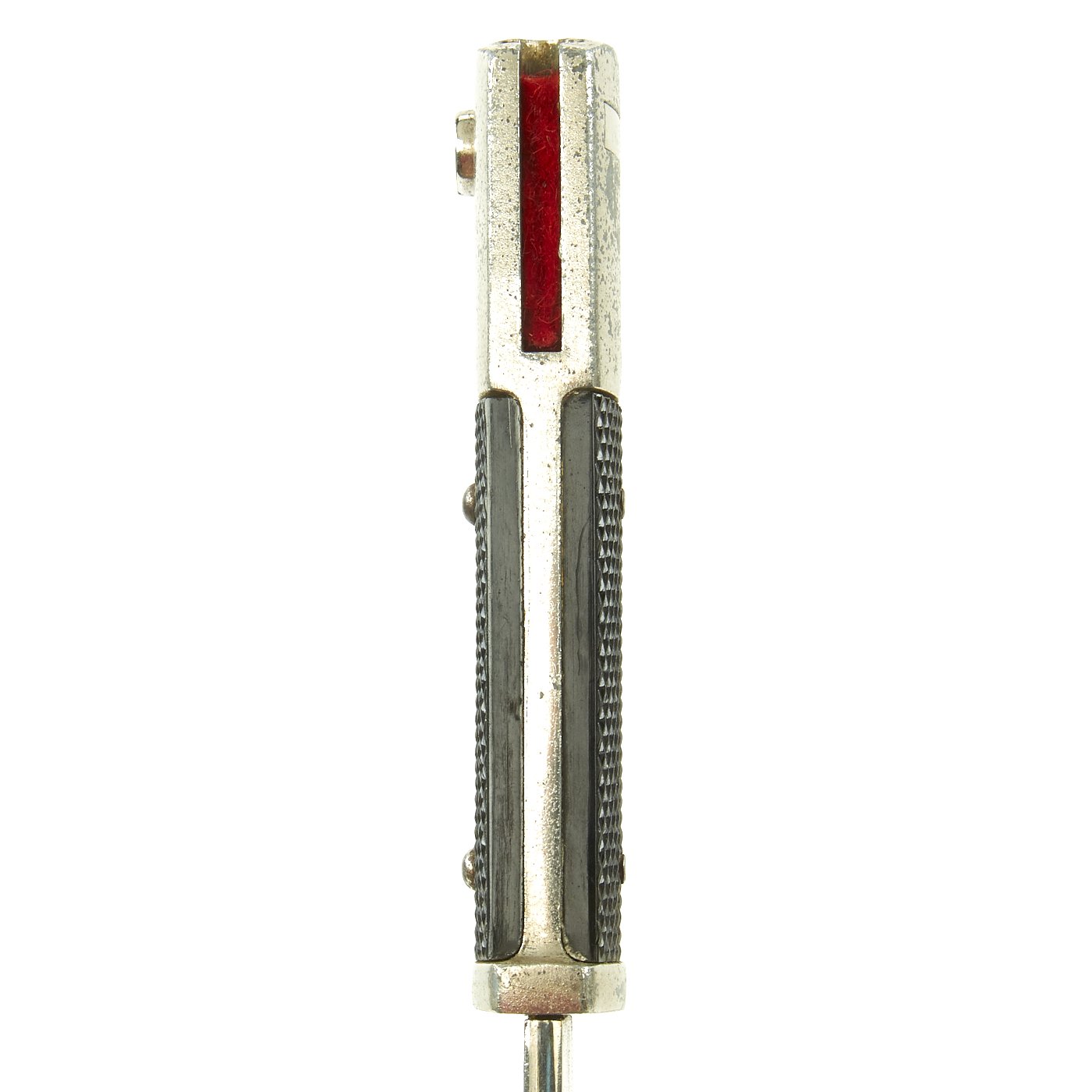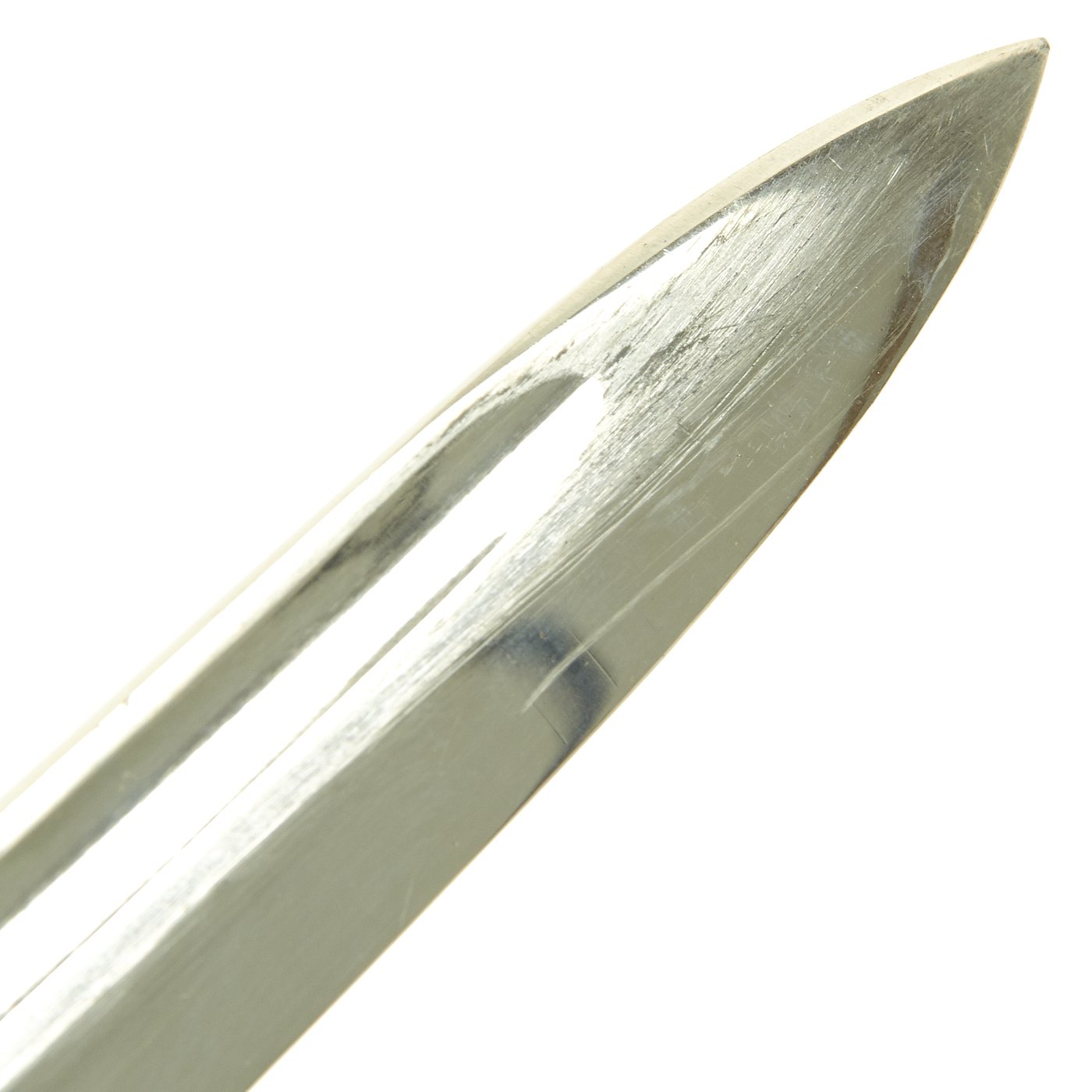 The blade on this example is nickel-plated, as were all dress bayonets. It does have slight wear to the plating and oxidation, with some runner wear and light scratching. It has not been sharpened, and still retains its blunt factory edge.