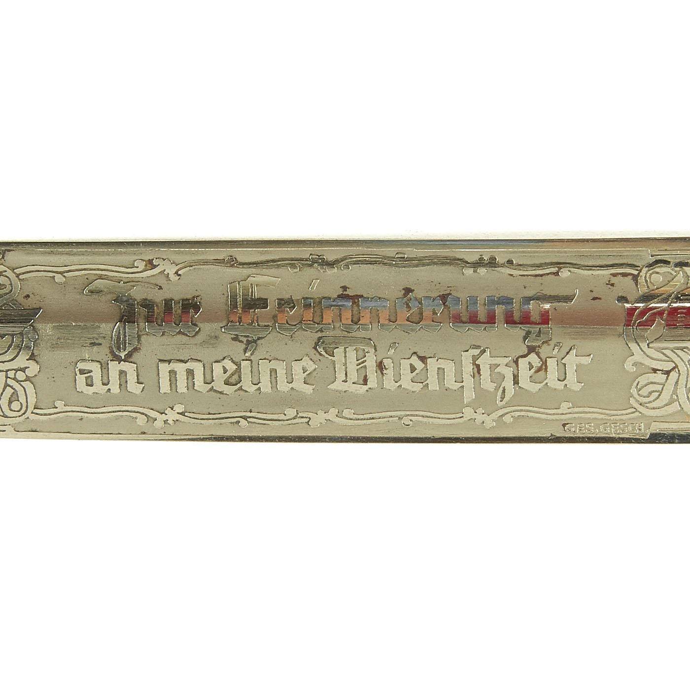 This translates to "For a reminder of my service." This is a common phrase to see on personalized items such as this. There is also GES. GESCH. marked on the etching, indicating that it is a trademarked design. The leather blade buffer is unfortunately missing. There is no maker mark on this blade, but that was not uncommon. Raw blades were often sold to retailers for customization, and were not marked.