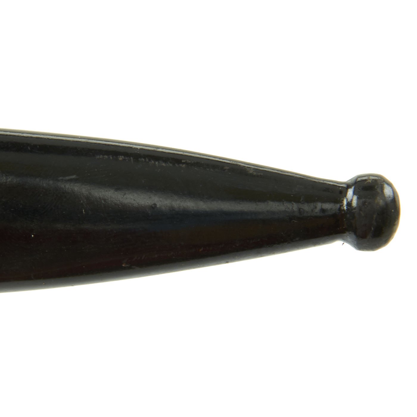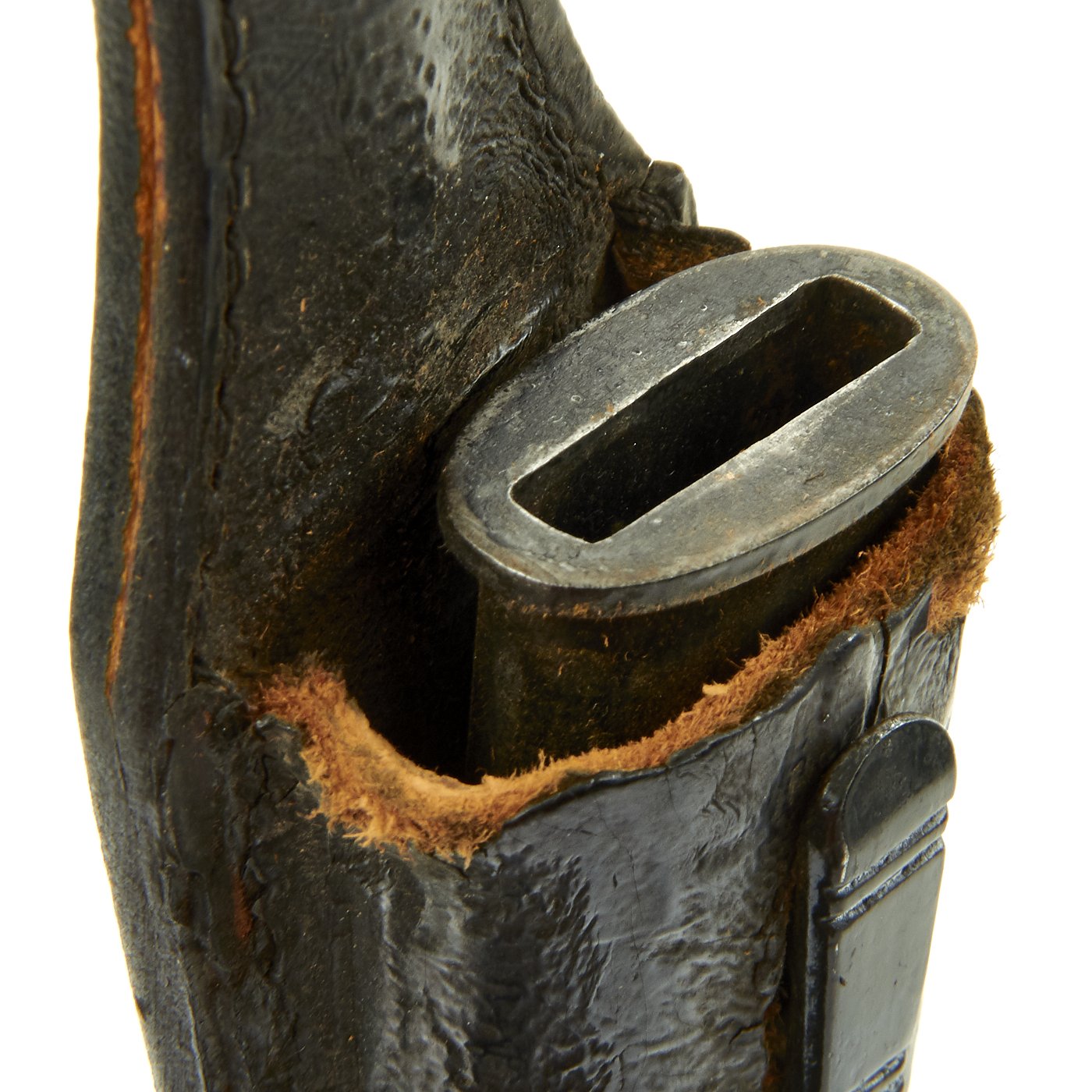 The scabbard is quite nice and still has over 95% of the original black enamel paint, with minimal checking and crazing. There are no dents, and just light wear. The body is held by the included black leather frog, which is in good used condition, though the finish has some cracking and flaking. The leather is soft, though the original stitching is coming apart below the belt loop. The black patent leather finish is a degraded as shown, as it often "melts" over the years due to pressure.