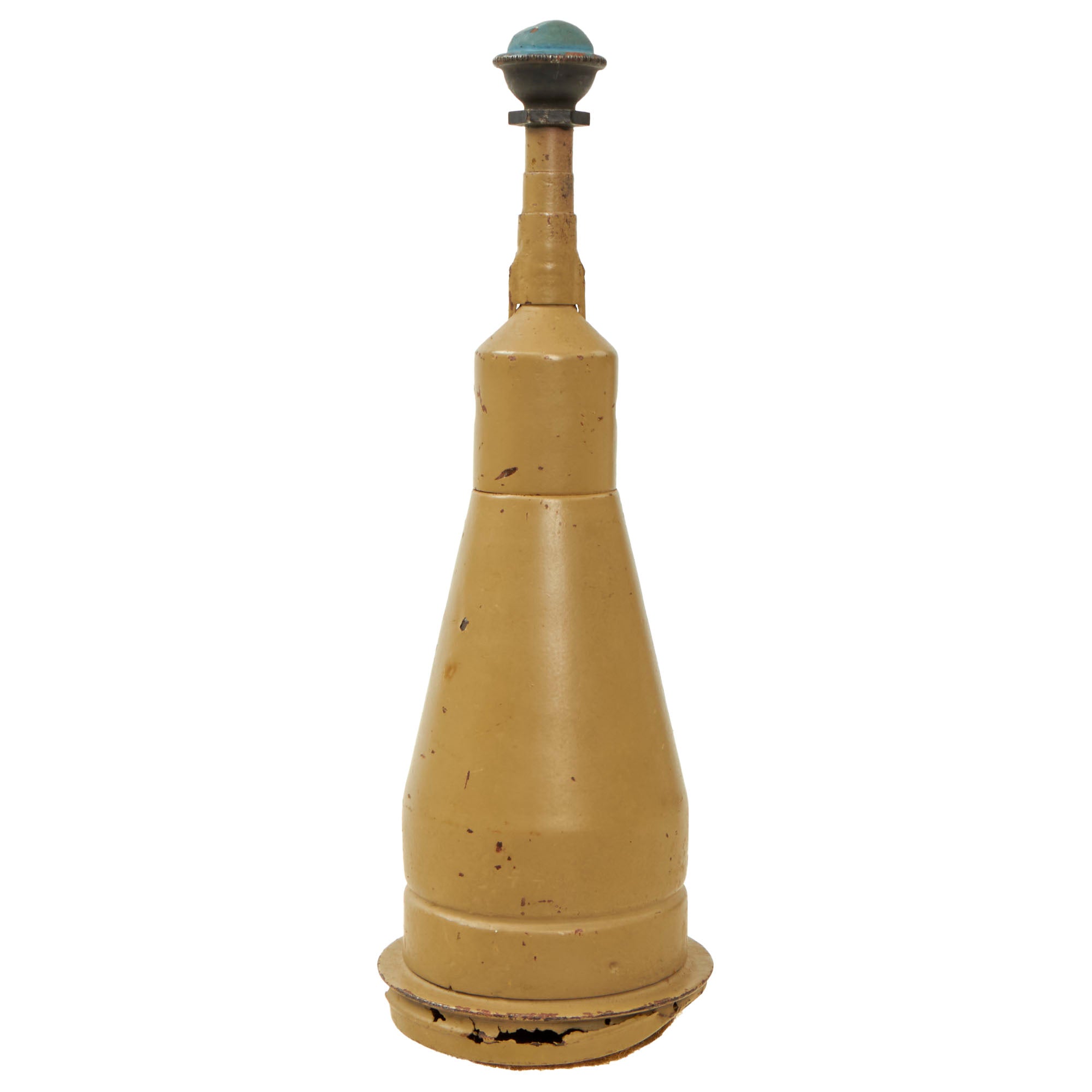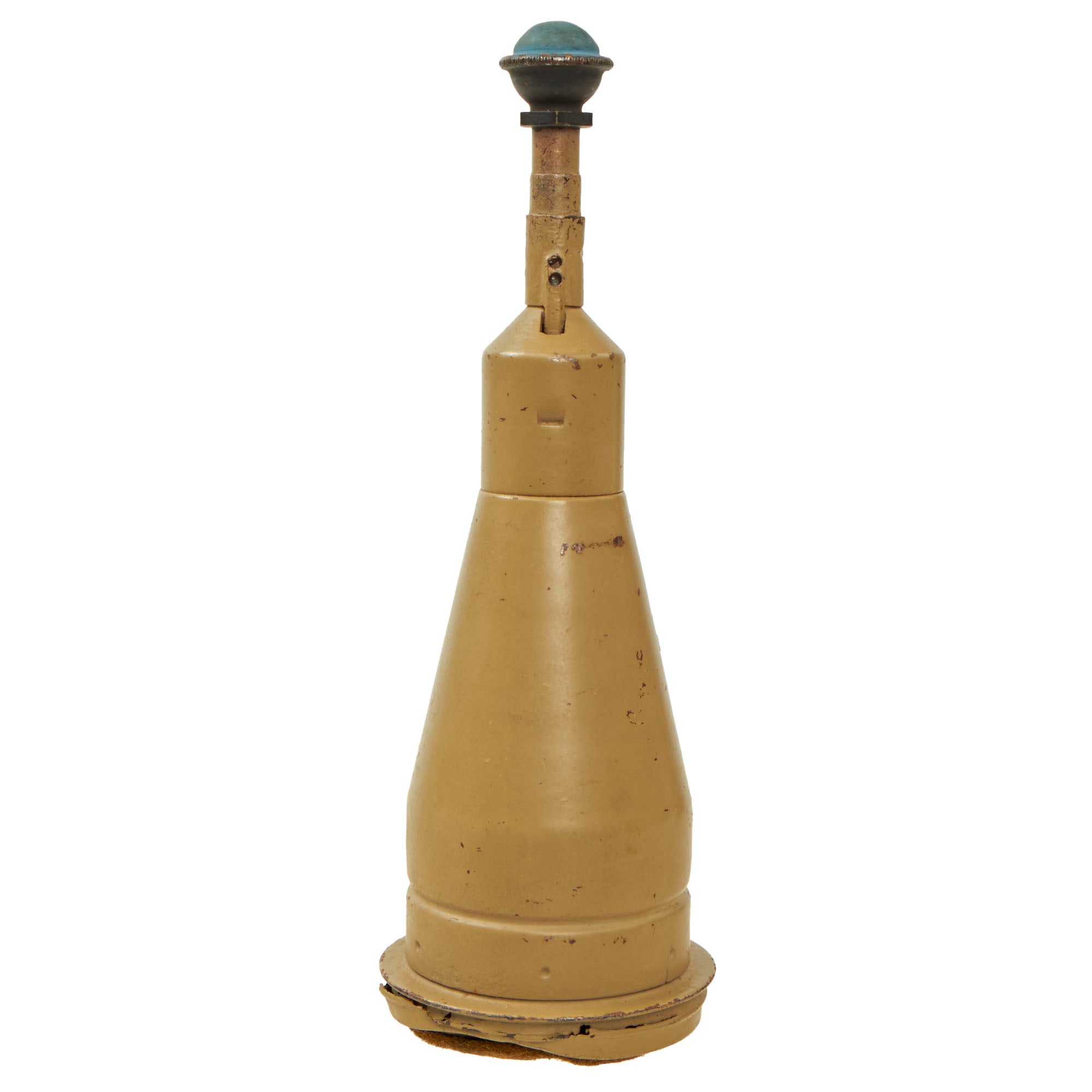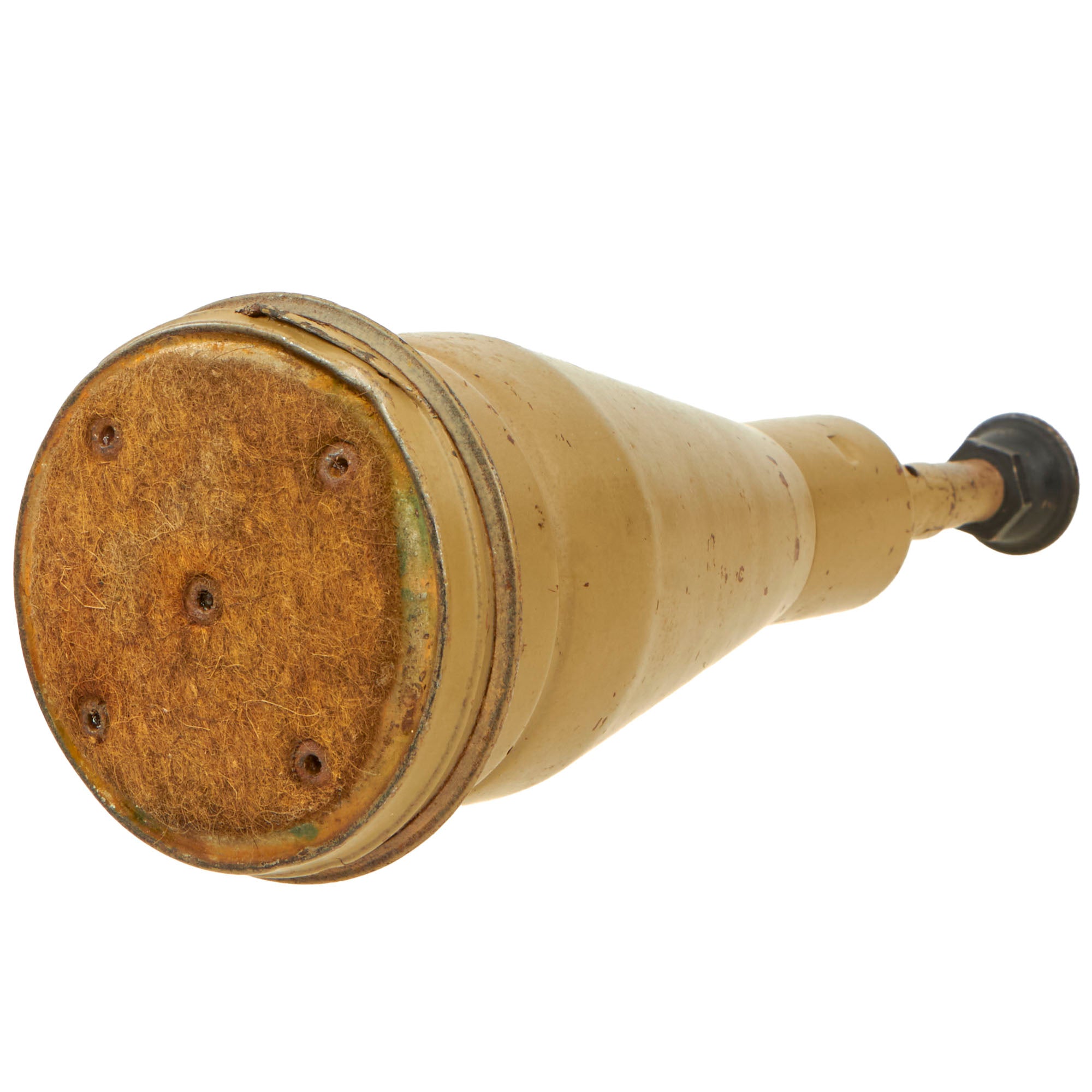 Most of the examples we have seen are larger, and were attached to the tank using strong magnets on the face of the grenade. This example however measures 8 3/8" long with a base 2 3/4" in diameter, which is covered with a felt pad. This originally was saturated with a strong adhesive, which would hold the grenade onto the tank until it detonated.