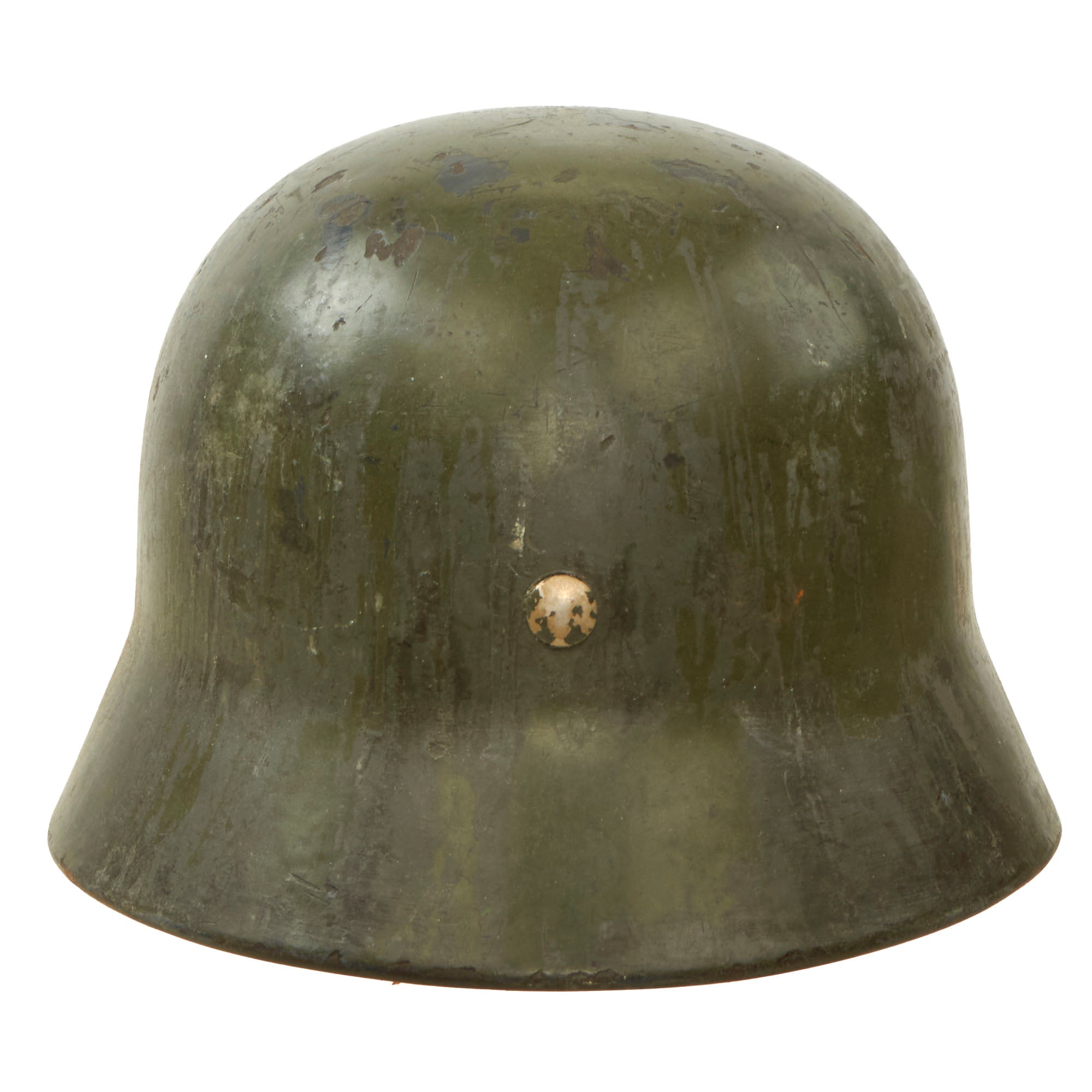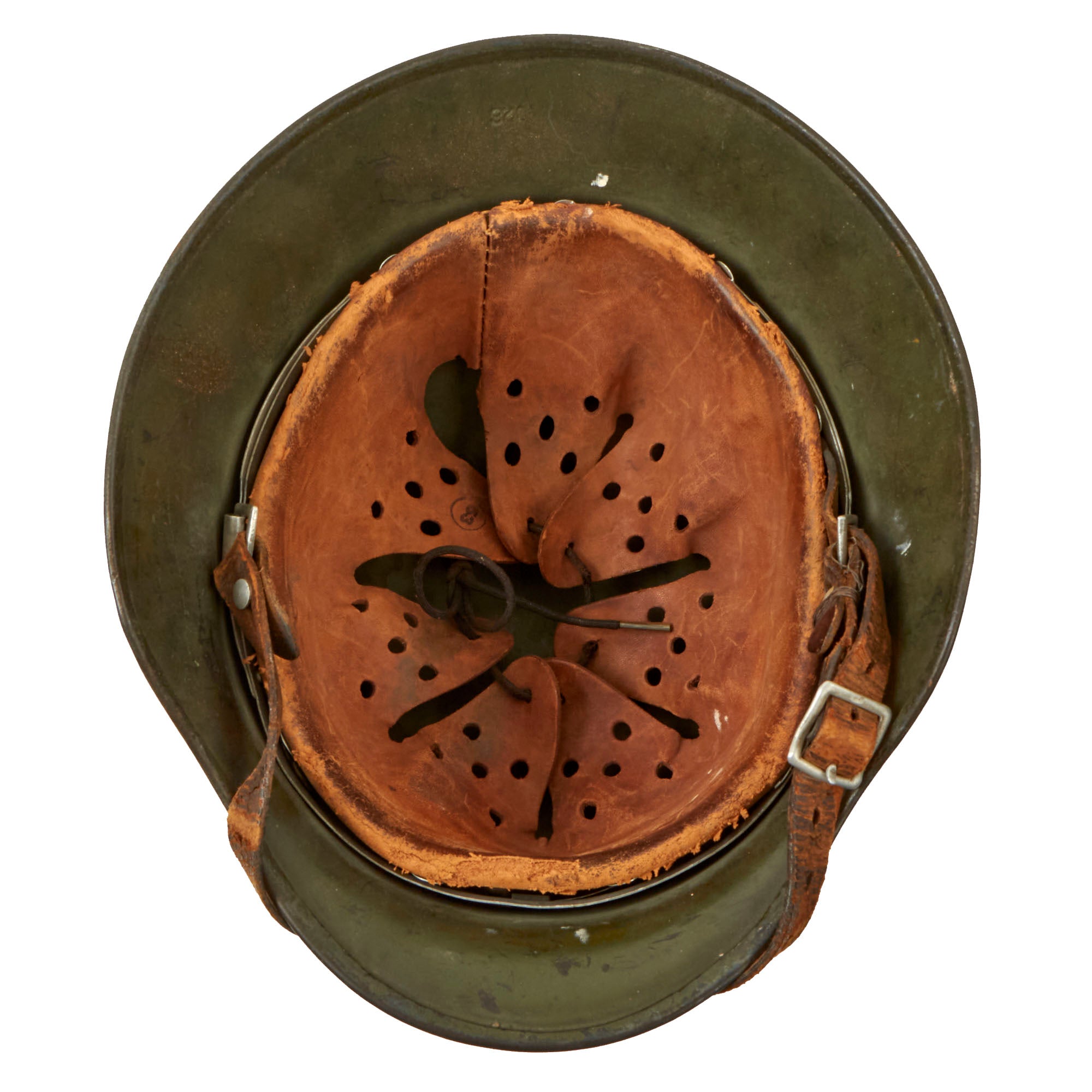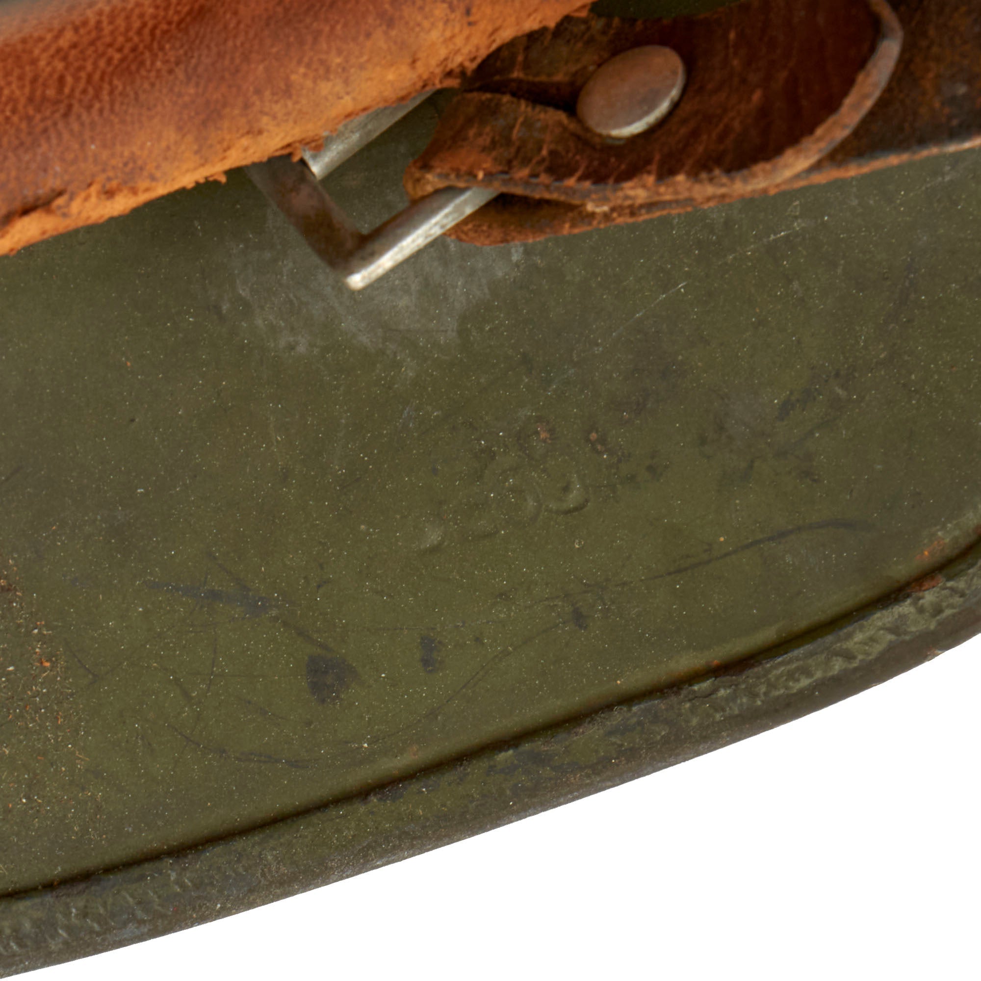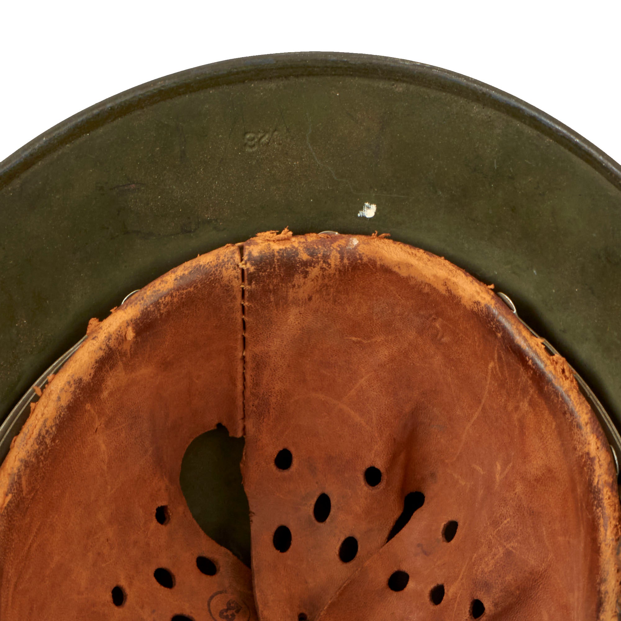 Original Item: Only One Available. This is a very good condition all original example of a German WWII M35 helmet shell, as issued to the Heer (Army), produced with very desirable "Double Decals". It definitely has some characteristics we haven't really seen before, and definitely looks to have led and interesting life. This stamped sheet steel construction helmet still retains much of the early war smooth Apfel-grün (apple green) paint on the exterior, however in areas where it is scratched away, we can actually see what looks to be Luftwaffe Fliegerblau (flyer's blue) smooth paint. We assume that as such a small size helmet, it may have painted but never completed at the factory, and then when an extra small Heer Army helmet was requested, it was repainted and out fit for issue.