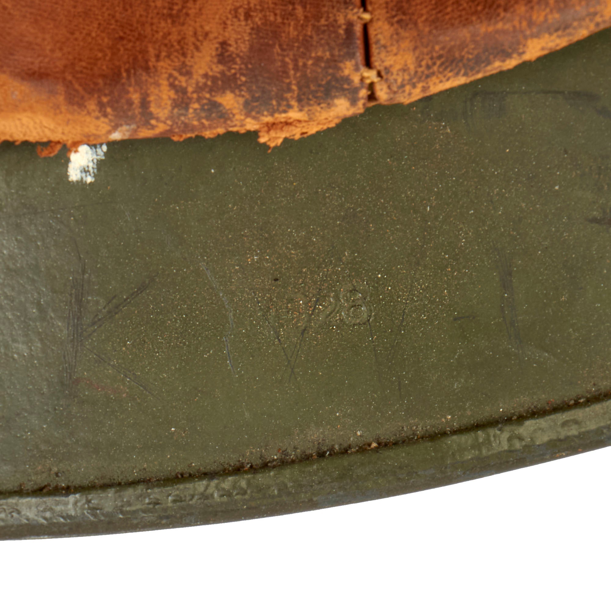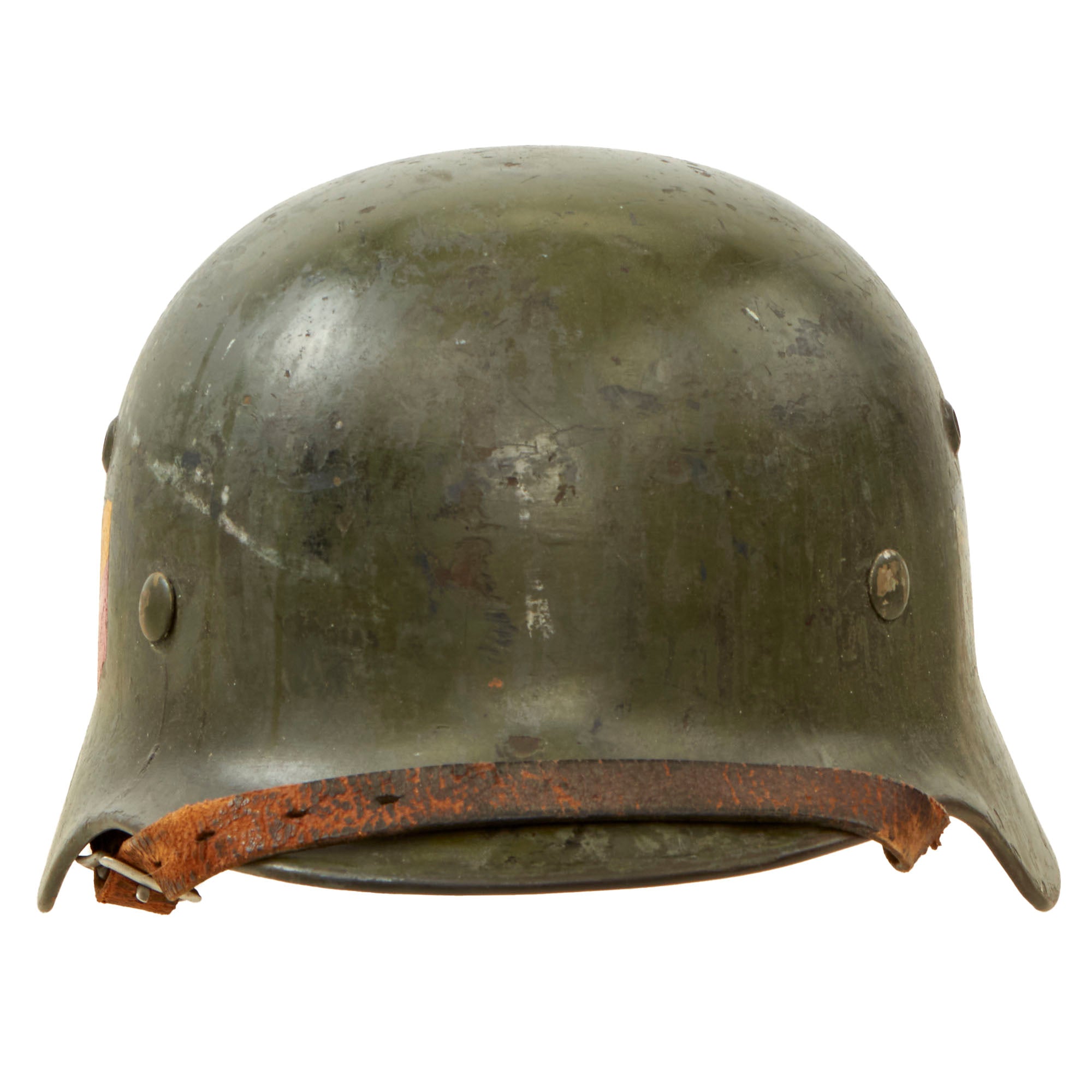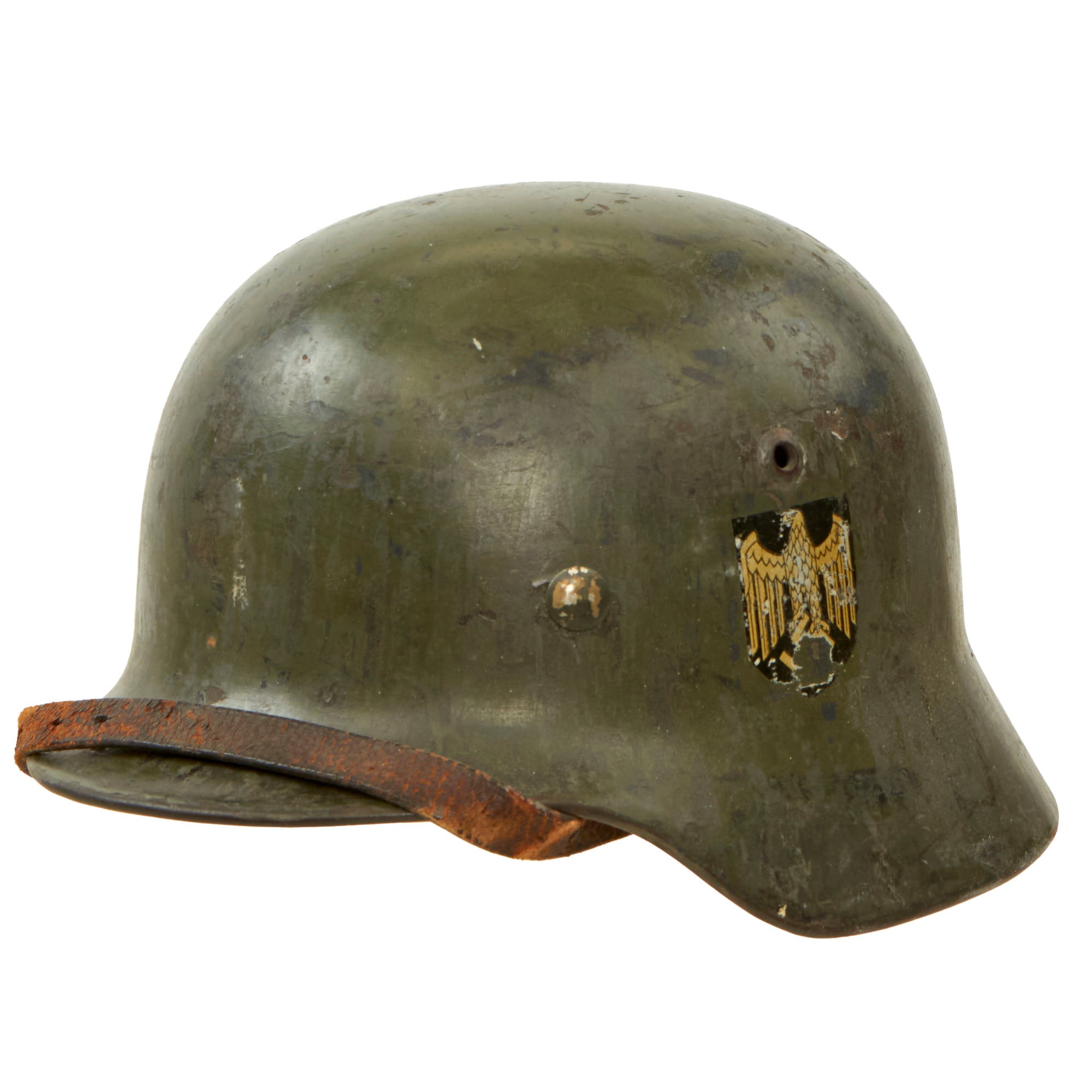 Original Item: Only One Available. This is a very good condition all original example of a German WWII M35 helmet shell, as issued to the Heer (Army), produced with very desirable "Double Decals". It definitely has some characteristics we haven't really seen before, and definitely looks to have led and interesting life. This stamped sheet steel construction helmet still retains much of the early war smooth Apfel-grün (apple green) paint on the exterior, however in areas where it is scratched away, we can actually see what looks to be Luftwaffe Fliegerblau (flyer's blue) smooth paint. We assume that as such a small size helmet, it may have painted but never completed at the factory, and then when an extra small Heer Army helmet was requested, it was repainted and out fit for issue.