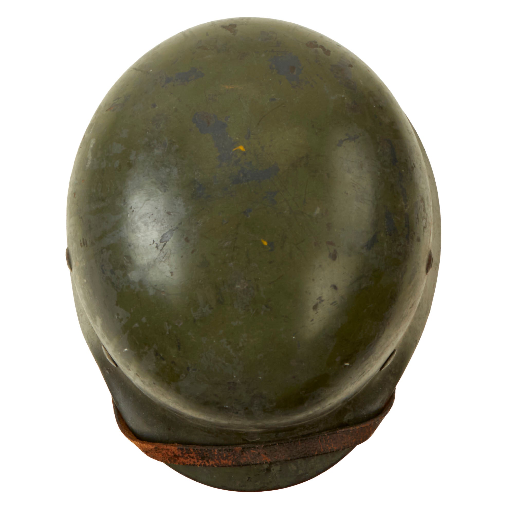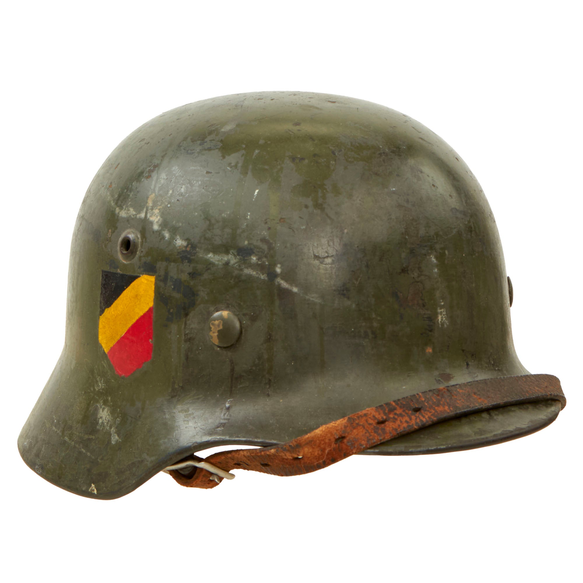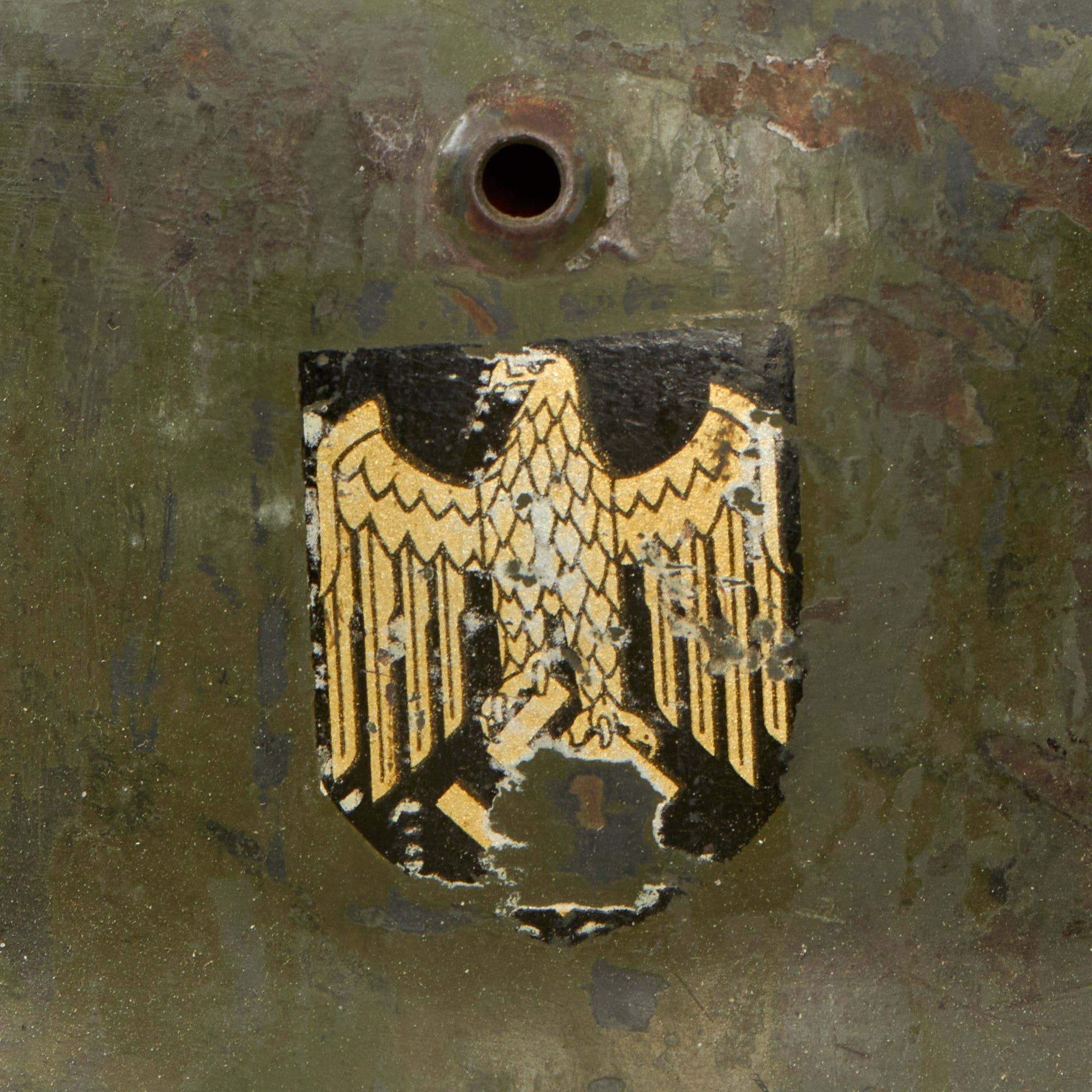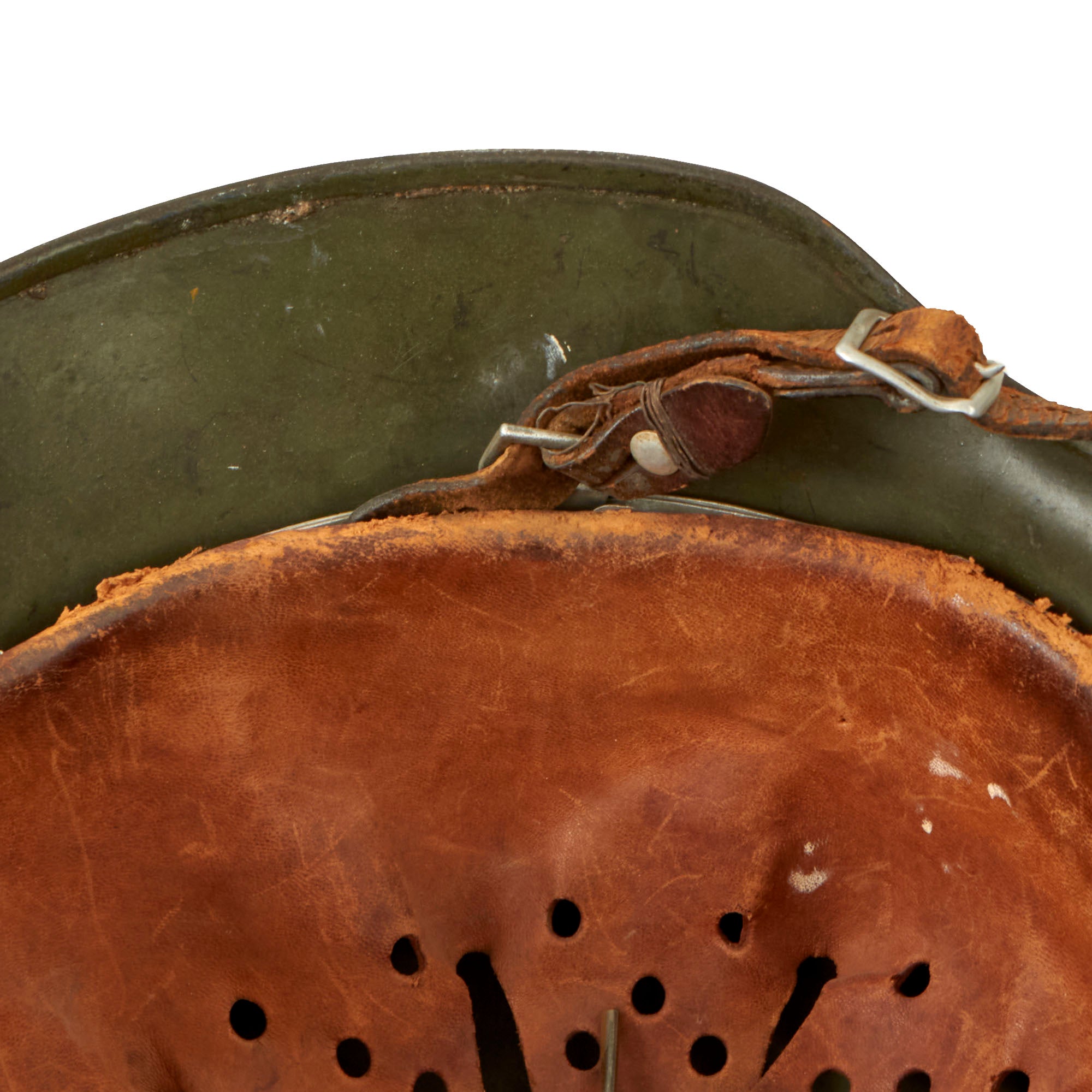 Original Item: Only One Available. This is a very good condition all original example of a German WWII M35 helmet shell, as issued to the Heer (Army), produced with very desirable "Double Decals". It definitely has some characteristics we haven't really seen before, and definitely looks to have led and interesting life. This stamped sheet steel construction helmet still retains much of the early war smooth Apfel-grün (apple green) paint on the exterior, however in areas where it is scratched away, we can actually see what looks to be Luftwaffe Fliegerblau (flyer's blue) smooth paint. We assume that as such a small size helmet, it may have painted but never completed at the factory, and then when an extra small Heer Army helmet was requested, it was repainted and out fit for issue.