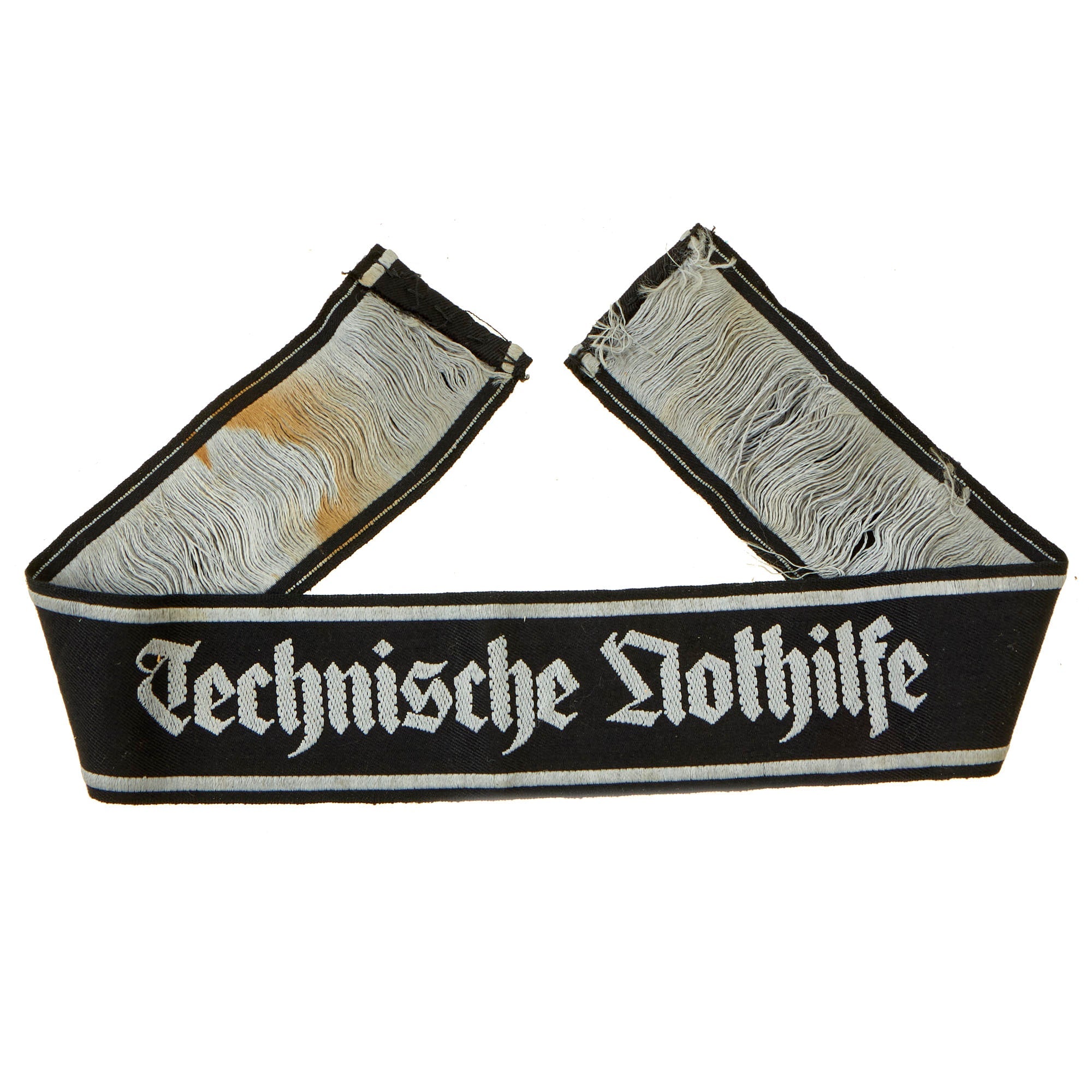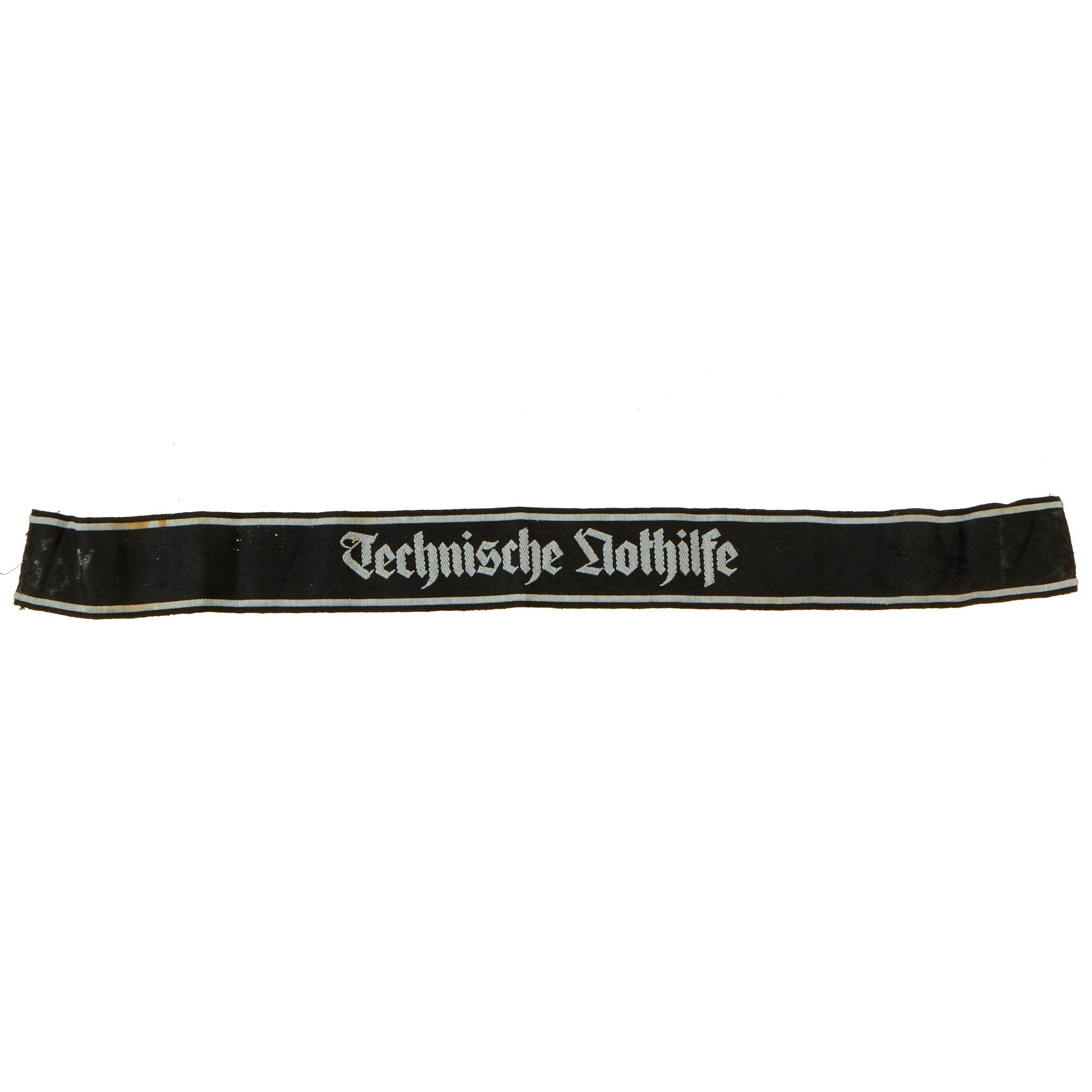 The second item is a Technische Nothilfe (Emergency Technical Assistance or TeNo) BeVo embroidered EM/NCO cuff title, made from a black base with gray machine embroidery. It measures 16 1/2" x 1 1/2", and shows light wear from service, definitely looking to have been attached to a uniform at some point. It shows some staining from water and possibly rust exposure. These were worn by members of the TeNo organization, which was actually established in 1919 as a group of trained, voluntary, civilian personnel. They were used to maintain and repair essential services in the event of a natural disaster or emergency, and included many former service members. Later the organization was folded under the NSDAP umbrella, and these cuff titles were worn by members attached to military units.