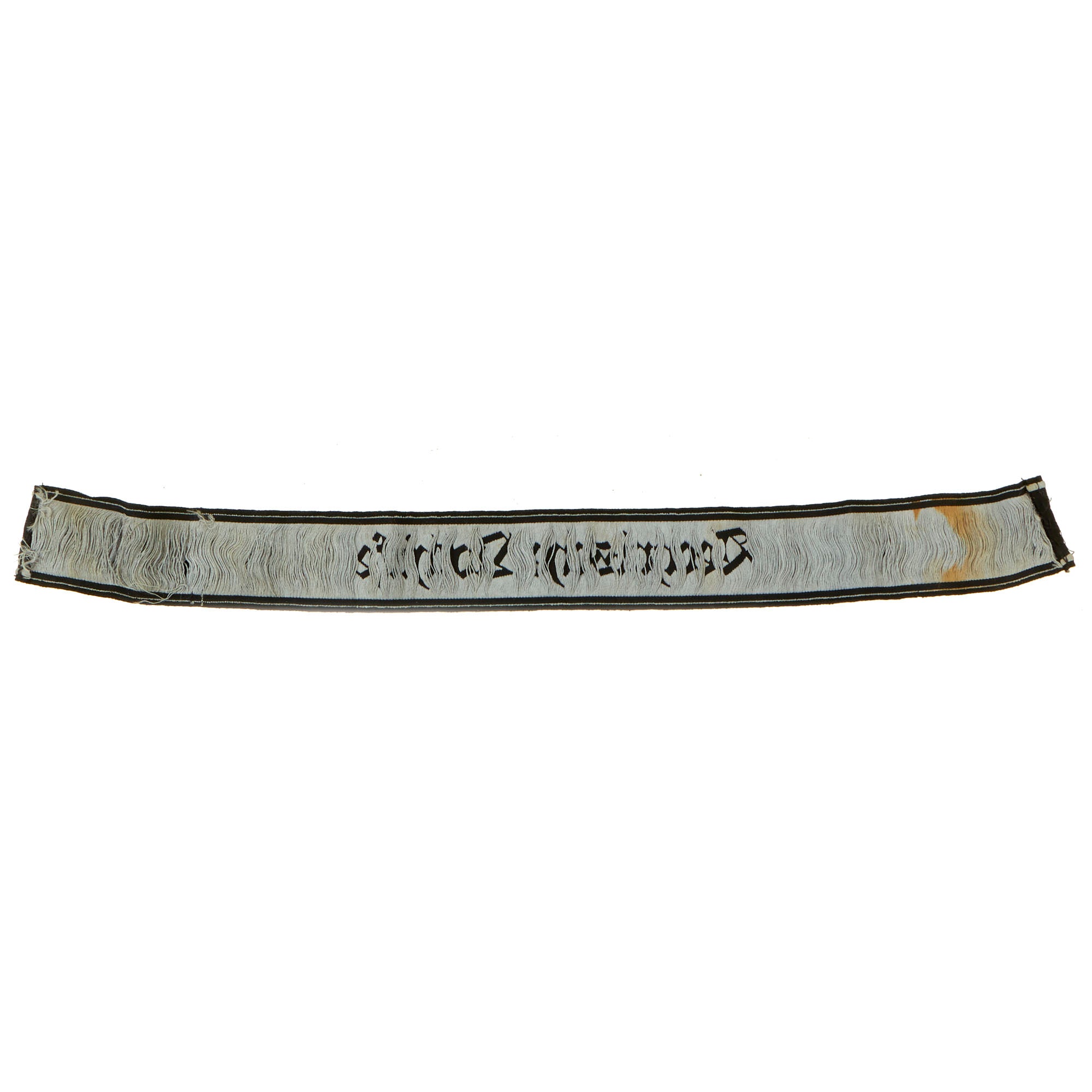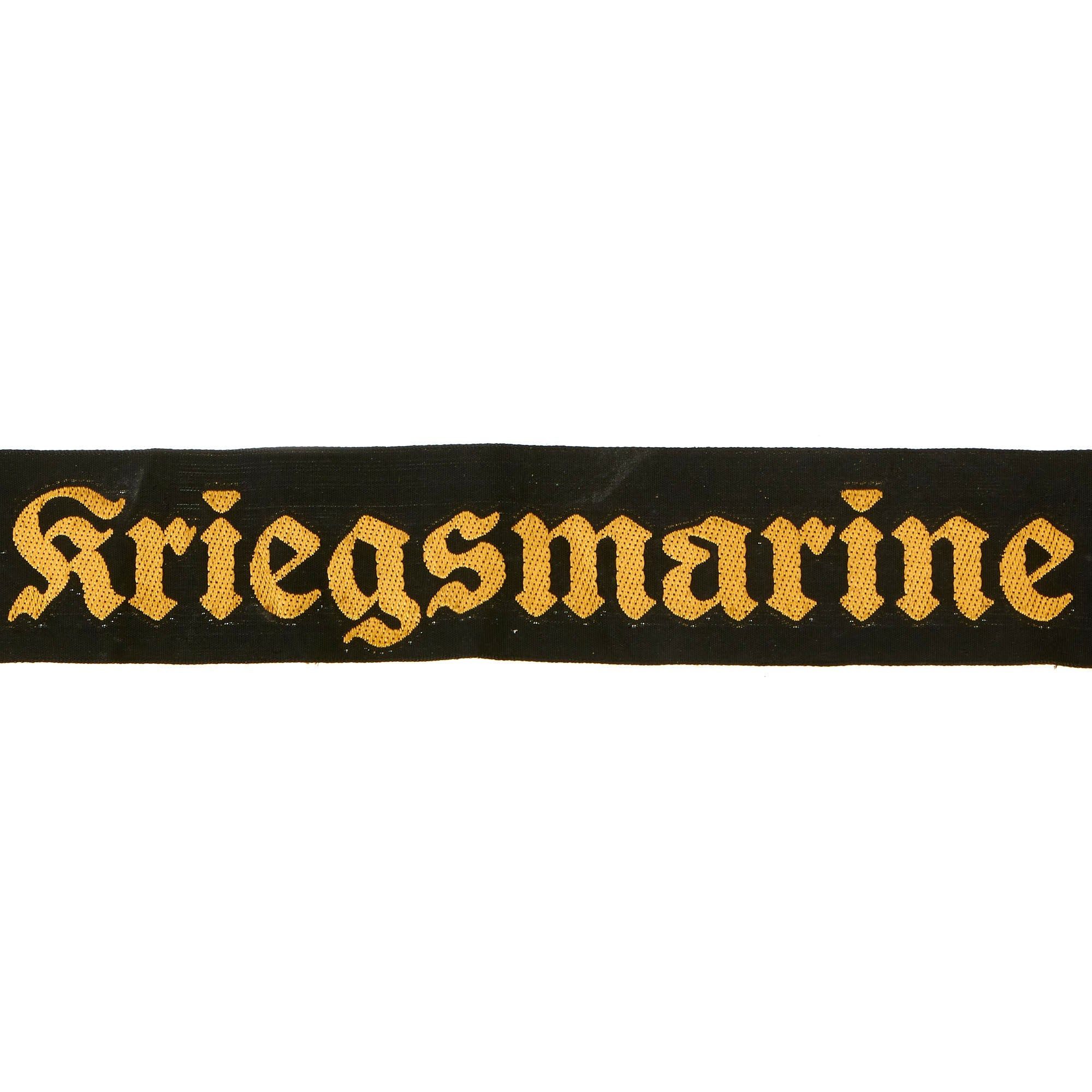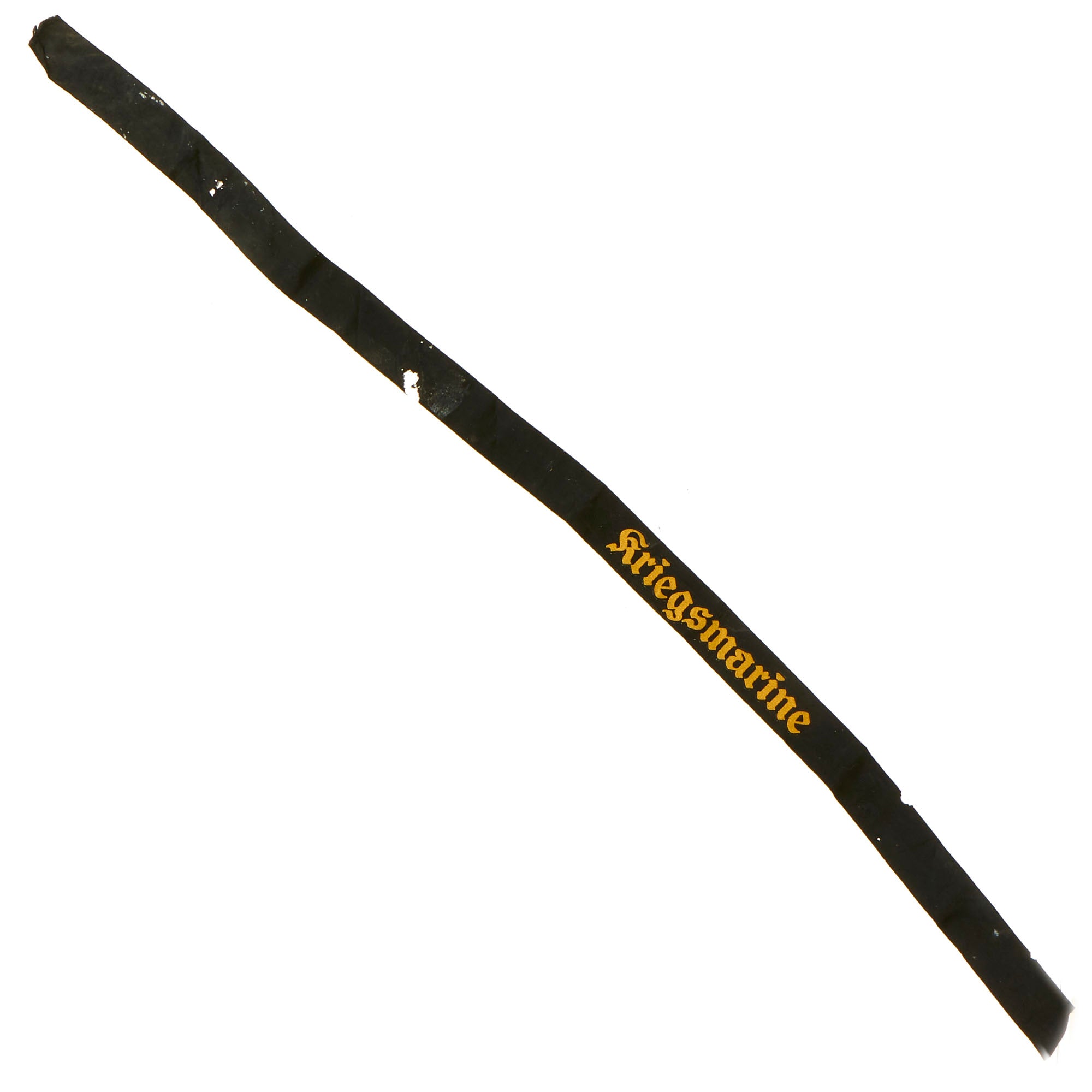 The last item is a very nice service used Kriegsmarine cap tally, which measures 34" x 1 1/4", looking to be made of black silk or rayon, with gold BeVo machine embroidery. There were work around the Kriegsmarine Navy "Donald Duck" caps, and would be secured at the back by thread loops. This example is in good condition, showing some missing material and wear from service.