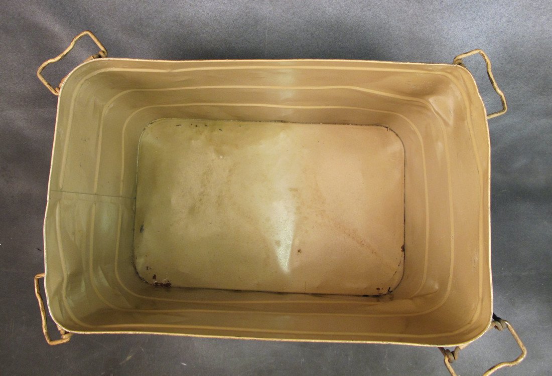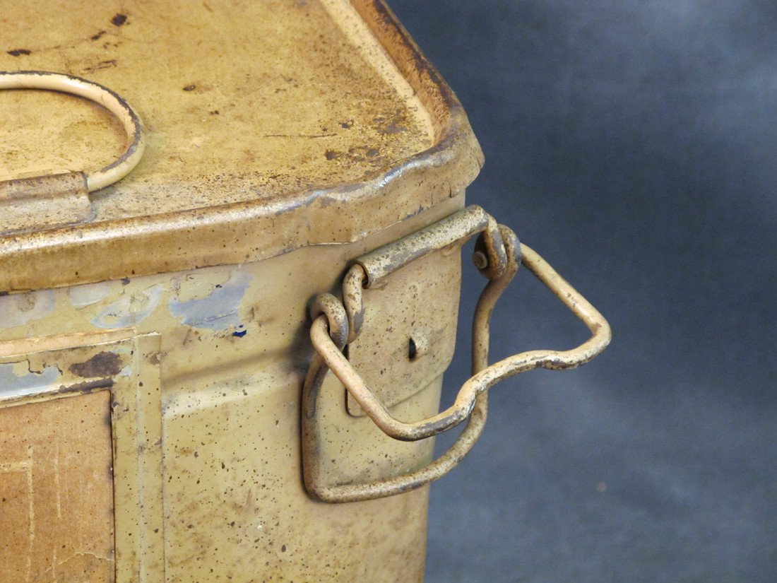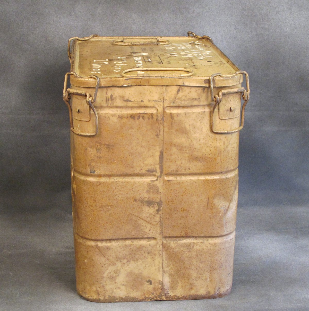 The sand colored (Gelbbraun) Can, with several dents and dings from shipping and handling over the years measures:- 17" X 12" X 19" and has four locking brackets (complete & functional) one at each corner.