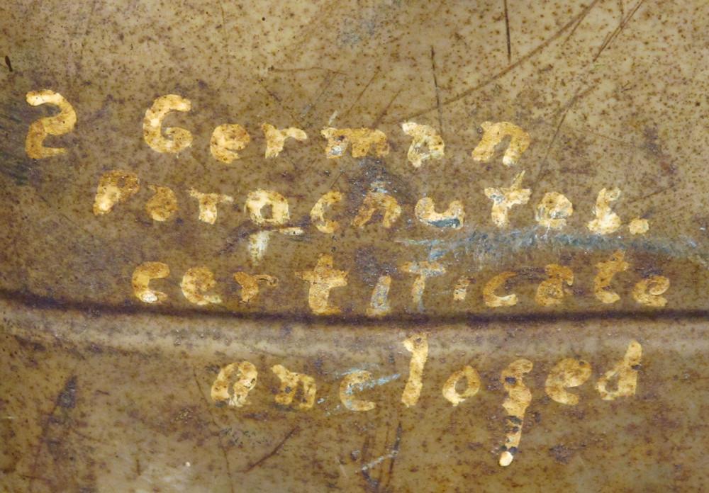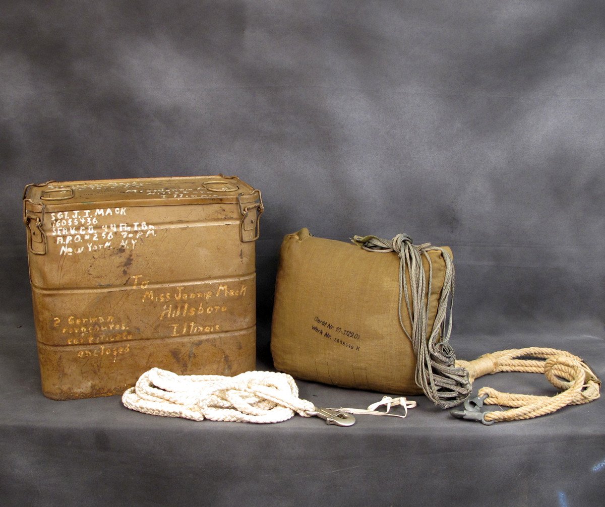 Well, there you have it, an Original German Paratrooper's Parachute, marked and unissued, in it's original marked and coded Transit Can. Additionally bearing the name of the G.I who mailed this back during WW2, probably to his Sister, (being a "Miss"). Perhaps most interesting from a "personal history" point of view is the "declaration" stating just two parachutes were enclosed. One wonders what other War Booty came home inside this bundle silver, gems or other looted treasure? Who knows.