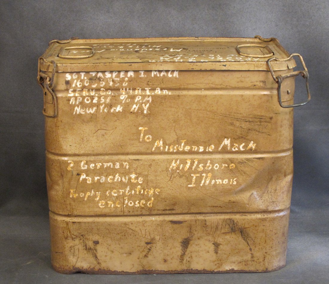 On each of the two larger sides of the Can we find these addresses repeated and a listing of contents: "2 German Parachutes, Trophy Certificate enclosed".