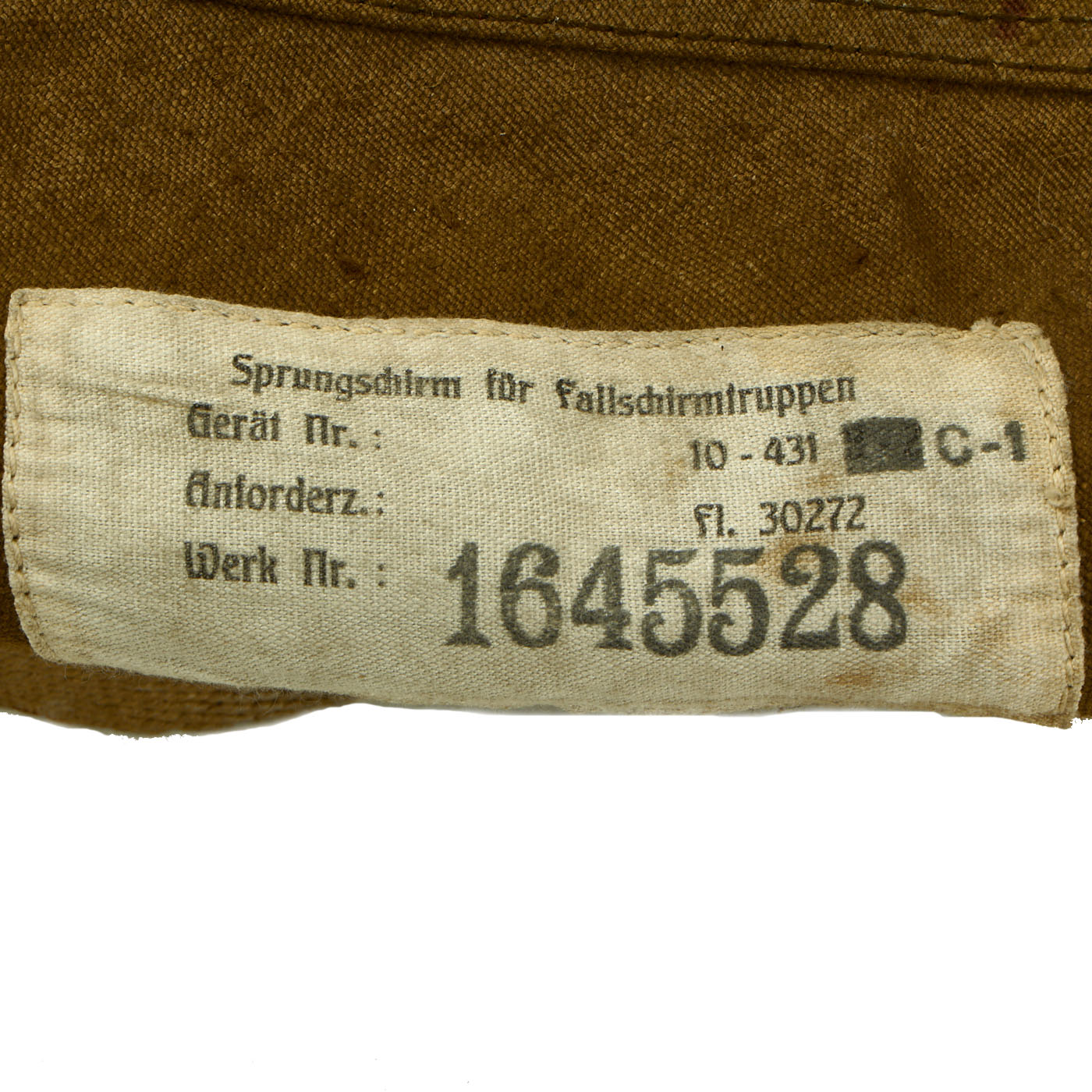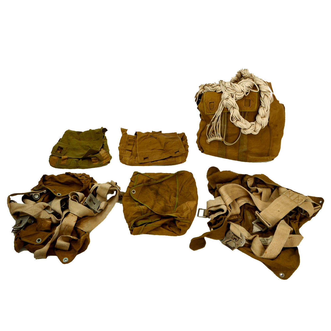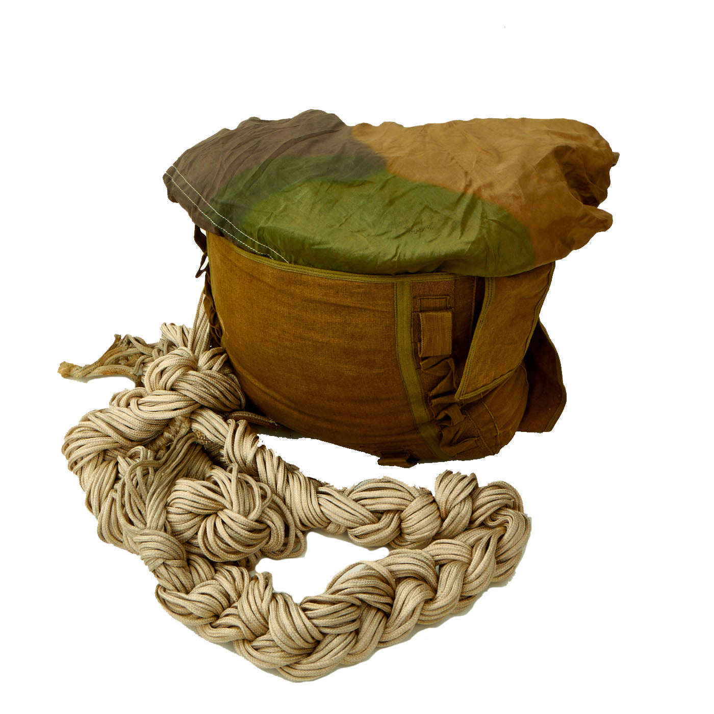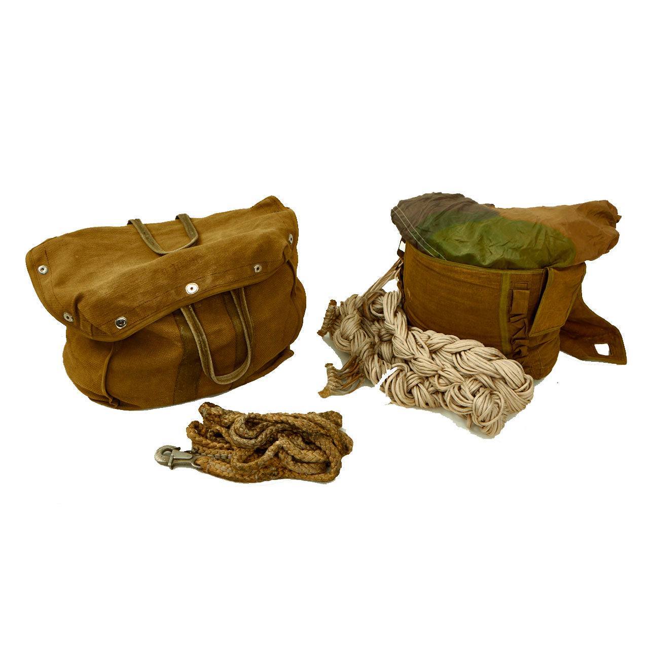 Original Item: Only One Available. This is a totally original German WWII RZ36 Delta Shaped Paratrooper parachute that includes a triangle cap camouflage silk canopy, transit bag, 2 harnesses and 3 smaller bags. This model is a rare Delta-shaped model, featuring an RZ36 canopy. The shroud lines appear complete.