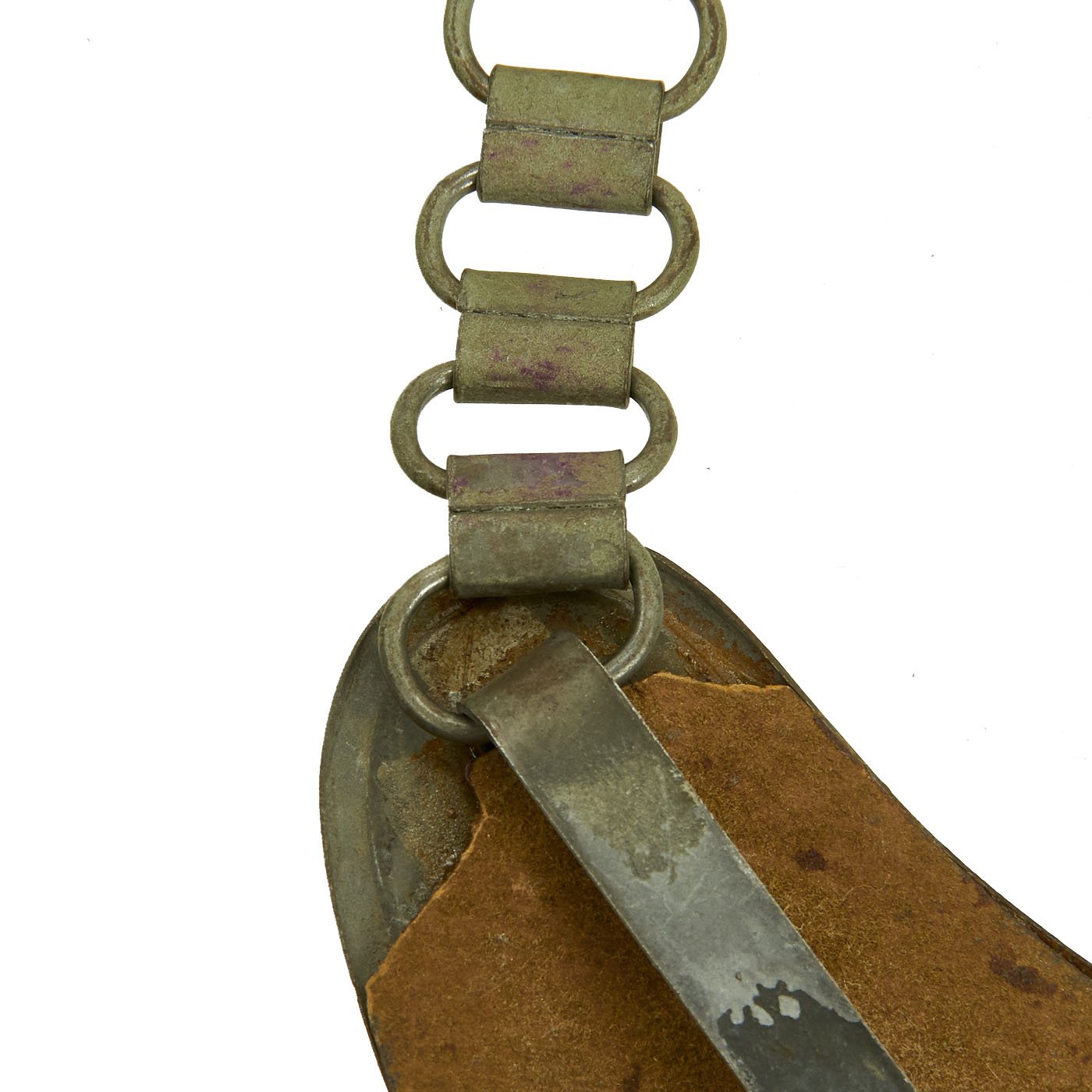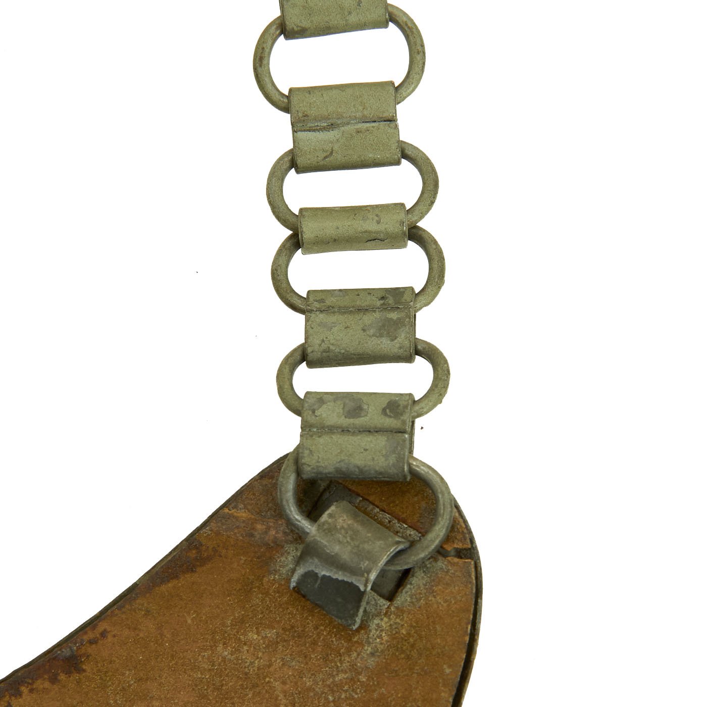 These were hung around the neck, and have two hooks on the back so it hangs in the center or to the side. It is in excellent condition and the phosphorescent paint still glows in the dark for hours after exposure to light (it's not radium paint, this piece measures a "normal" .16 reading on the Geiger counter). Features the original cardboard backing and complete functional neck chain. The aluminized paint on the gorget and chain is mostly intact, and there is only a small amount of rust. A very nice example!