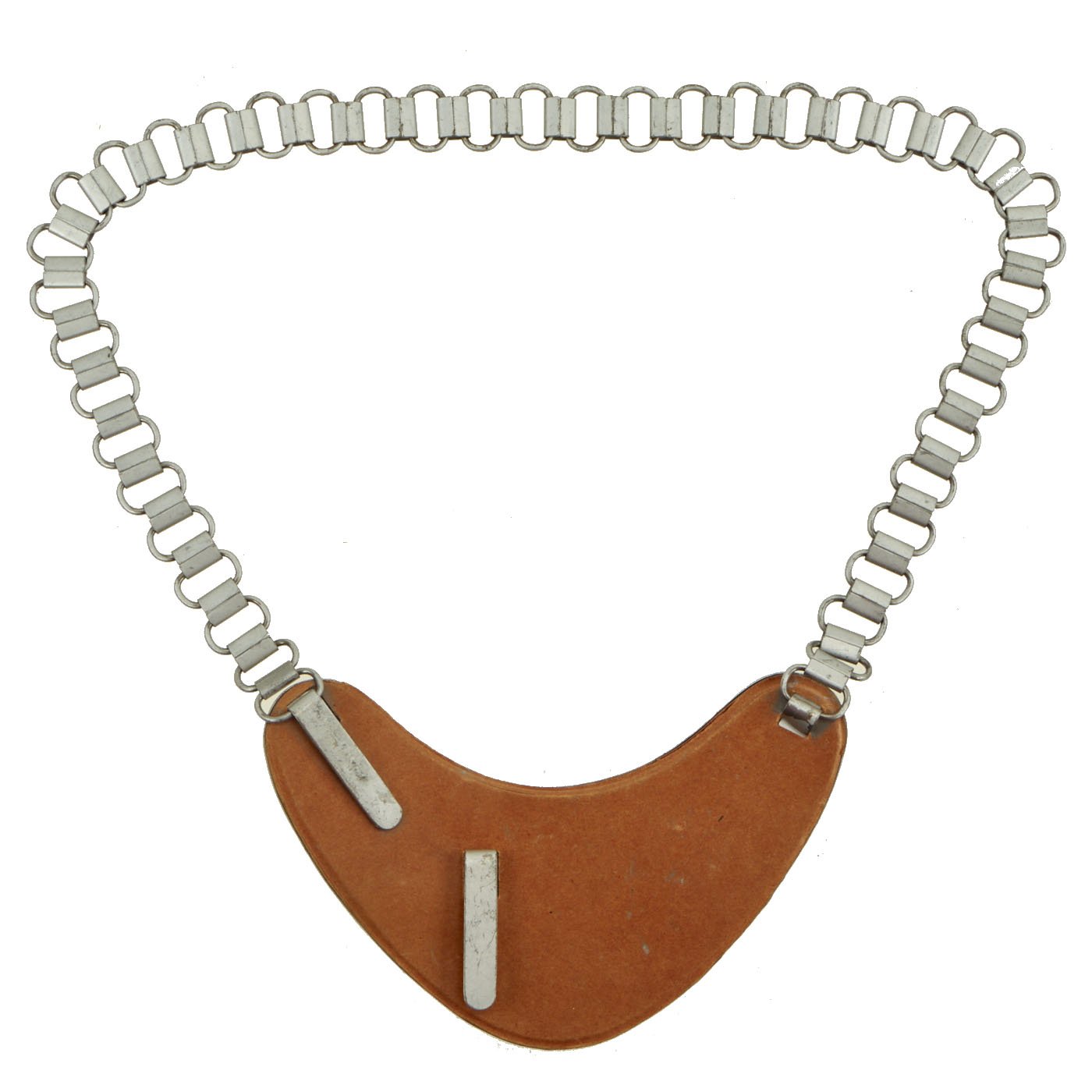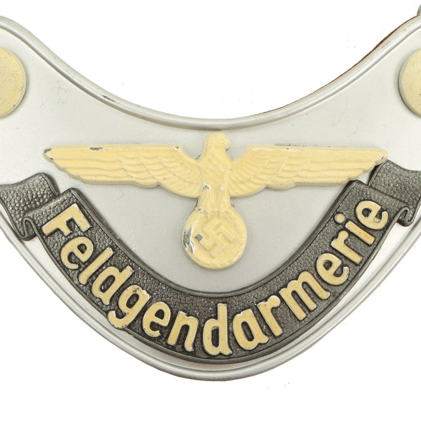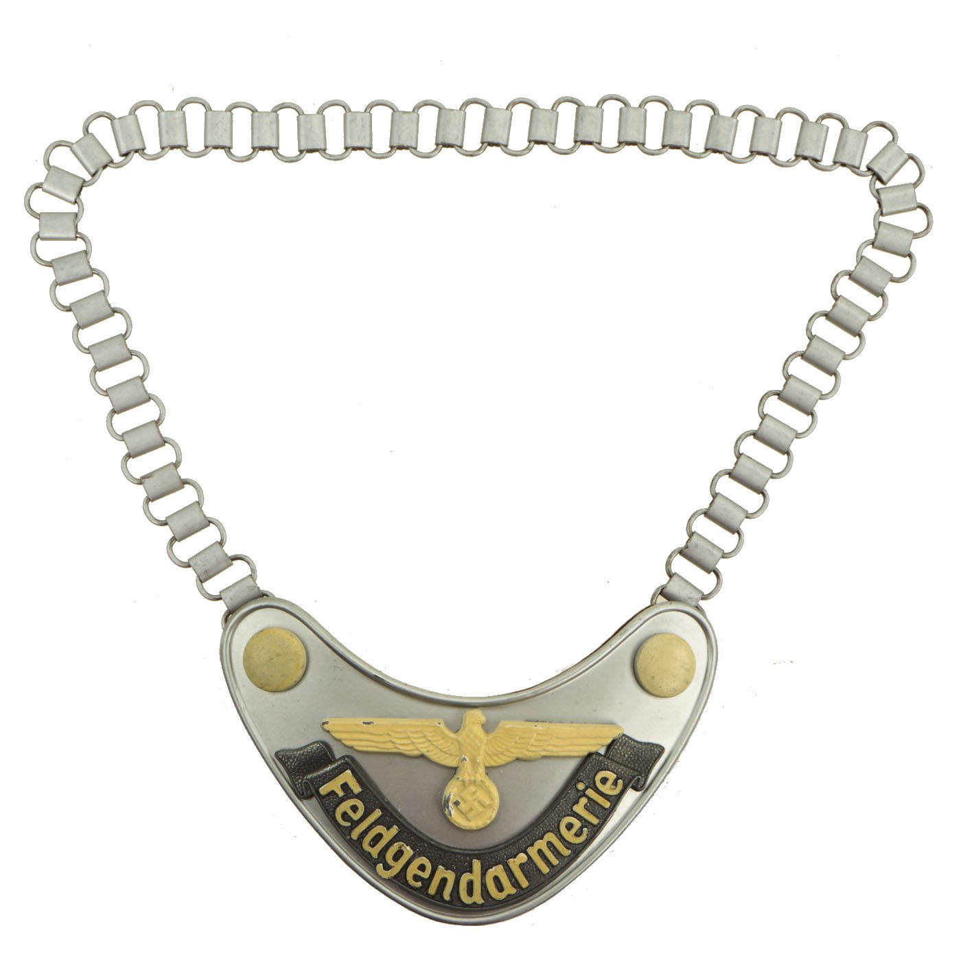 This is a very nice example of a Third Reich Feldgendarmerie gorget, made of stamped aluminized steel, with the correct aluminized steel chain. There are no maker markings, common for later war production, and it has a pressed paper backing to cover the back of the split pins. This is still in great shape, with no deformation. The front eagle has however lost separated from the bent pin retainer on the left side.