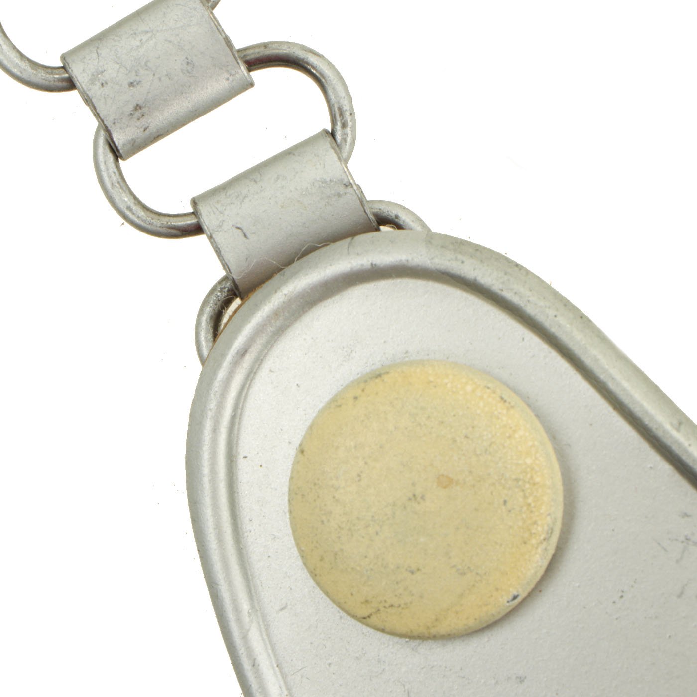 These were hung around the neck, and have two hooks on the back so it hangs in the center or to the side. It is in very good condition and the phosphorescent paint still glows in the dark for hours after exposure to light (it's not radium paint, this piece measures a "normal" .16 reading on the Geiger counter). A very nice example with great original paint and a complete neck chain!