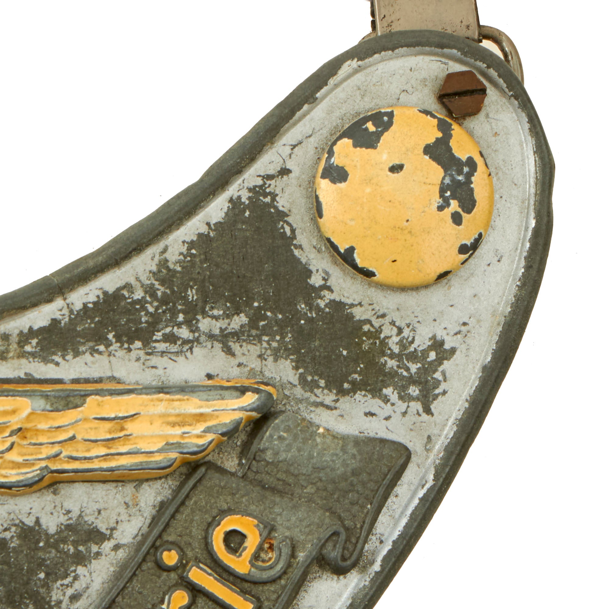 This is a very nice service used example of a Third Reich Feldgendarmerie gorget, made of stamped aluminized alloy with hooks on the back, and has the correct aluminized chain, which is weakly magnetic. There are no maker markings, common for later war production, and it has a pressed paper backing to cover the back of the split pins. The backing is still in very good shape, however the gorget itself definitely shows some bending to the material, and overall oxidation on the front, back, and on the chain as well.