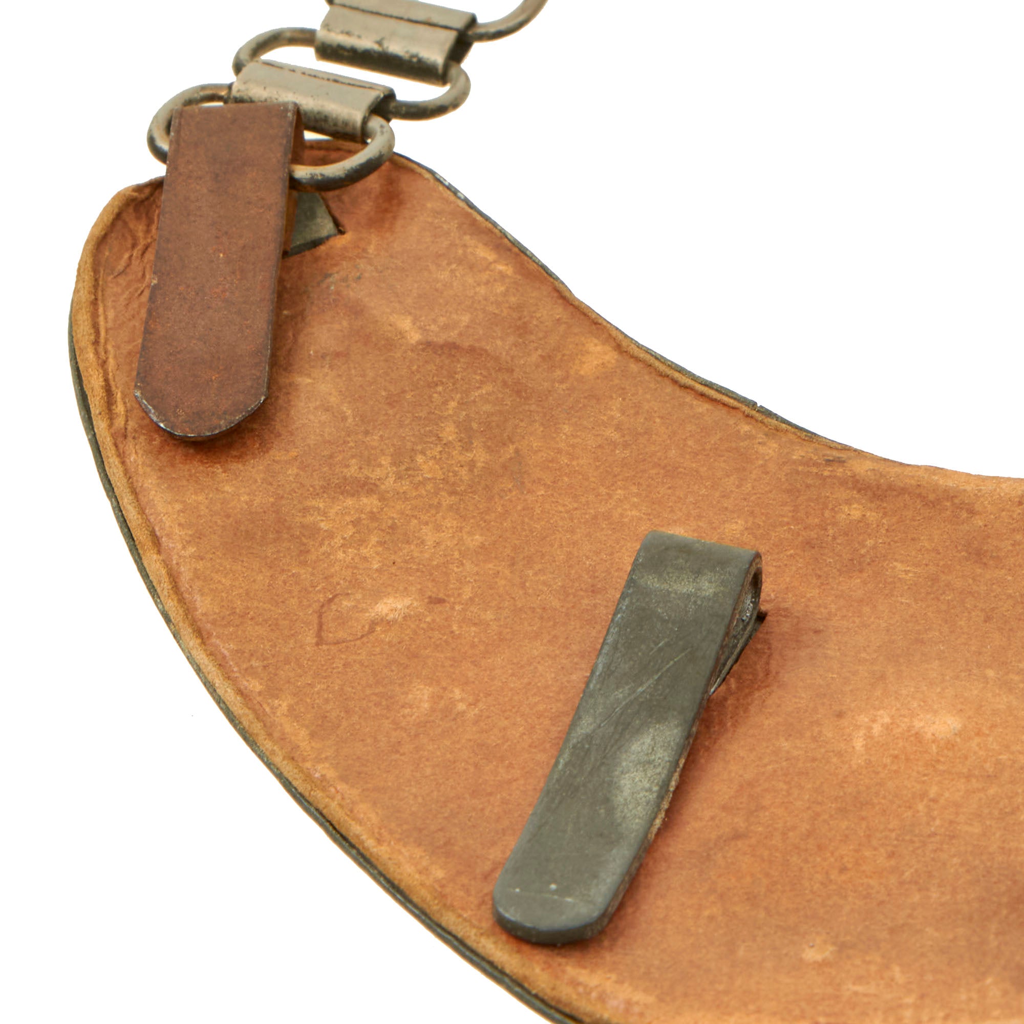 These were hung around the neck, and have two hooks on the back so it hangs in the center or to the side, depending on the situation. The chain is a bit worn but is complete, and the hooks on the back are all intact as well, though one was definitely replaced during the WWII period with a steel hook after the original alloy hook broke off.