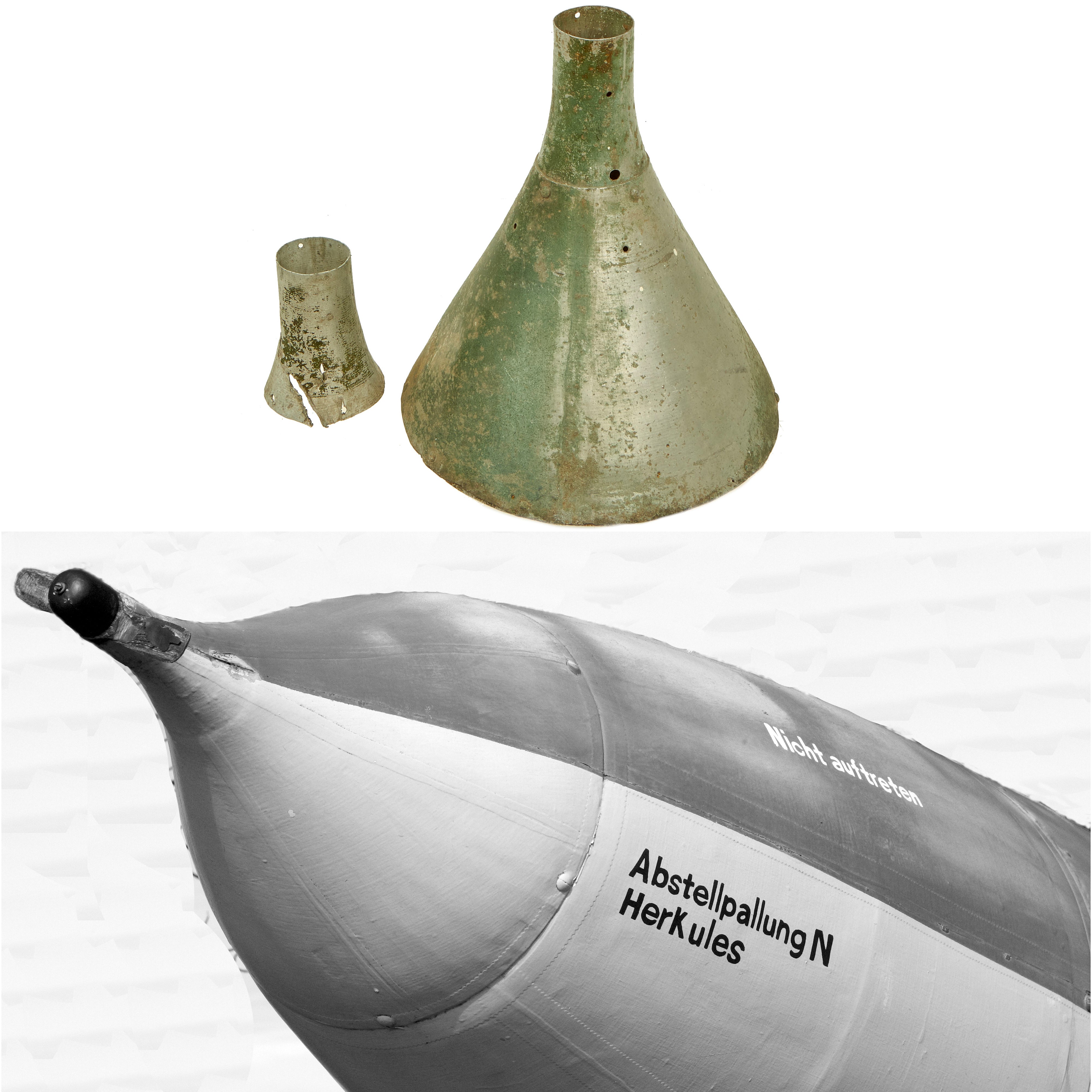 Original Item: Only One Available. This is an extremely rare piece of ordnance history. This nose cone appears to have been recovered from a V-1 Flying Bomb that was either never completely assembled or was removed from one. With that being said, this is in considerably phenomenal condition! The smaller cone like item is another component from a V-1, the very point of the cone that the small prop would have been attached to.