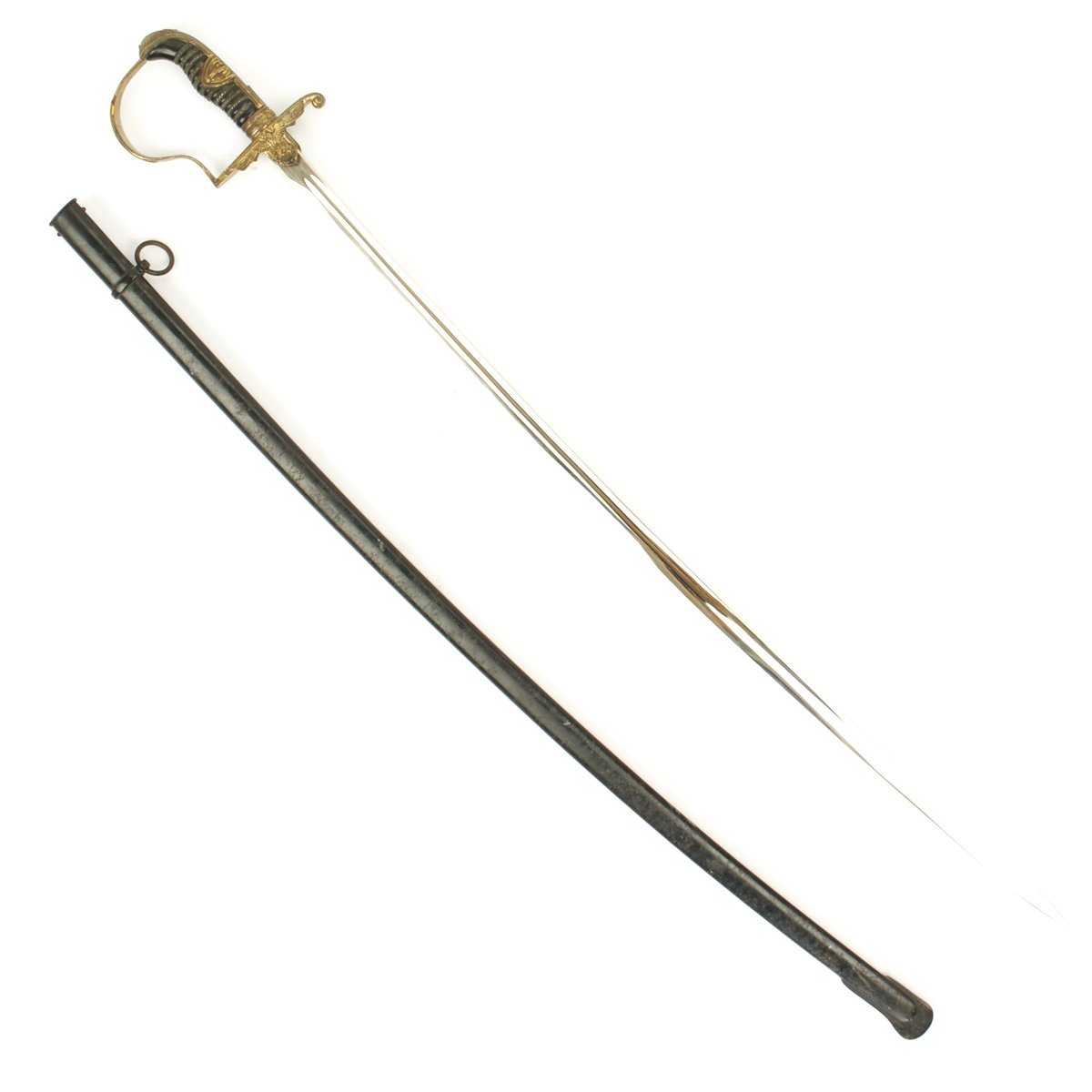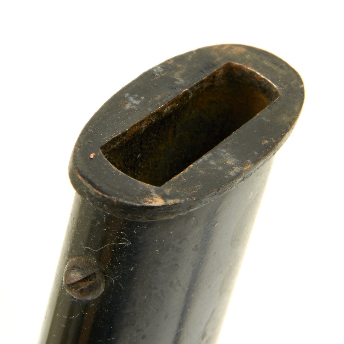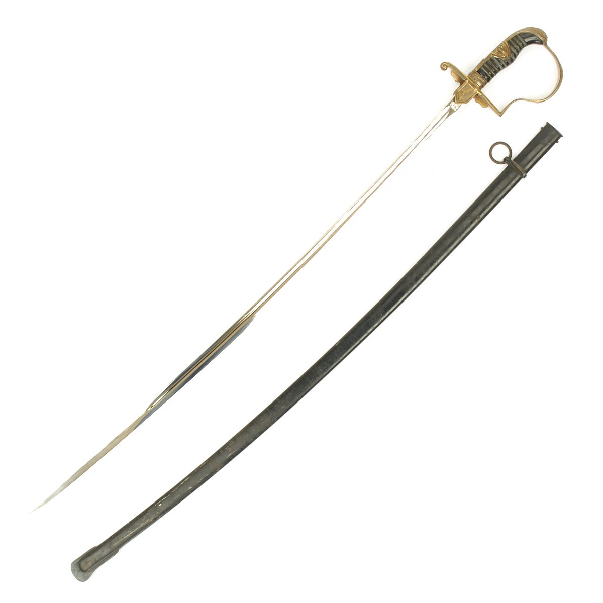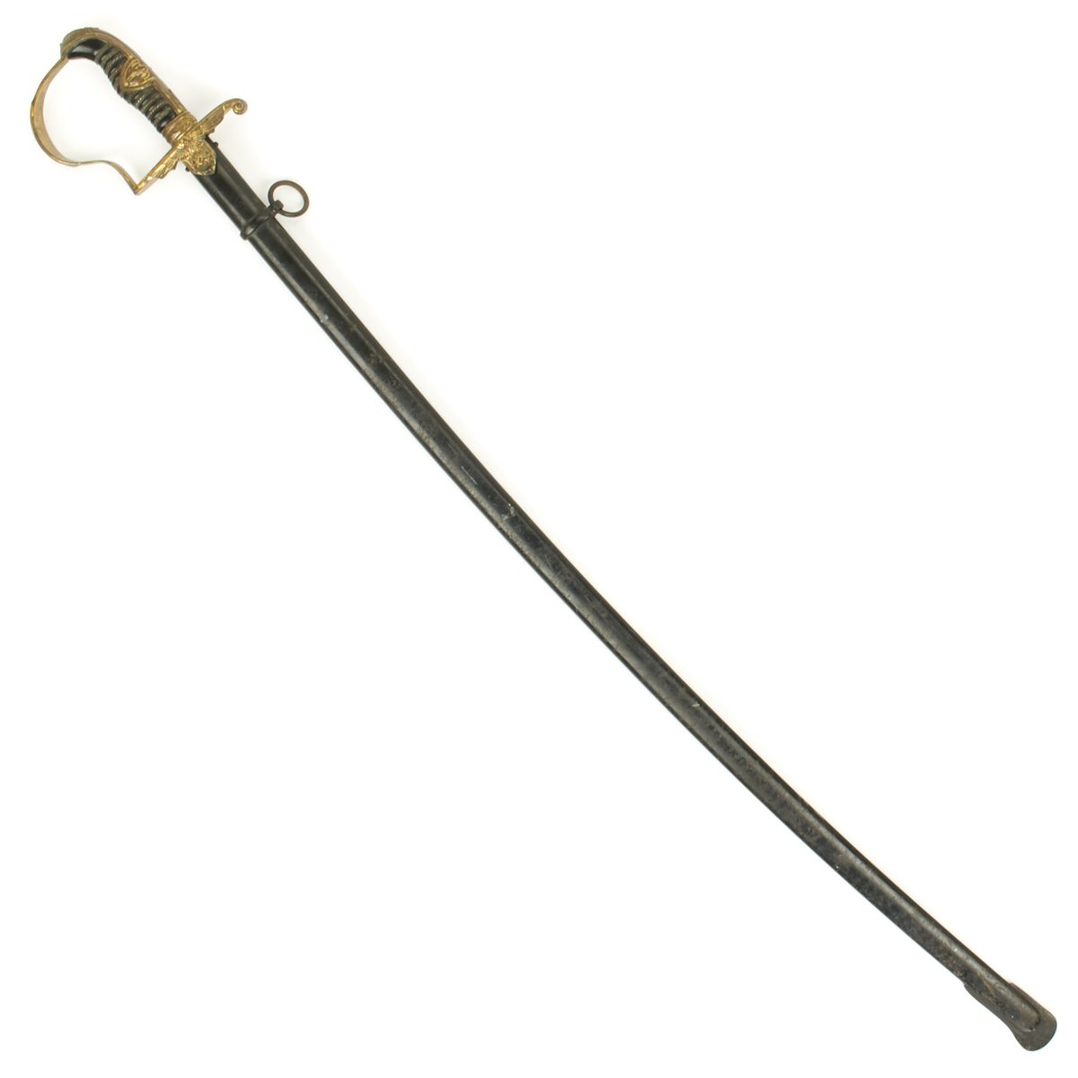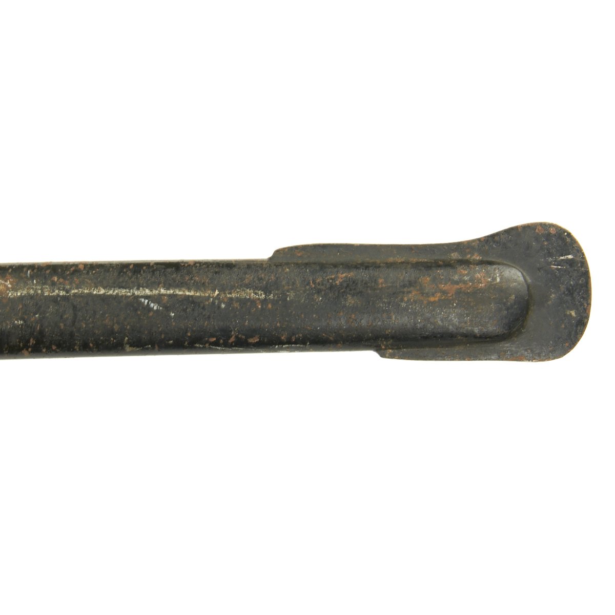 The scabbard of this example is in very good condition, having the original black paint present. This black paint is 85% throughout and still has a bright finish towards the top. Most of the body has some degree of finish checking and lifting, and the expected wear of age.