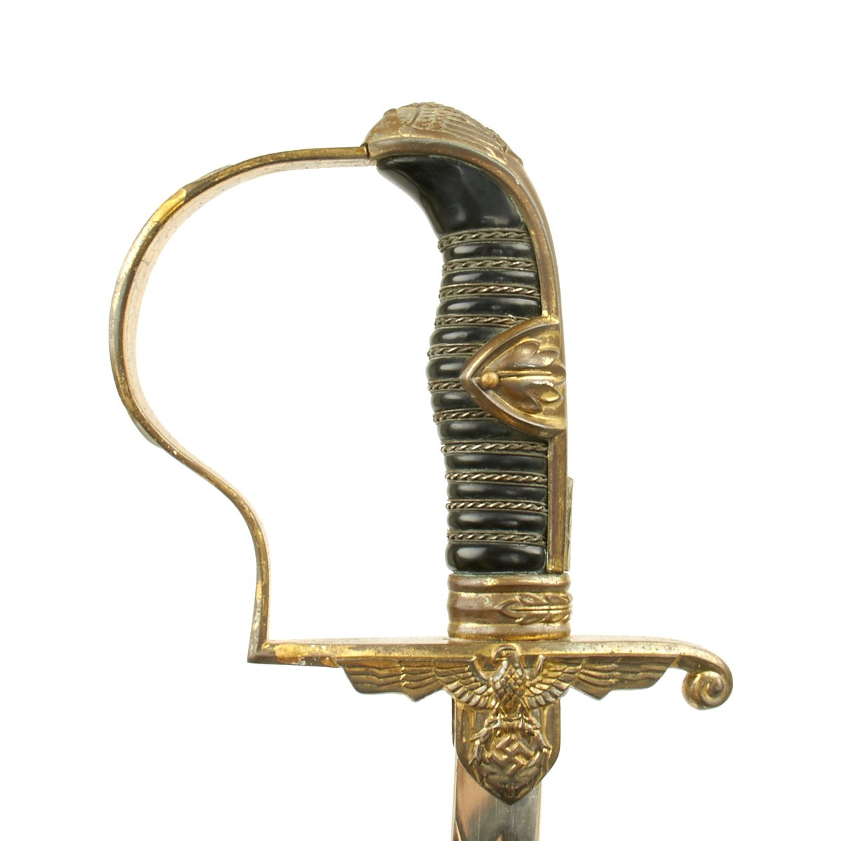 The hilt of the sword has areas of beautiful gilt over brass alloy base metal. This combination of hilt metals was sometimes susceptible to plating loss, and unfortunately only around 40% of the gilding remains. The Prince Eugen design features a less ornate pommel than many others, with simple leaf designs, back strap, "p"-guard and ferrule. The cross guard has an "SS-Style" open-winged eagle which looks to the viewer's left. This art-deco eagle has fine crispness to his eye, breast feathering and raised out swas within a wreath.