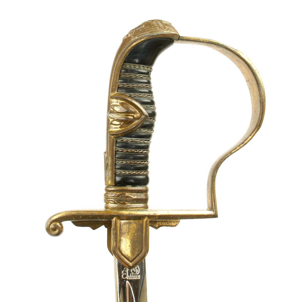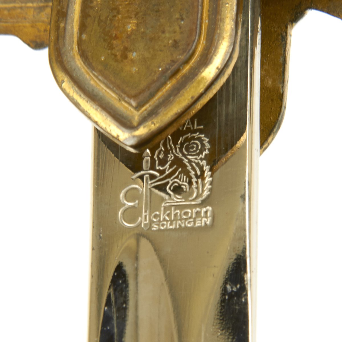 The blade on this sword is an incredible example. It measures 32 inches and has the highest quality nickel plating. This plating is completely mirror bright with only a few spots of wear. The reverse ricasso is stamped with the 1935-41 ORIGINAL EICKHORN SOLINGEN squirrel logo. The original red bakelite washer is in place.