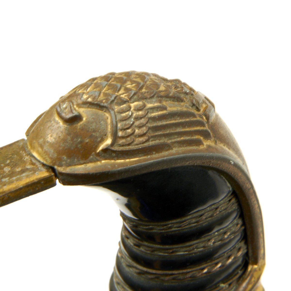 The black bakelite grip is tightly wrapped with triple brass wire, the center being twisted. There is a crack near the pommel on the grip, but otherwise it it is intact and in great shape.