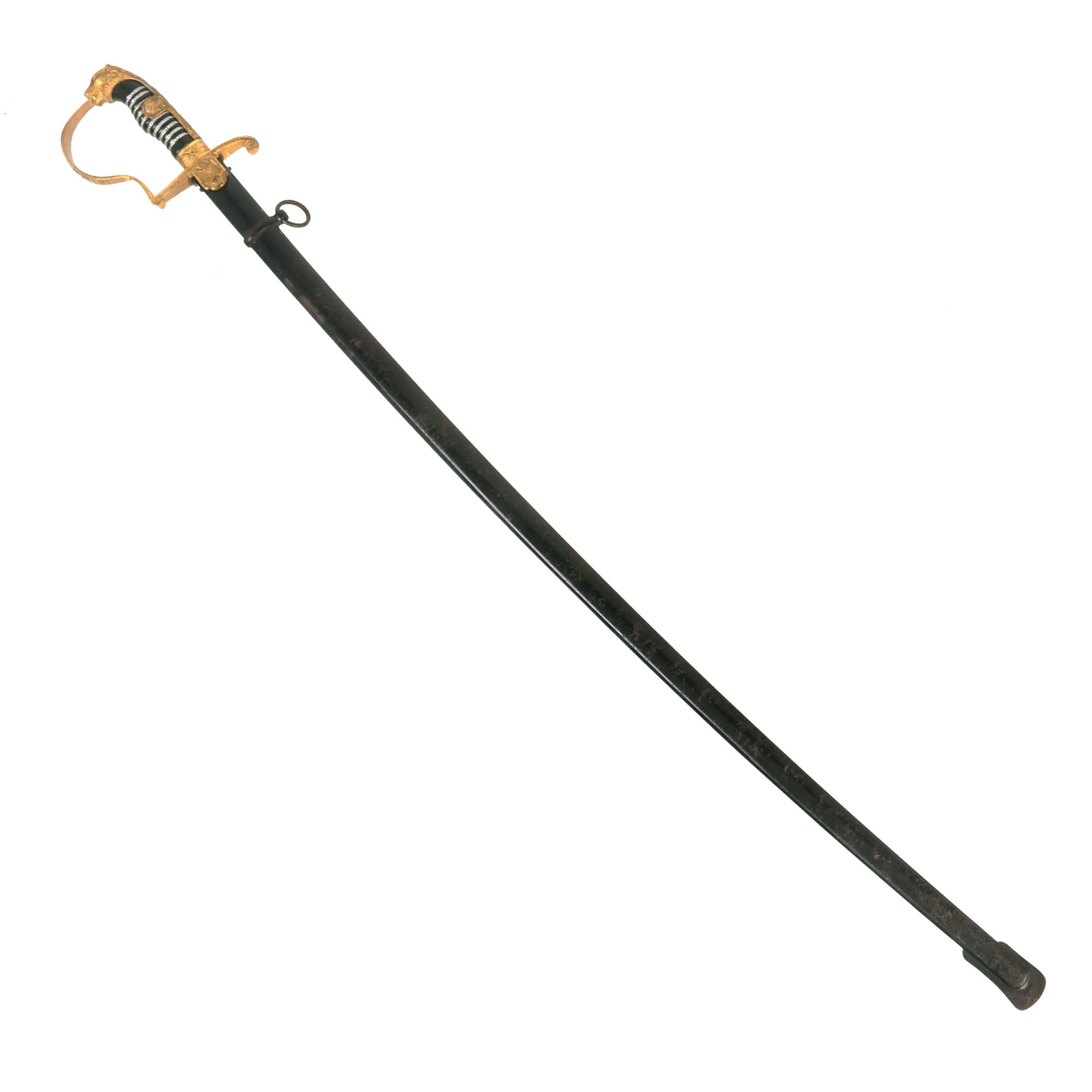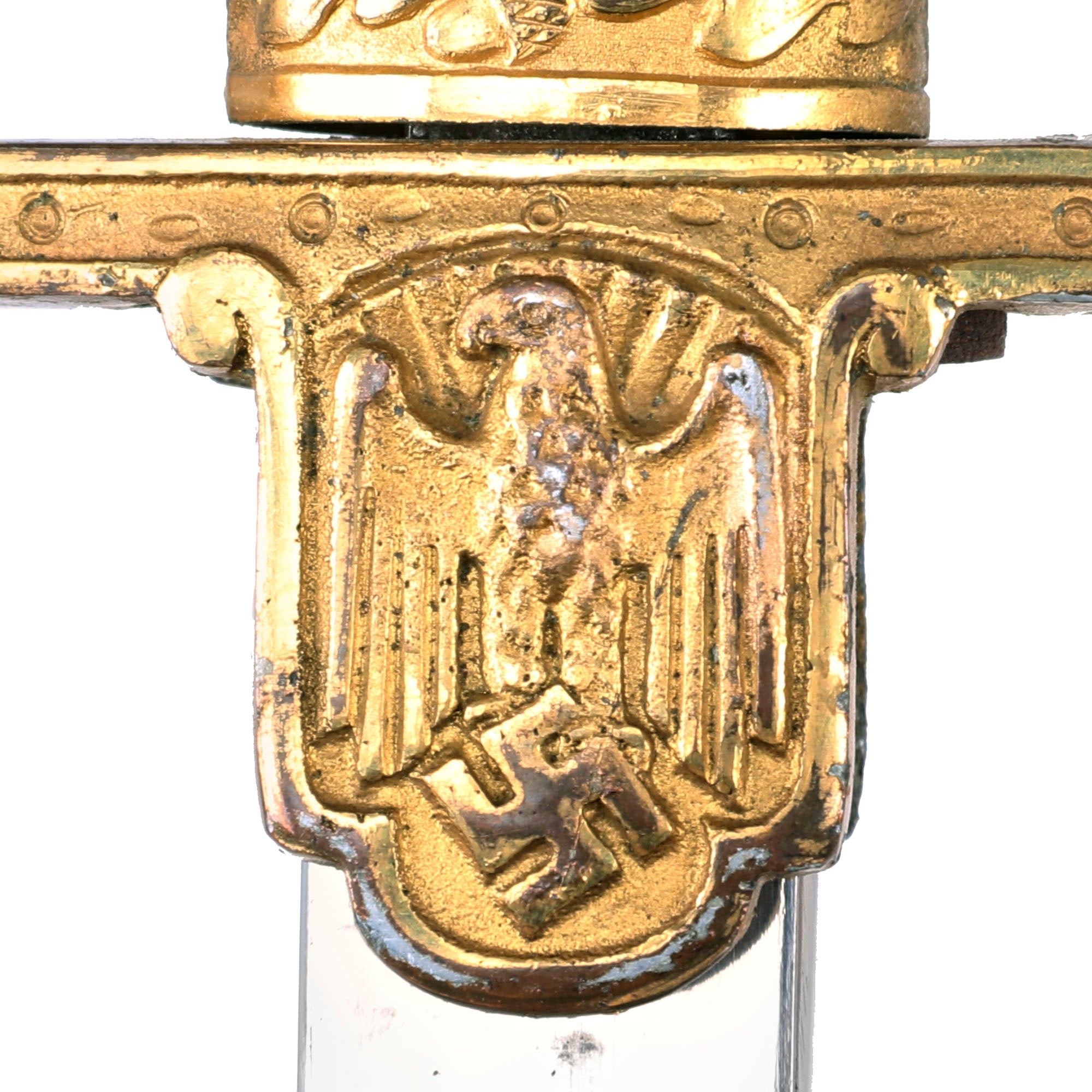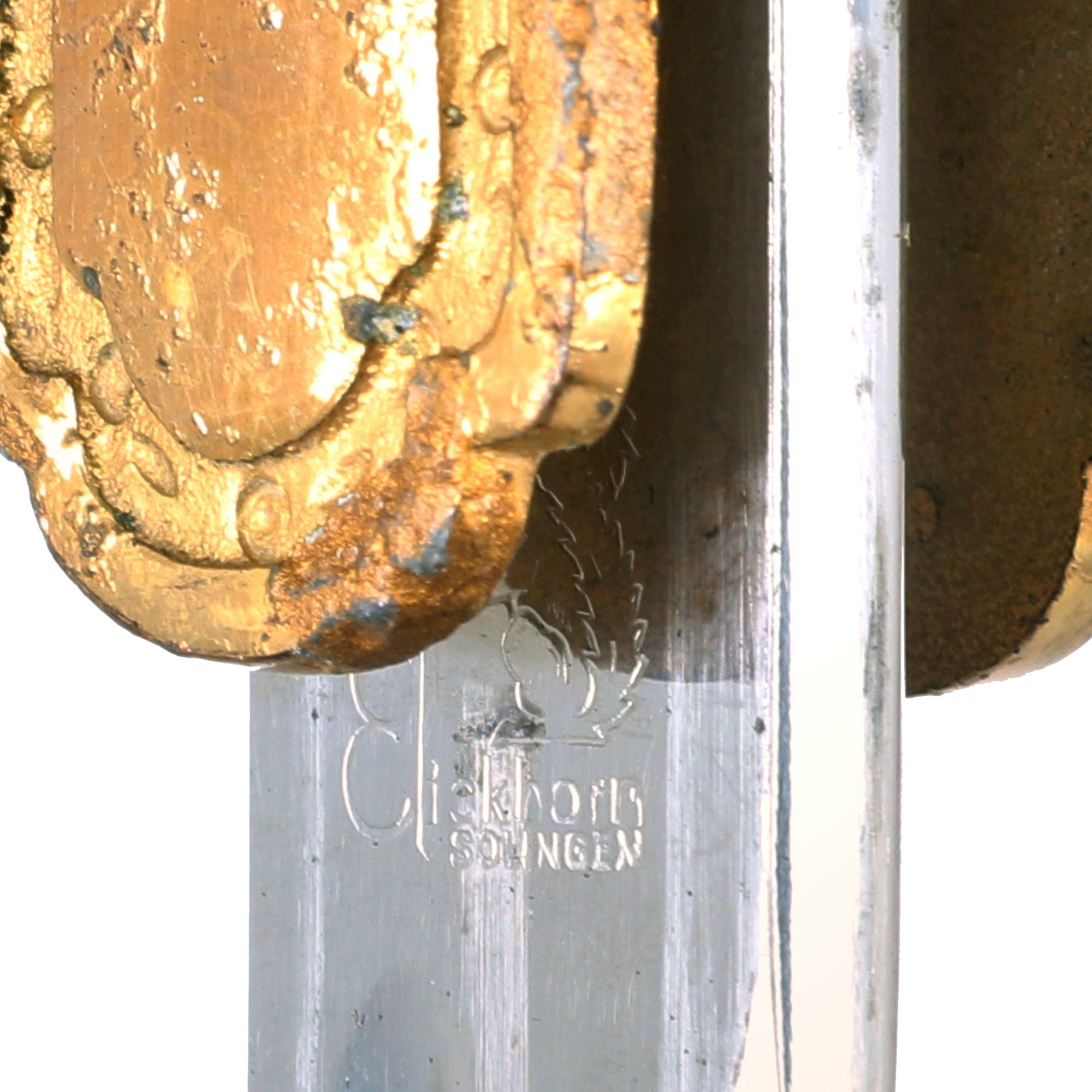 Original Item: Only One Available. This is a great example of the very desirable "Scharnhorst" variation of the Feldmarschall (Field Marshal) series of German officer swords, which contained both "Lion Head" and "Dove Head" varieties. . It was made by the famous firm Carl Eickhorn of Solingen, the legendary "City of Blades" in western Germany. The Field Marshal series was quite popular, and had a total of nine different variations, named after famous figures in German history, many of which were high ranking military officers. These included the Wrangel, Scharnhorst, Freiherr vom Stein, Roon, Derfflinger, Zieten, and Blücher patterns. The Prinz Eugen and Lützow patterns were added in 1938 and 1939, which are the rarest patterns to find. Many other makers made some similar designs to the series. This sword is made using the war-time era aluminum fittings, which were then copper plated and gilt as part of a multi-step process. It really looks magnificent, retaining much of the finely gilded finish, with some wear through on the sides of the Lion's head and also the cross guard. There also looks to have been some touch up work done using gold paint.