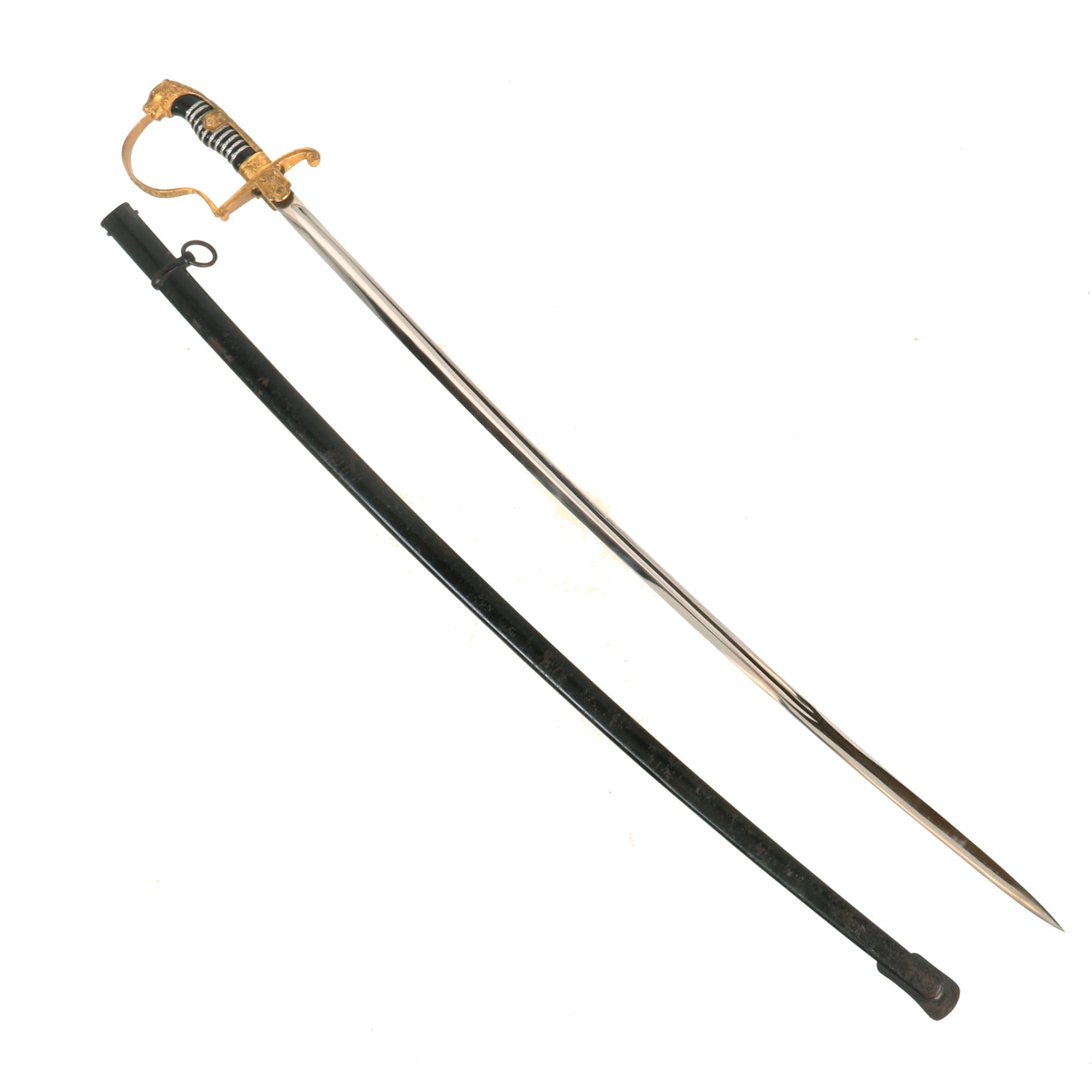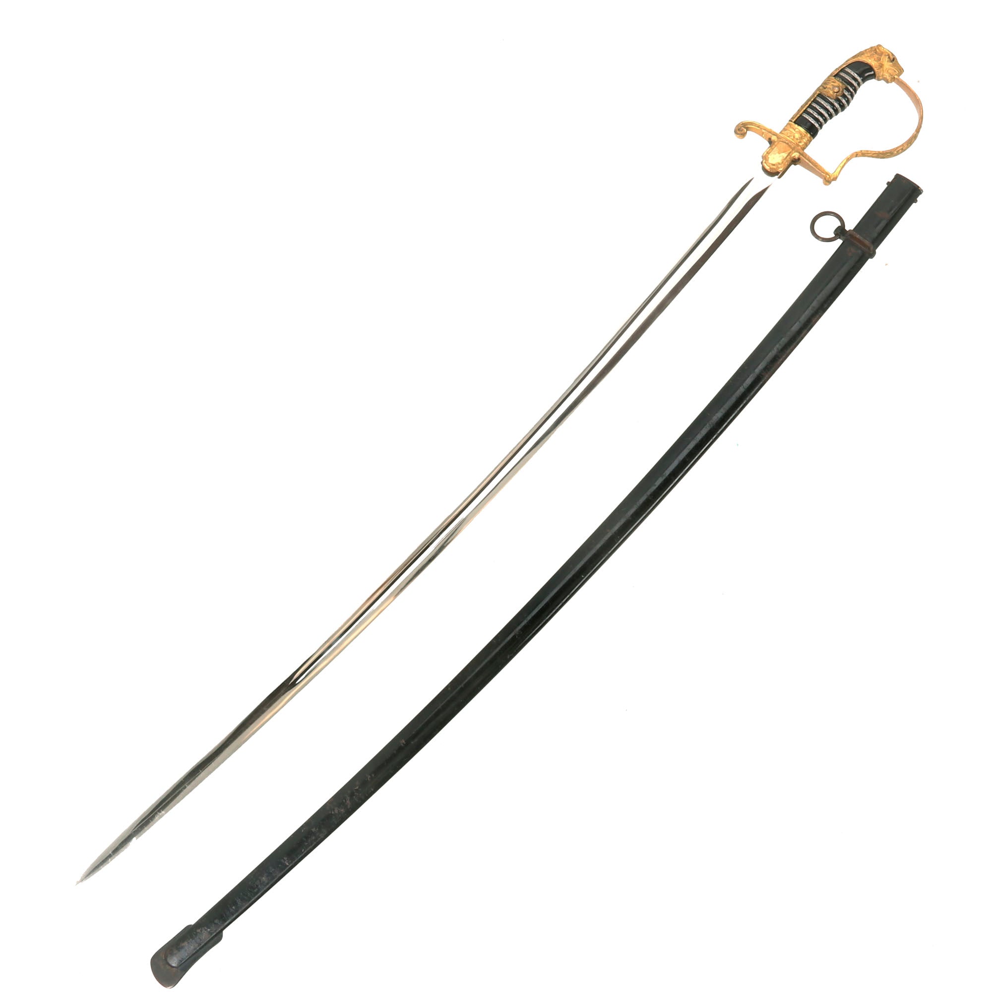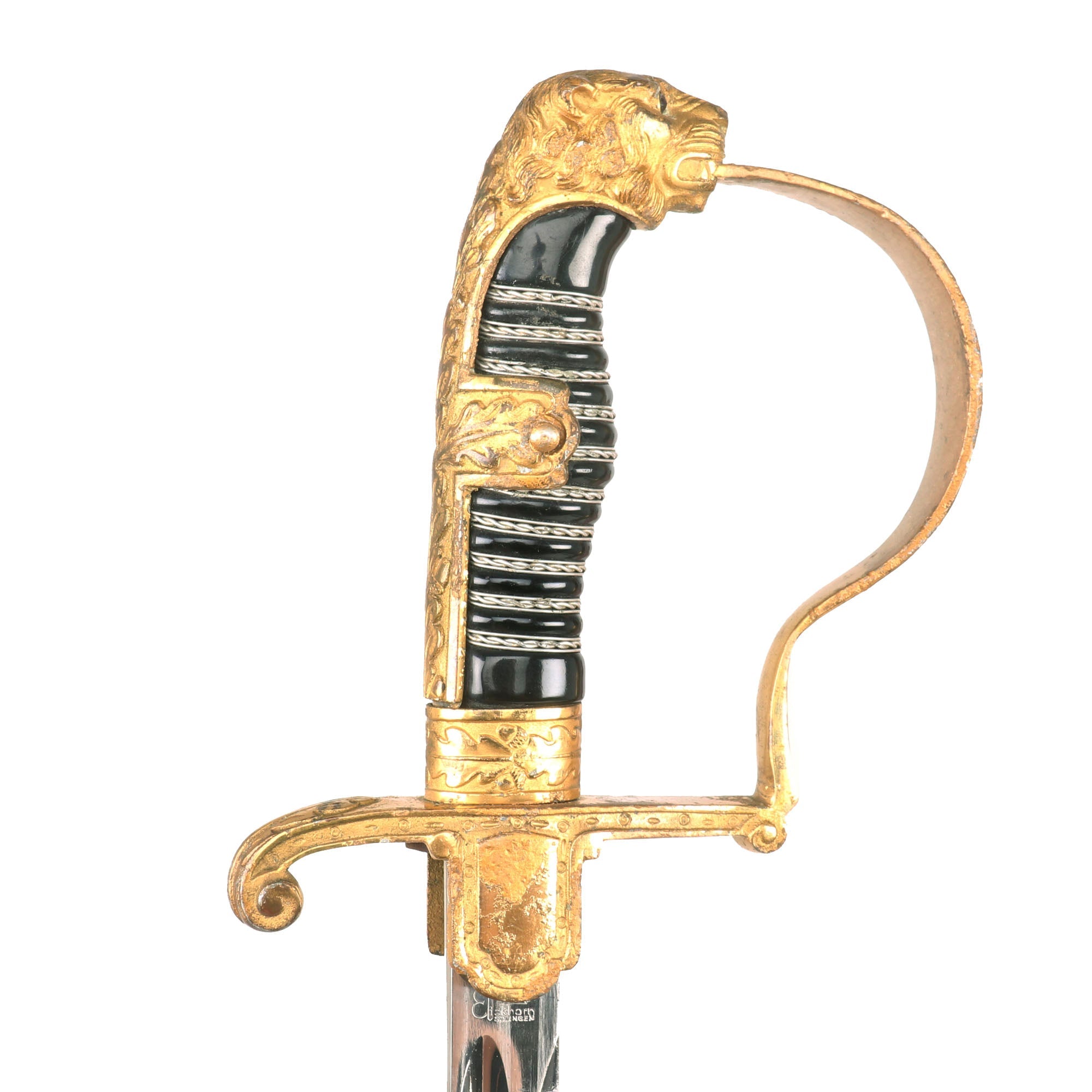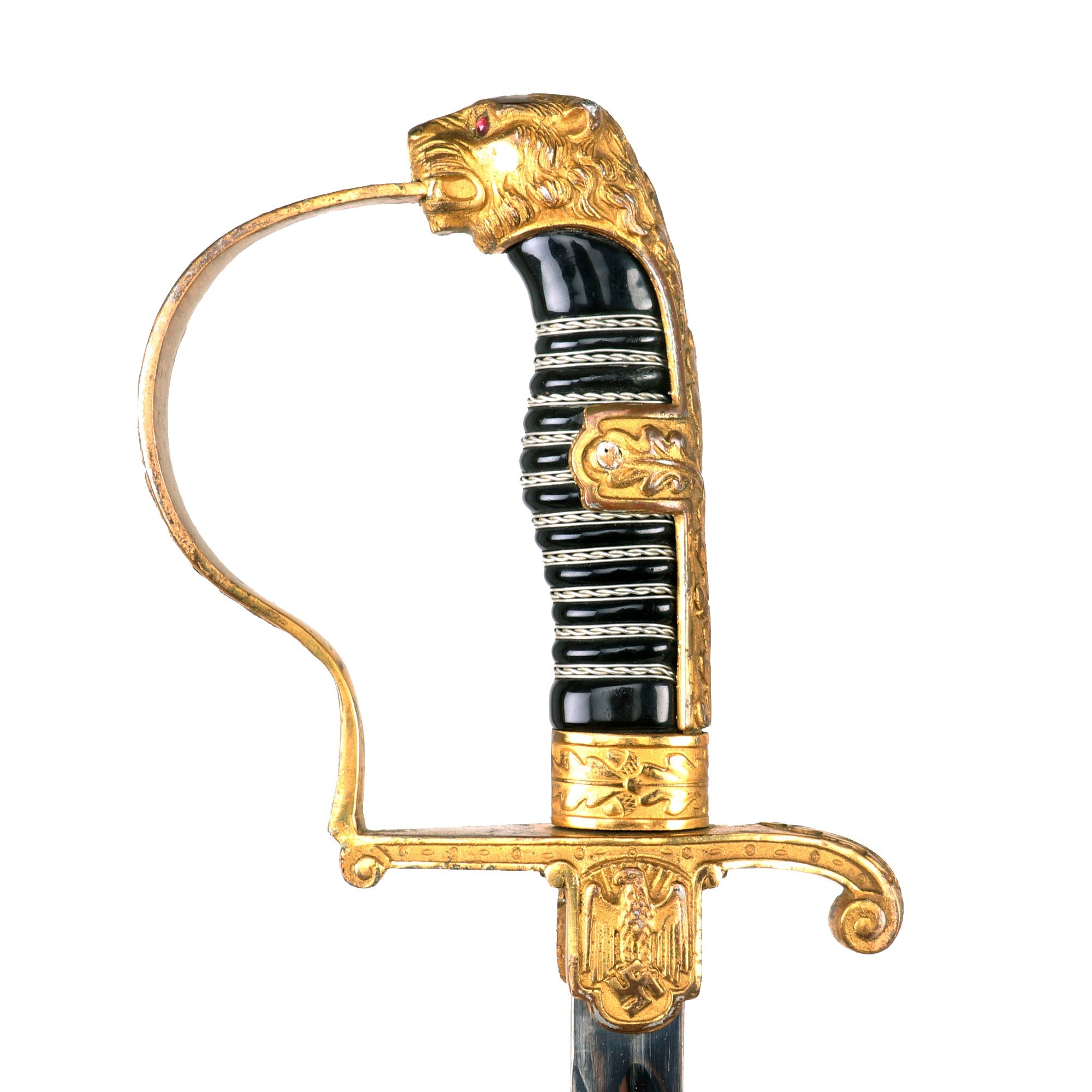 Original Item: Only One Available. This is a great example of the very desirable "Scharnhorst" variation of the Feldmarschall (Field Marshal) series of German officer swords, which contained both "Lion Head" and "Dove Head" varieties. . It was made by the famous firm Carl Eickhorn of Solingen, the legendary "City of Blades" in western Germany. The Field Marshal series was quite popular, and had a total of nine different variations, named after famous figures in German history, many of which were high ranking military officers. These included the Wrangel, Scharnhorst, Freiherr vom Stein, Roon, Derfflinger, Zieten, and Blücher patterns. The Prinz Eugen and Lützow patterns were added in 1938 and 1939, which are the rarest patterns to find. Many other makers made some similar designs to the series. This sword is made using the war-time era aluminum fittings, which were then copper plated and gilt as part of a multi-step process. It really looks magnificent, retaining much of the finely gilded finish, with some wear through on the sides of the Lion's head and also the cross guard. There also looks to have been some touch up work done using gold paint.