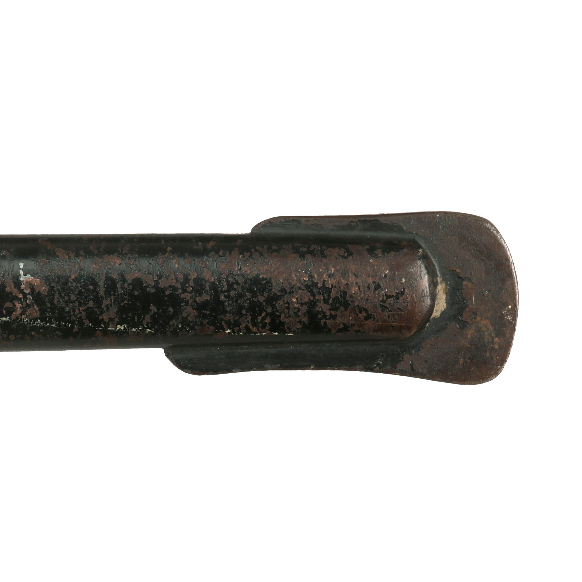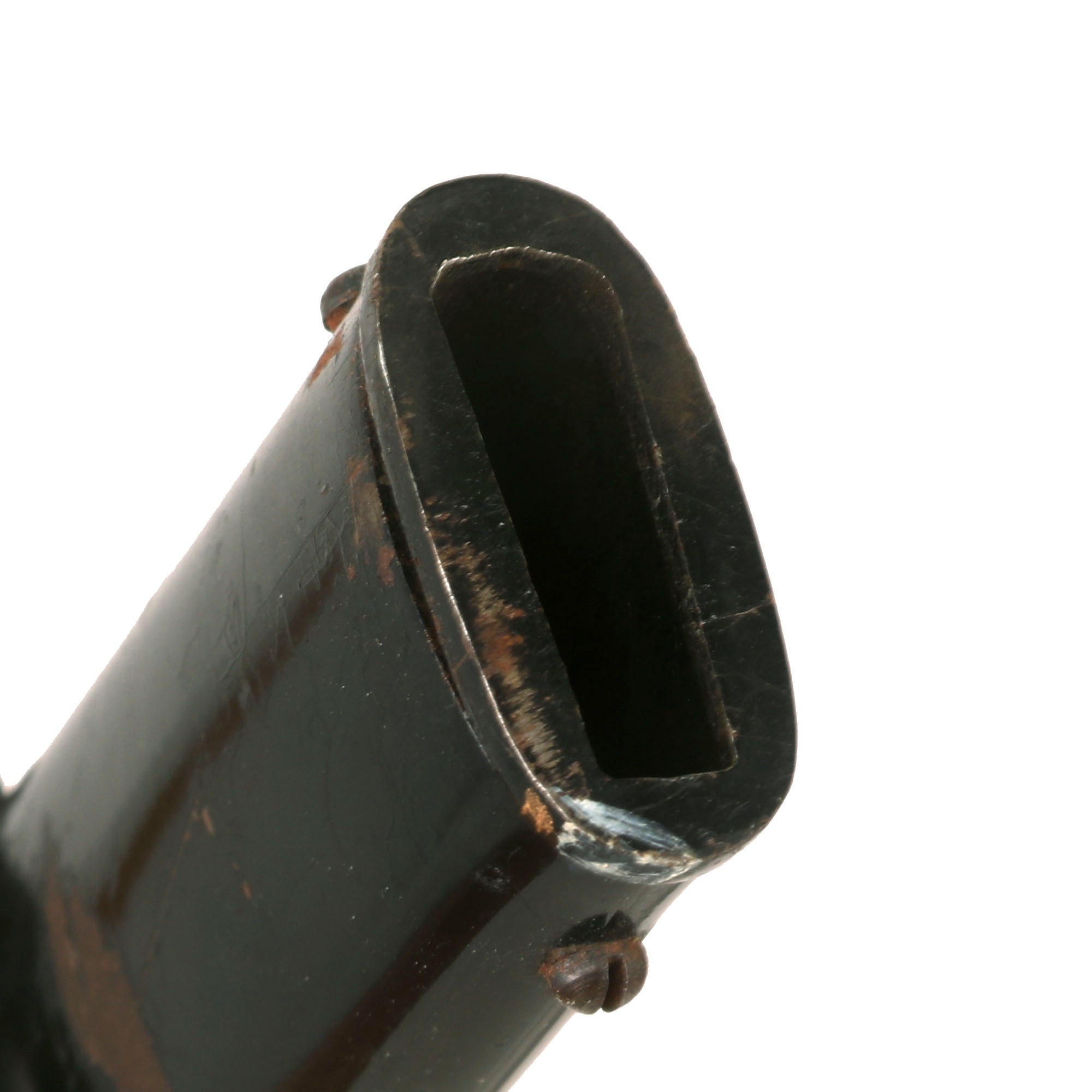The steel scabbard of this example is in very good condition, showing a straight body with no bends or major dents. It has probably about 75% of the original black enamel paint present. Most of the body shows a lot of checking and crazing in the finish due to age, with areas of finish flaking that has now oxidized. The hanger ring is intact, as is the rectangular loop on the side for "hitching up" the sword to a hanger clip indoors.