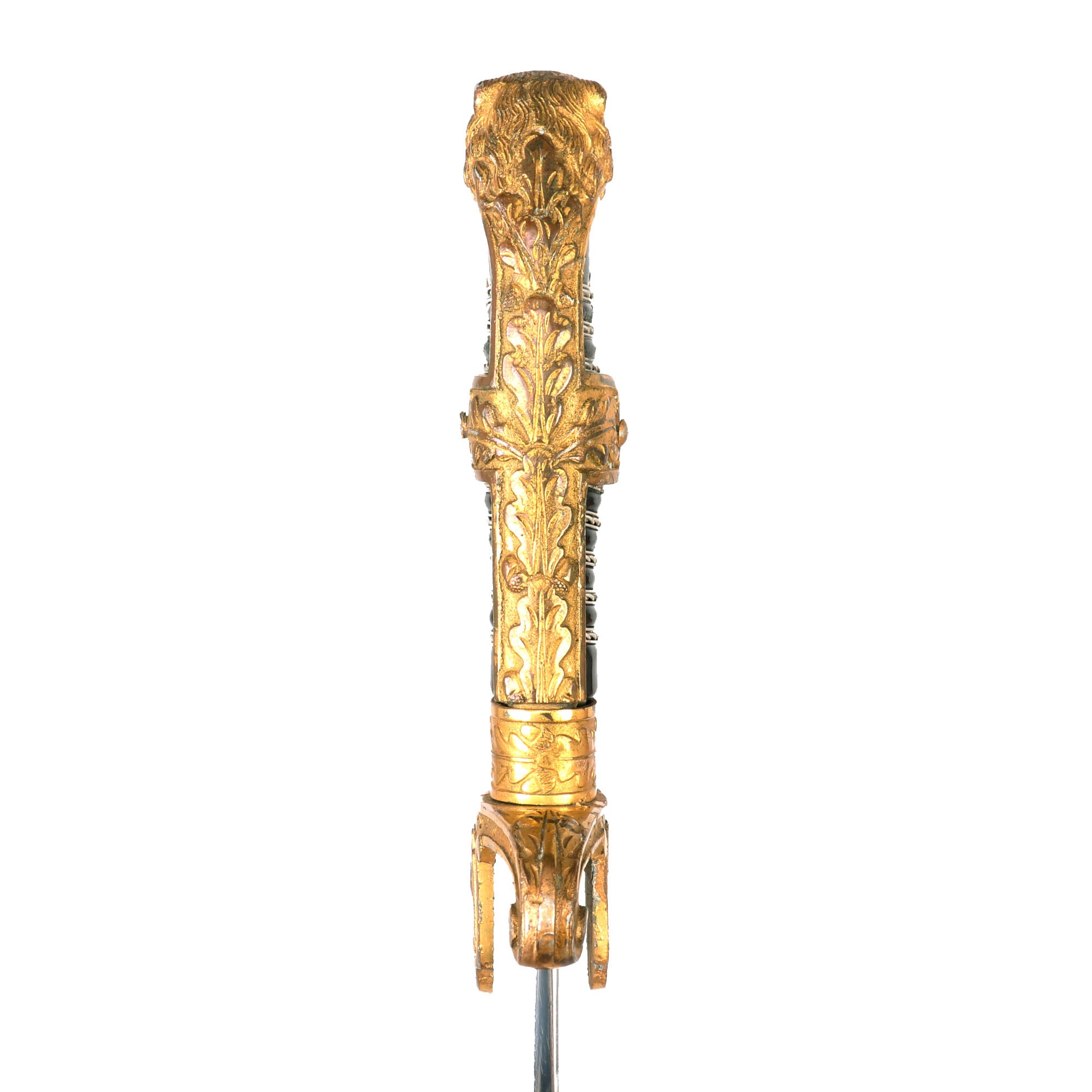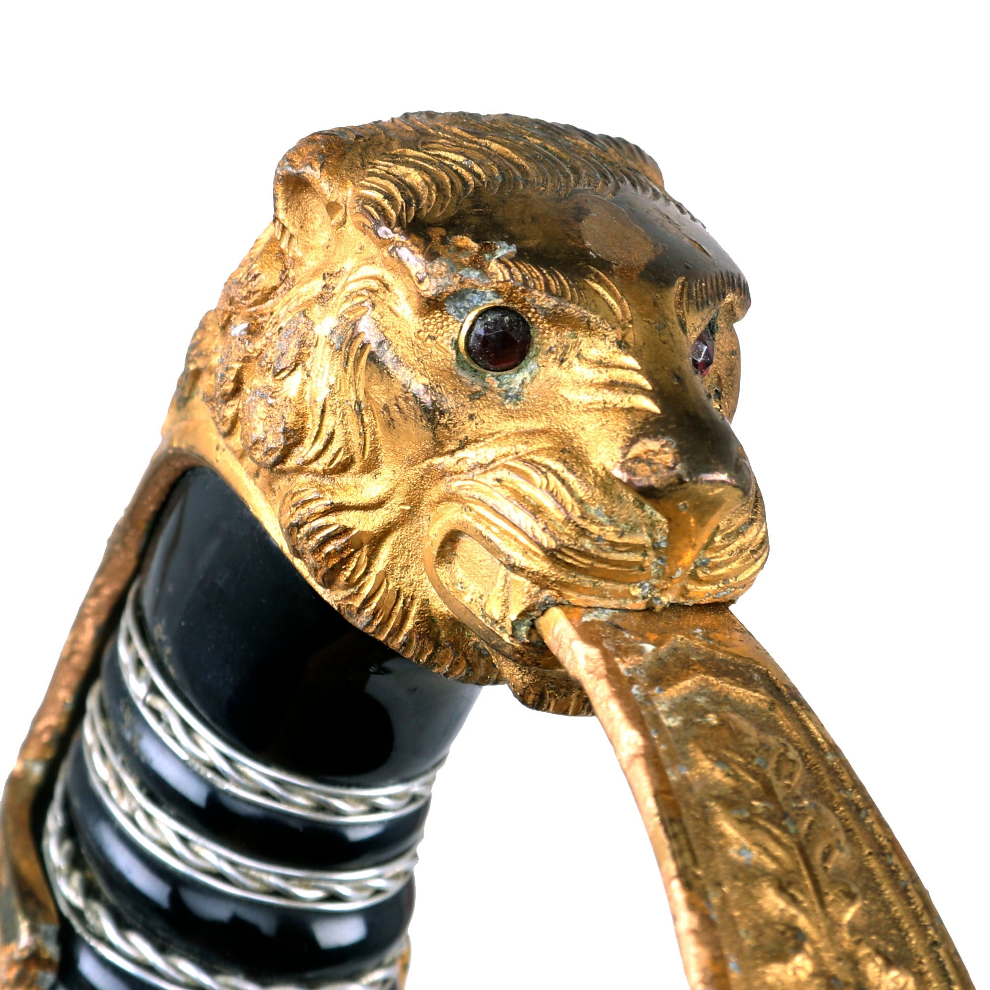 The Pattern 1706 - Scharnhorst sword is named after General Gerhard Johann David Waitz von Scharnhorst (12 November 1755 – 28 June 1813), who was a Prussian General and Chief Staff noted for his reforms of the army and for leadership during the Napoleonic Wars. This pattern features a great looking leopard or lion head with brows that jut out well over the faceted red eyes. The detailing to the head of this cat is outstanding, with handwork evident on the lower jaw, whiskers, muzzle, brow and even to the mane which flows partially down the backstrap. It features a less ornate grip than some of the other patterns, with simple leaf and acorn designs on the back strap, "P"-guard and ferrule. However, the detail on the leaves is exquisite. It also has the characteristic rectangular style side tabs of the pattern.