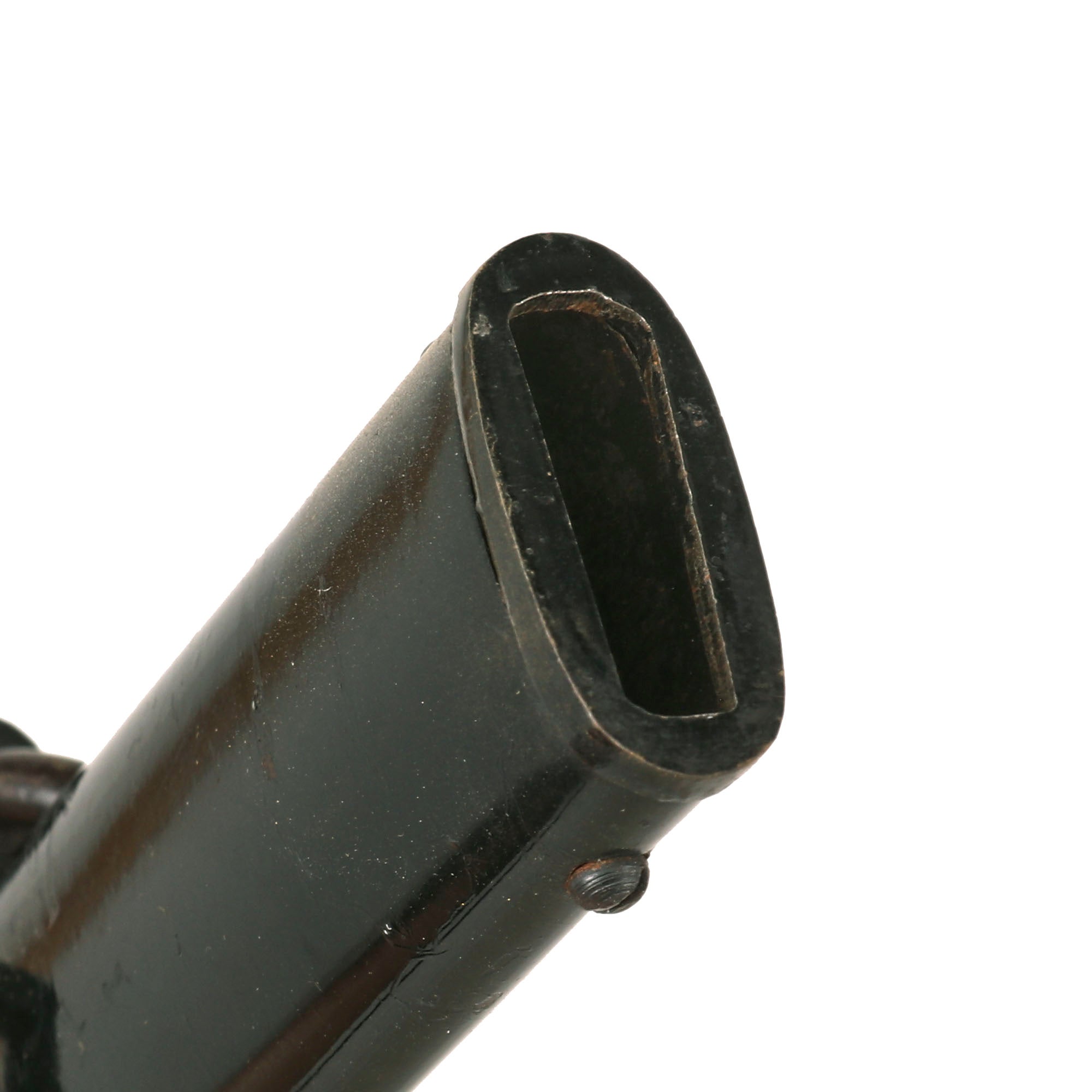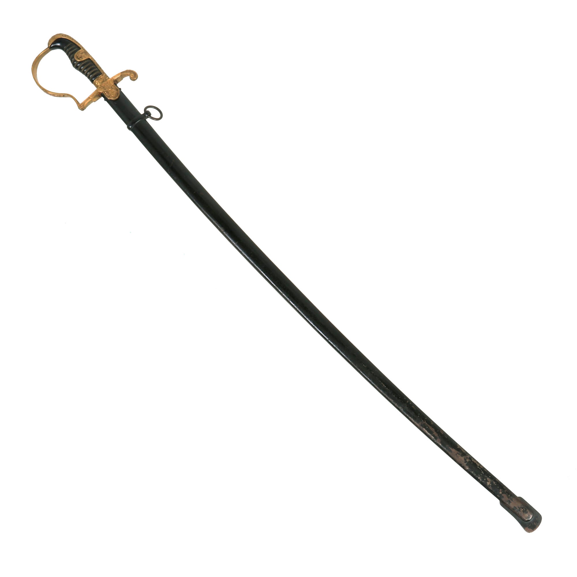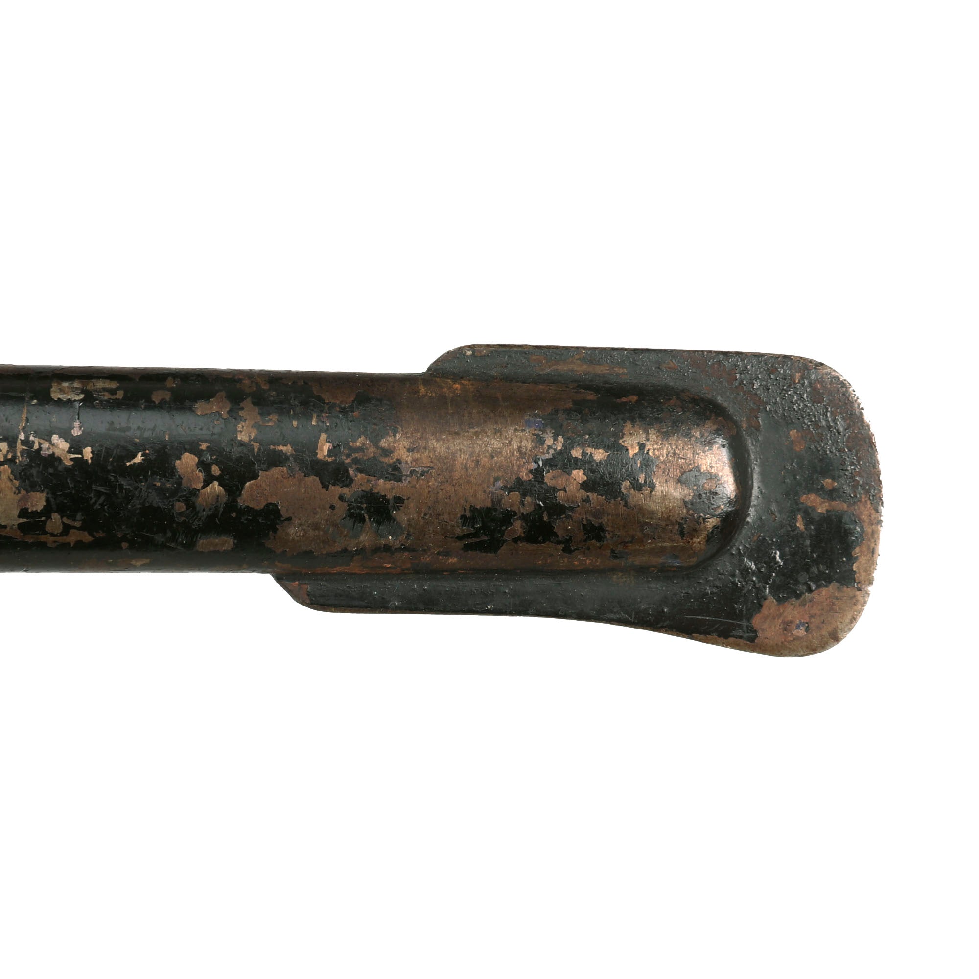 The scabbard of this example still has a very good black enamel finish, it is retained at over 80% with no dents that we can see or feel. There is a lovely pattern of checking and crazing in the enamel, and we do not see any evidence that it has ever been repainted. There are a few areas of finish loss where it has oxidized, but overall this is one of the better examples that we have seen. There is some wear on the hanger ring, through to the base metal as is typical, and the rectangular ring for "hitching up" the sword is still intact.