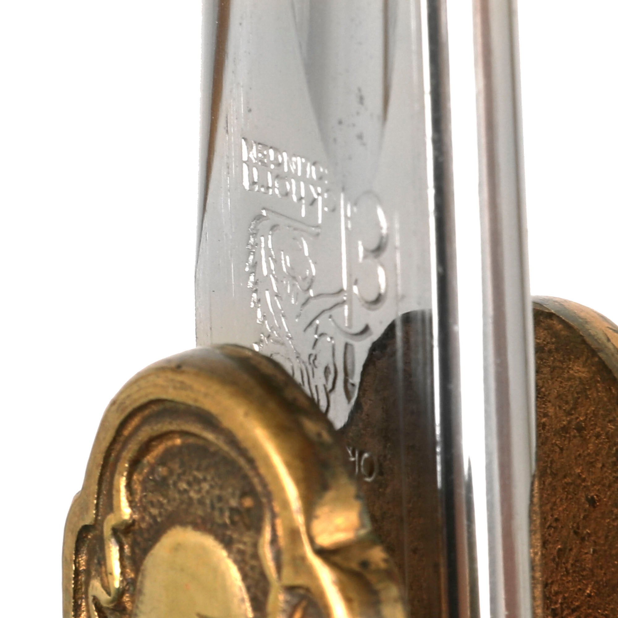 The blade on this sword is an incredible example in excellent condition. It measures 31 3/4 inches and has the highest quality nickel plating. This plating is in great shape with only a bit of scuffing, and no wear through or oxidation that we can see. There is no damage to the edge, the tip is straight, and this is really one of the best blades we have ever seen on any German dress sword.