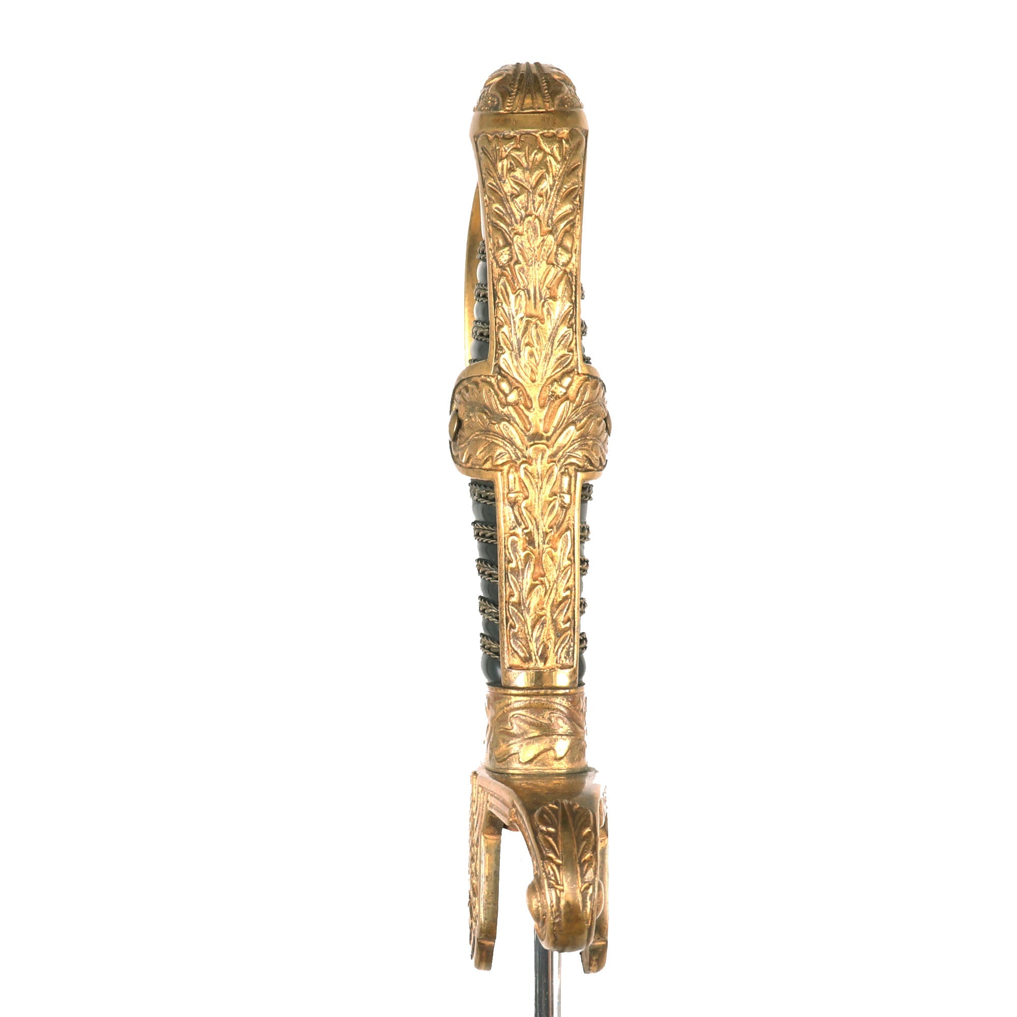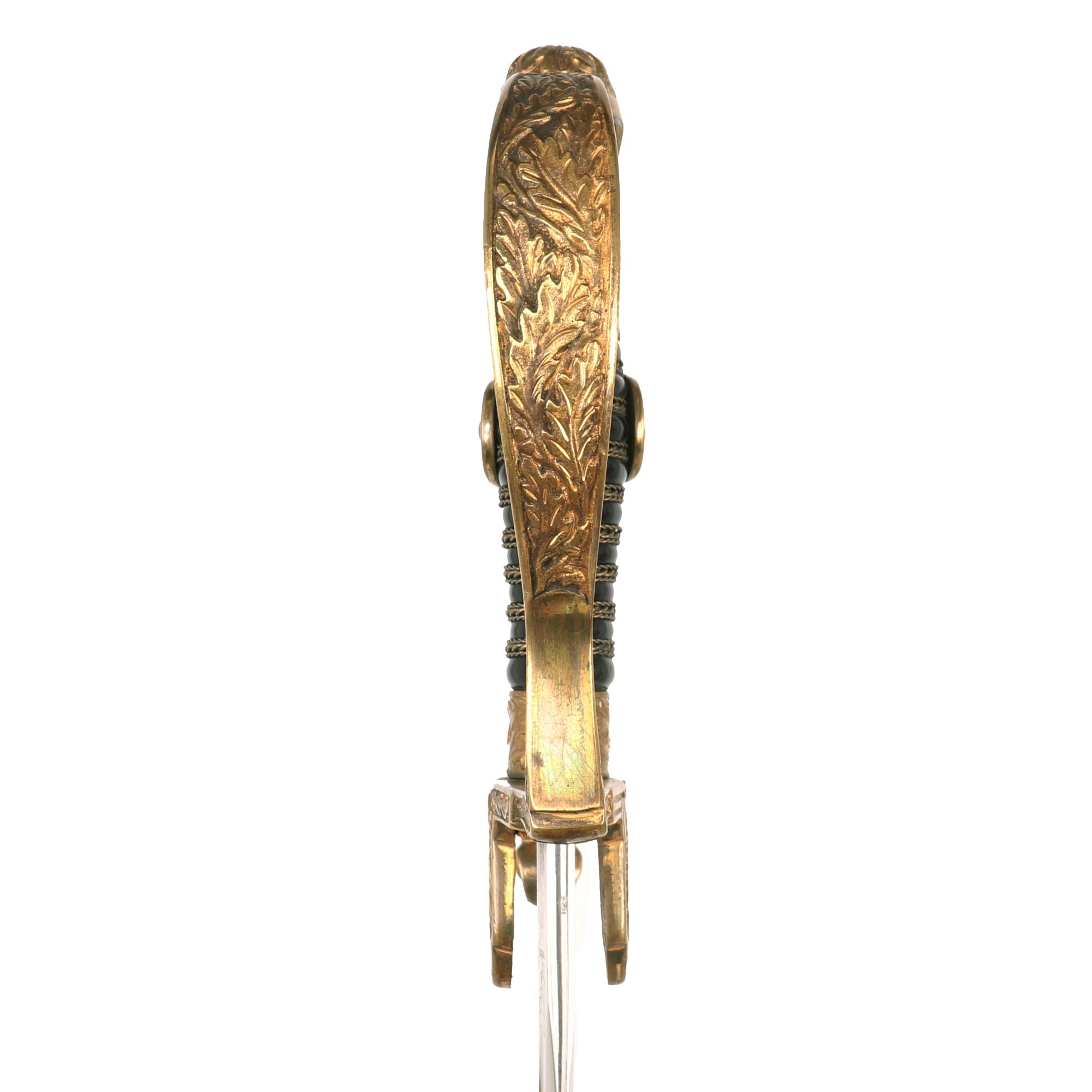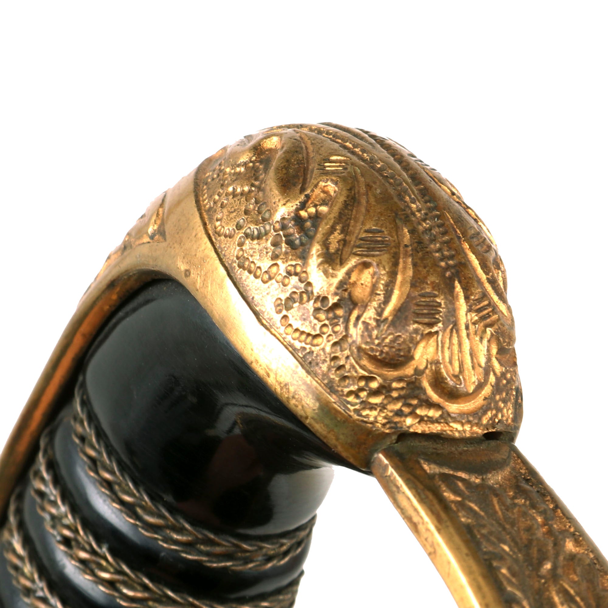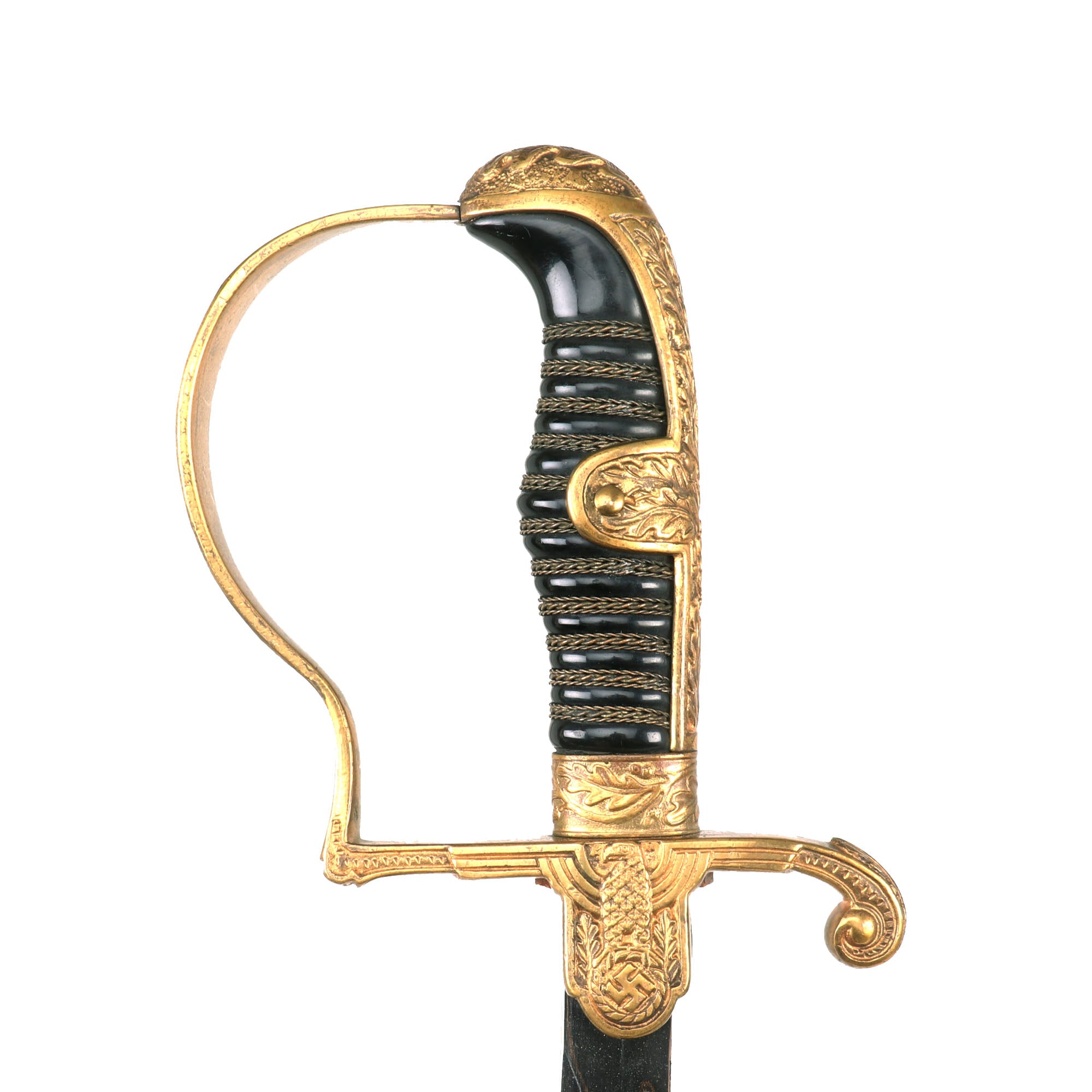 This piece is a real treasure as it is not constructed from the later war aluminum, but rather is made of solid brass. It really looks magnificent, retaining much of the finely gilded finish, and comes with a great black enamel finished steel scabbard. This type is described in Swords of Germany 1900-1945 by John R. Angolia on page 77, and along with the "von Stein" pattern is very much the prototype for other Dove head swords made by other makers.