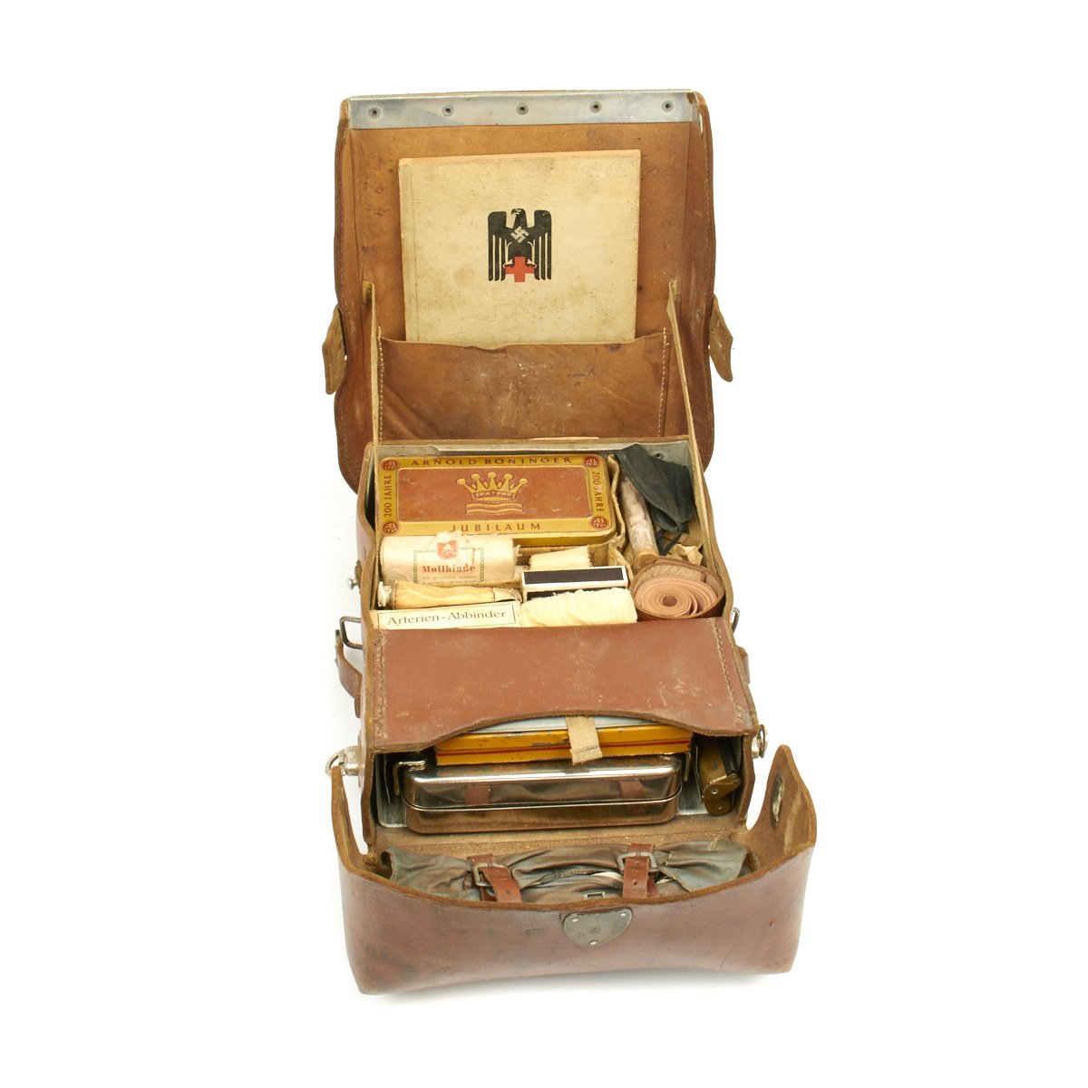 Original Item: Only One Available. This fantastic complete set of first aid and medical equipment nearly all bearing WW2 dates and contained in a classic excellent condition brown leather German WWII issue first aid leather large pattern medic case. The case features a carry handle on top, multiple compartments inside and an embossed S to the front lock plate. The set is so massive and complete that listing a full inventory would be extremely time consuming, so please consult the photos for to see what other items. Some items of interest include: