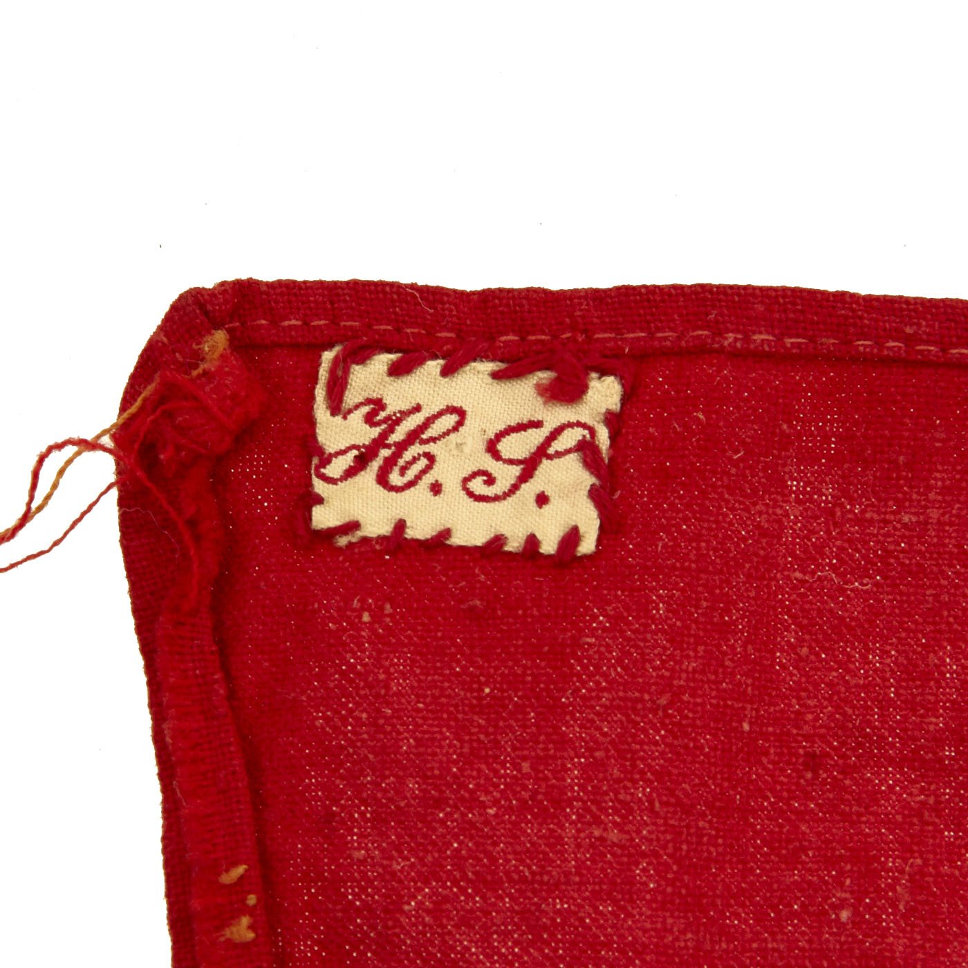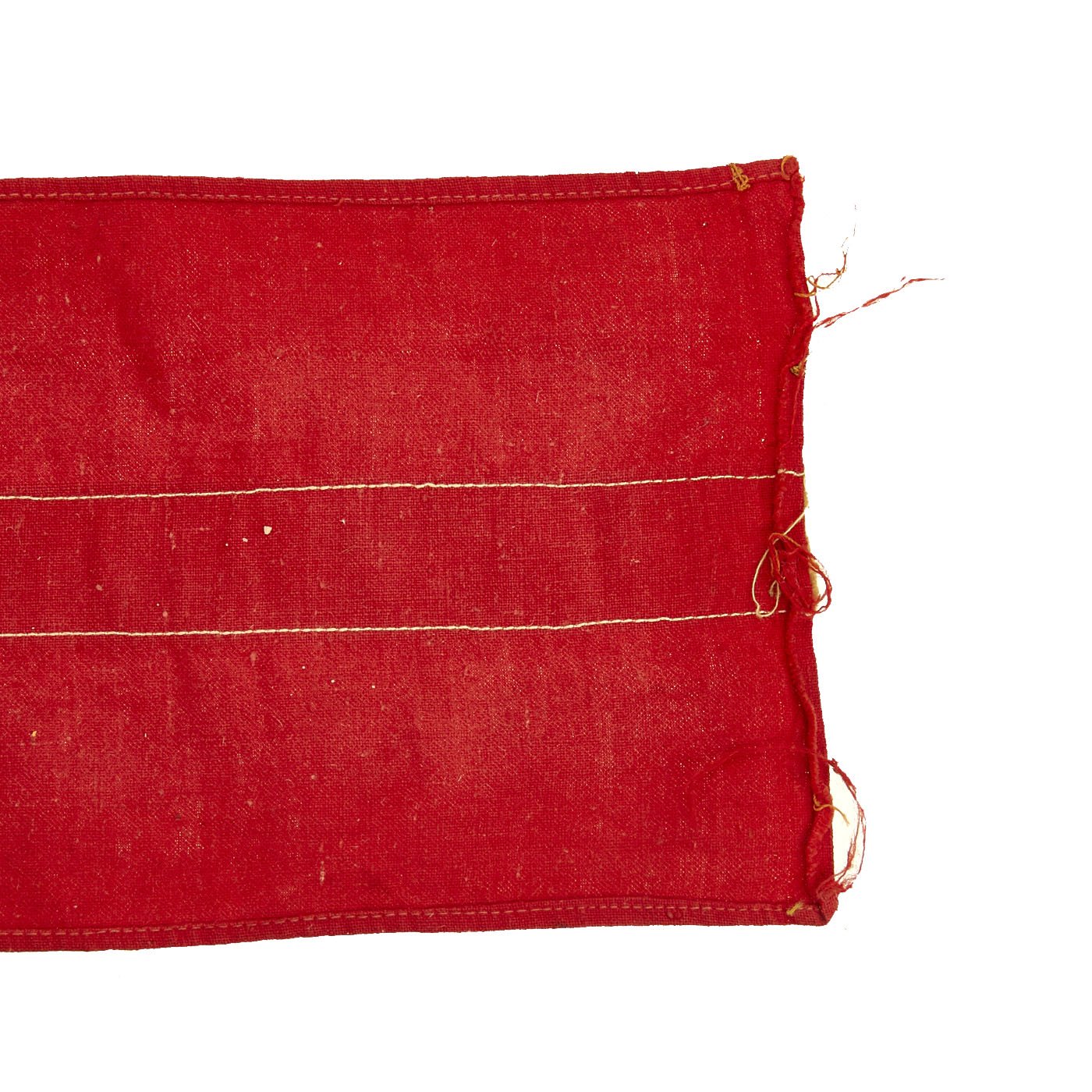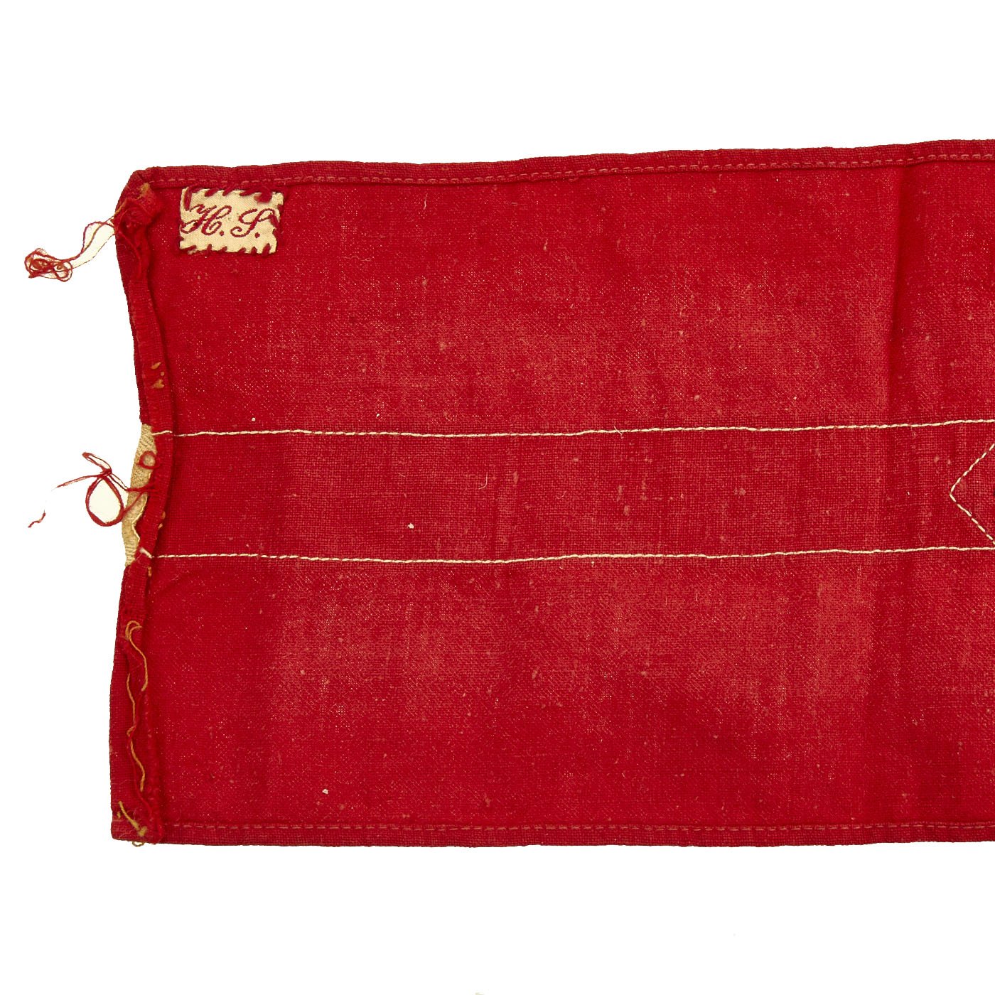 Original Item: Only One Available. This H jugend (HJ) Armband is in very good used condition. Unlike many that we have seen, this example definitely was worn over time, so it definitely saw use in the field. These are often called "cut off" examples, even though they were not usually sewn to the uniform. There is overall staining from dirt, and a few individual stains. It measures approximately 13 3/4" x 4 1/4", and was sewn together at one point, but the stitching is removed. It also has small label reading H.P. sewn to it, but we believe this to be the owners initials, not a maker label.