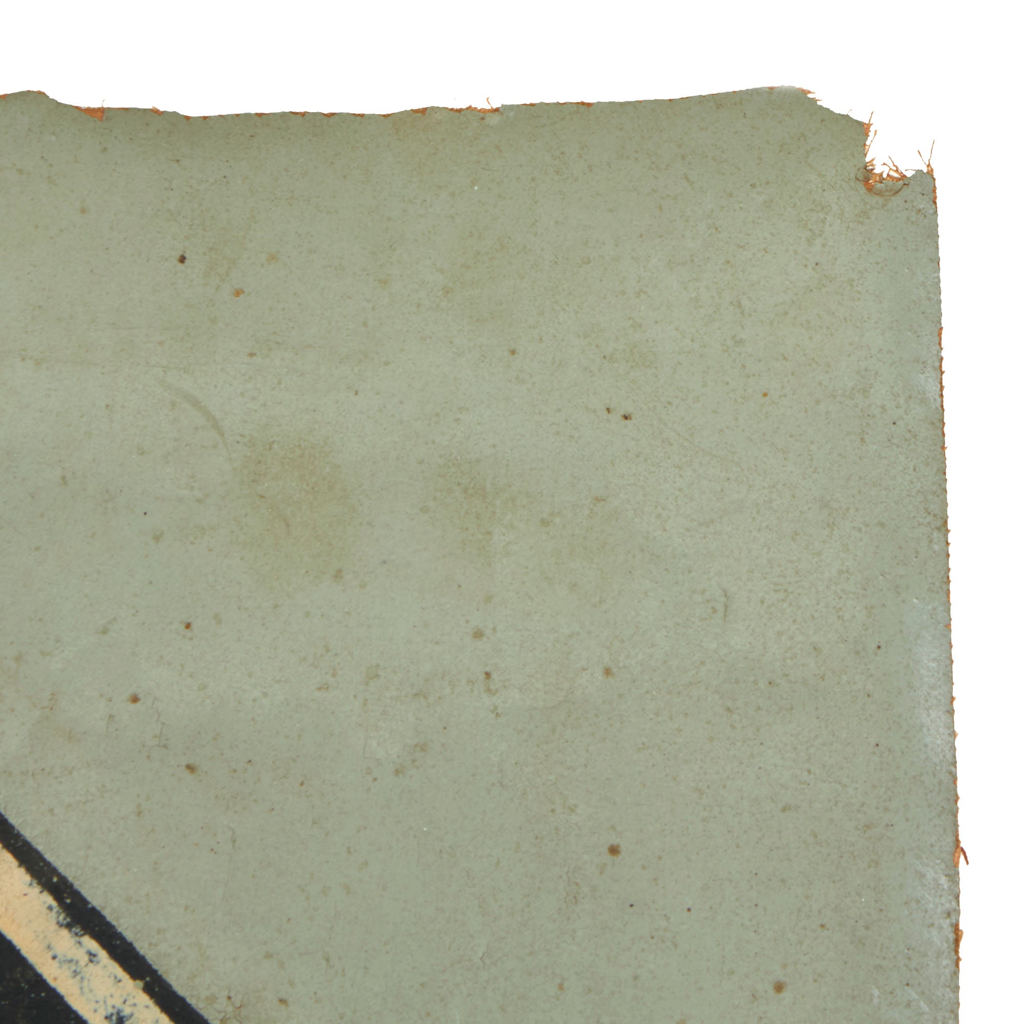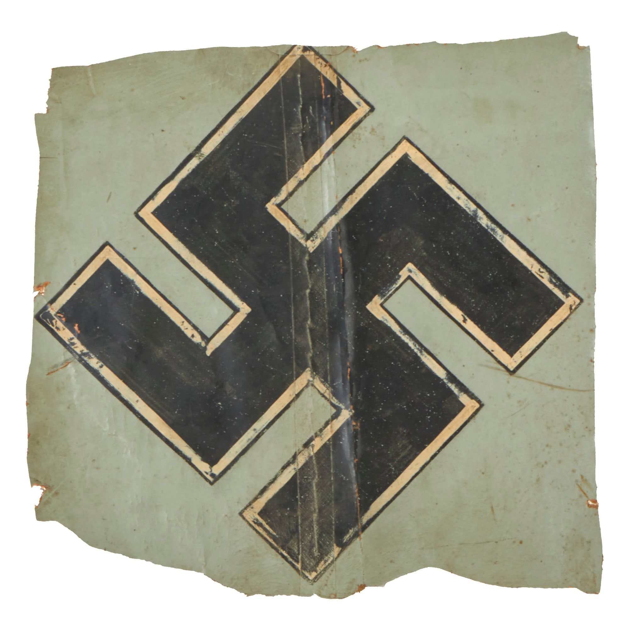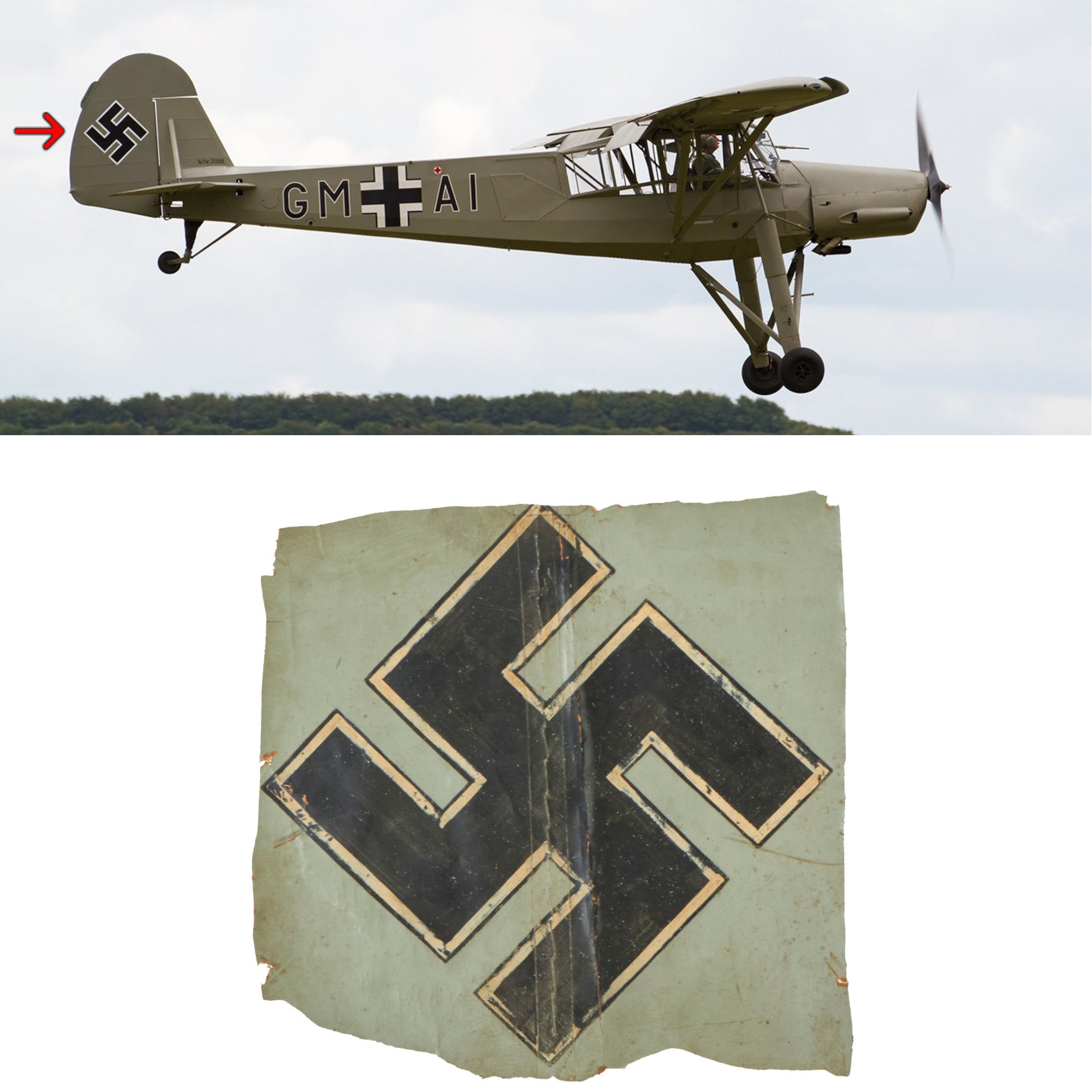 This is a piece of the canvas painted covering from the tail rudder section of a German WWII Storch aircraft, most likely cut off during the war or just after by a USGI to bring home as a souvenir. It measures approximately 16 inches by 16 inches and shows a Luftwaffe "mobile" swas (hook cross) tail emblem. It shows some paint loss from folding as well as some tearing, but still looks great. This is an exceptionally rare piece as fewer than 3000 Storch aircraft were produced for Germany during WW2 and it will make an excellent display piece.