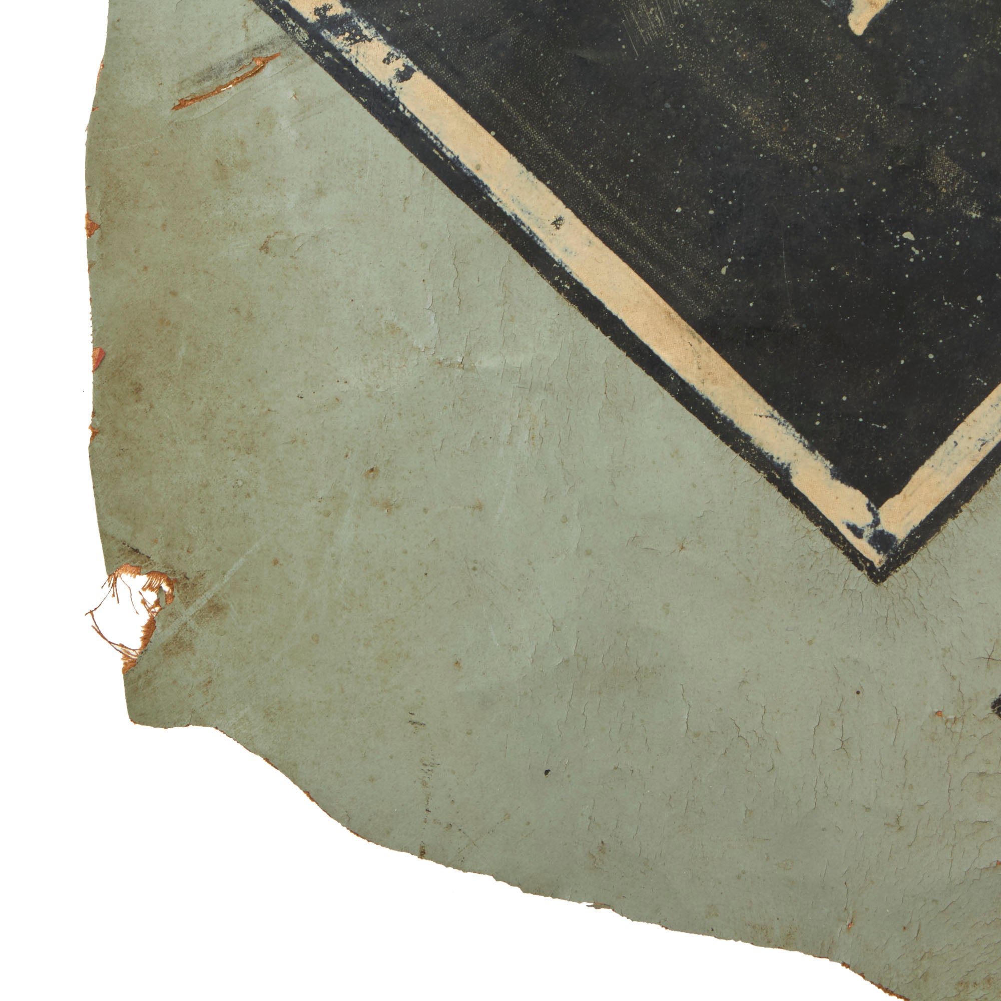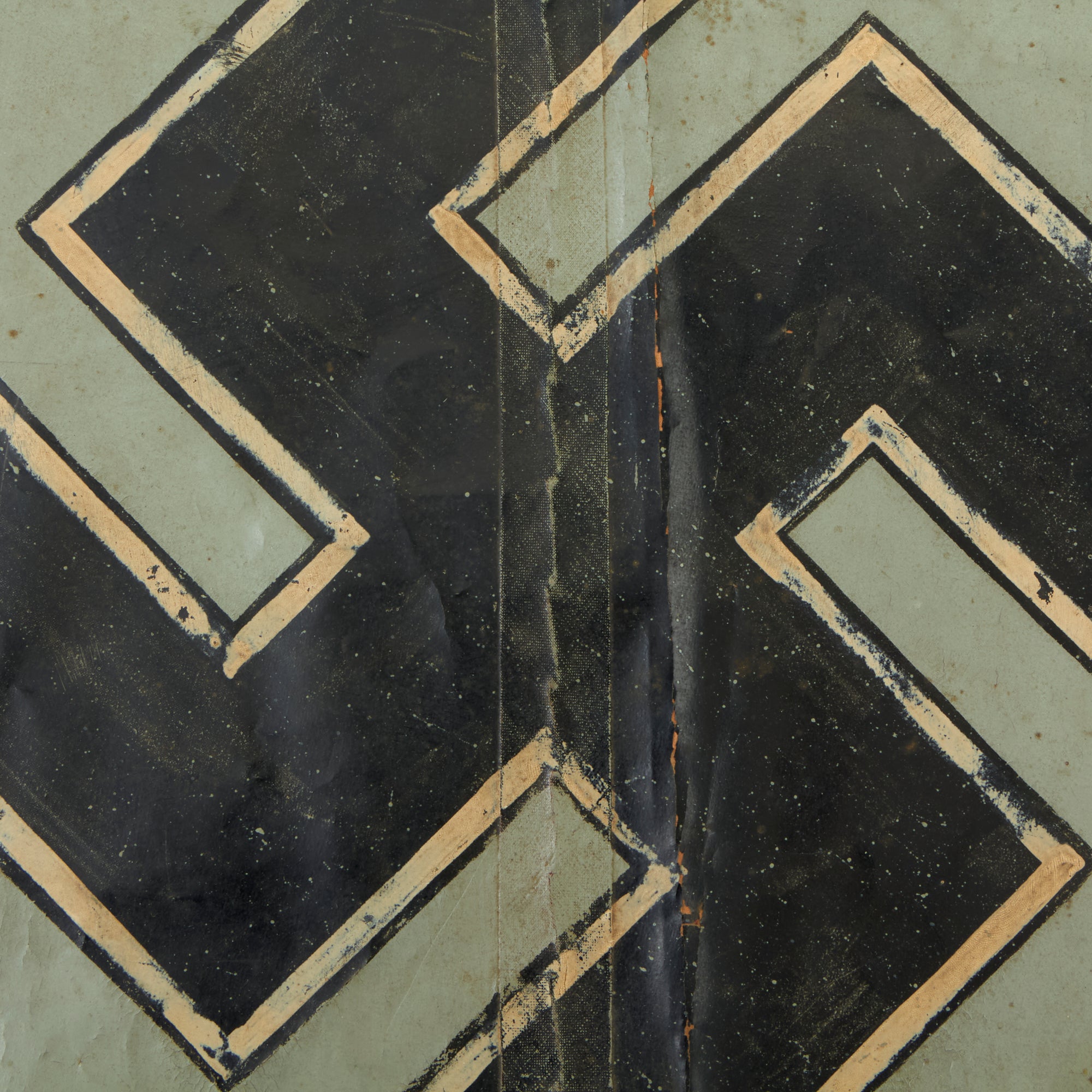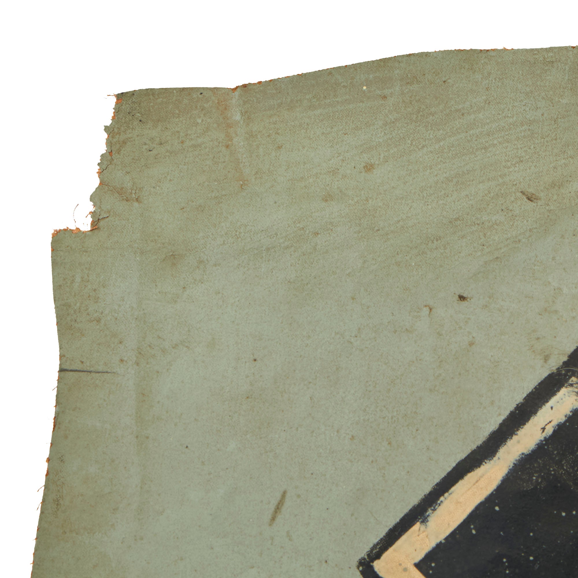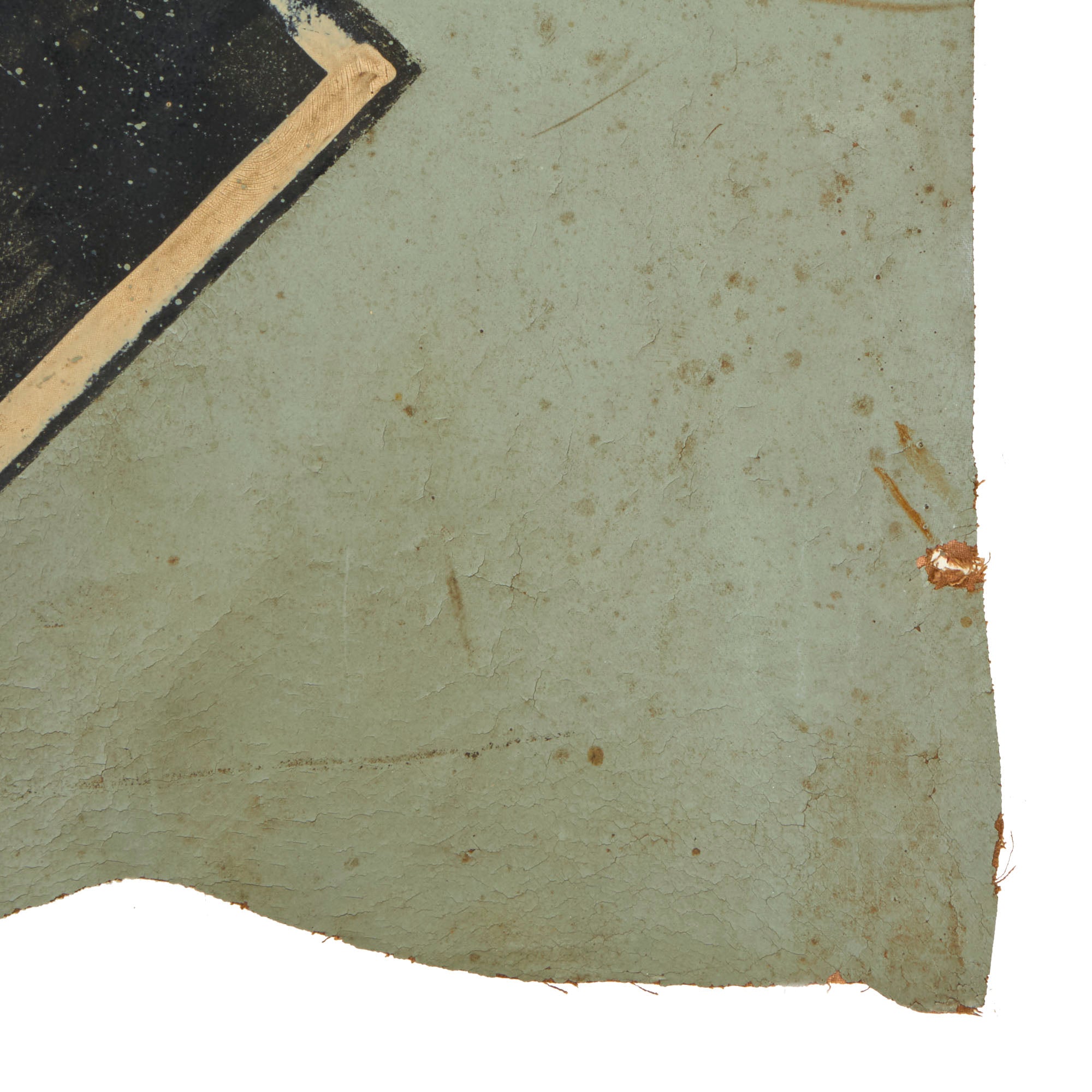 This is a piece of the canvas painted covering from the tail rudder section of a German WWII Storch aircraft, most likely cut off during the war or just after by a USGI to bring home as a souvenir. It measures approximately 16 inches by 16 inches and shows a Luftwaffe "mobile" swas (hook cross) tail emblem. It shows some paint loss from folding as well as some tearing, but still looks great. This is an exceptionally rare piece as fewer than 3000 Storch aircraft were produced for Germany during WW2 and it will make an excellent display piece.