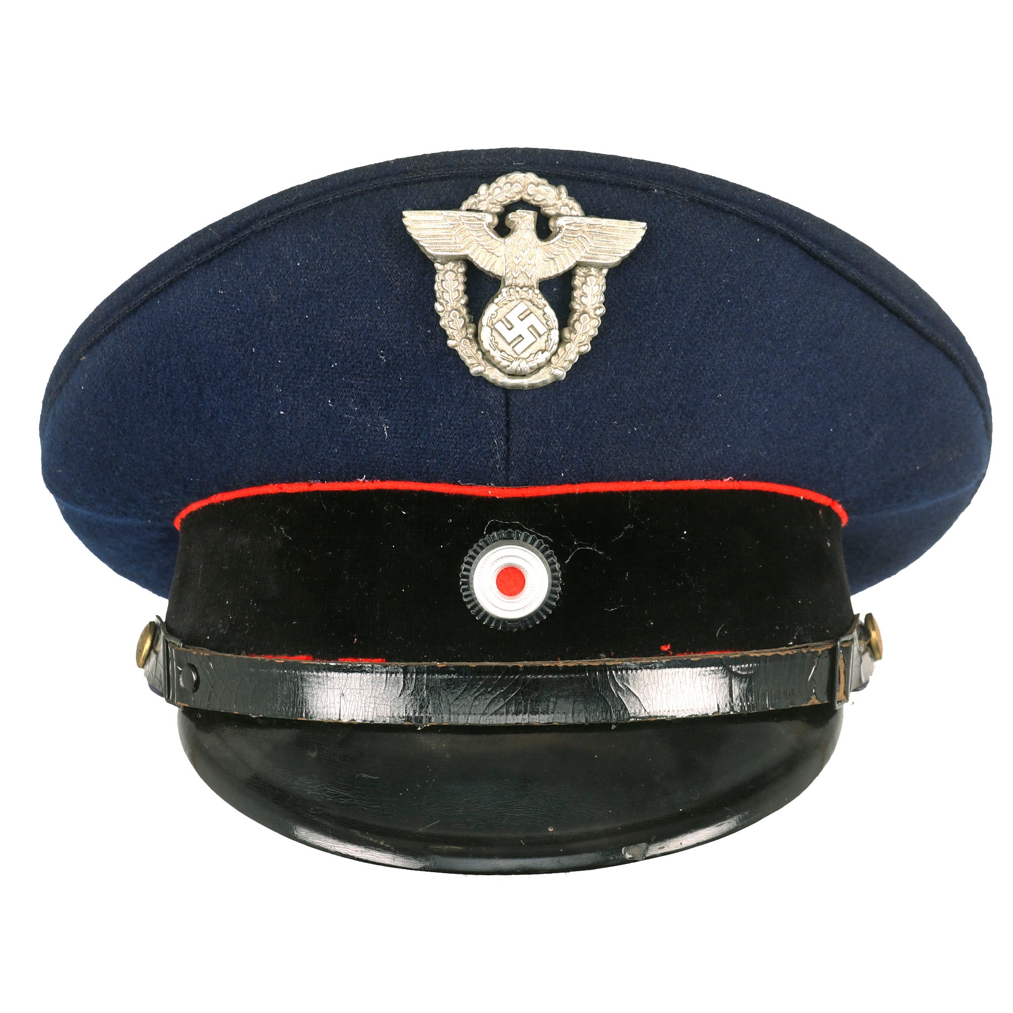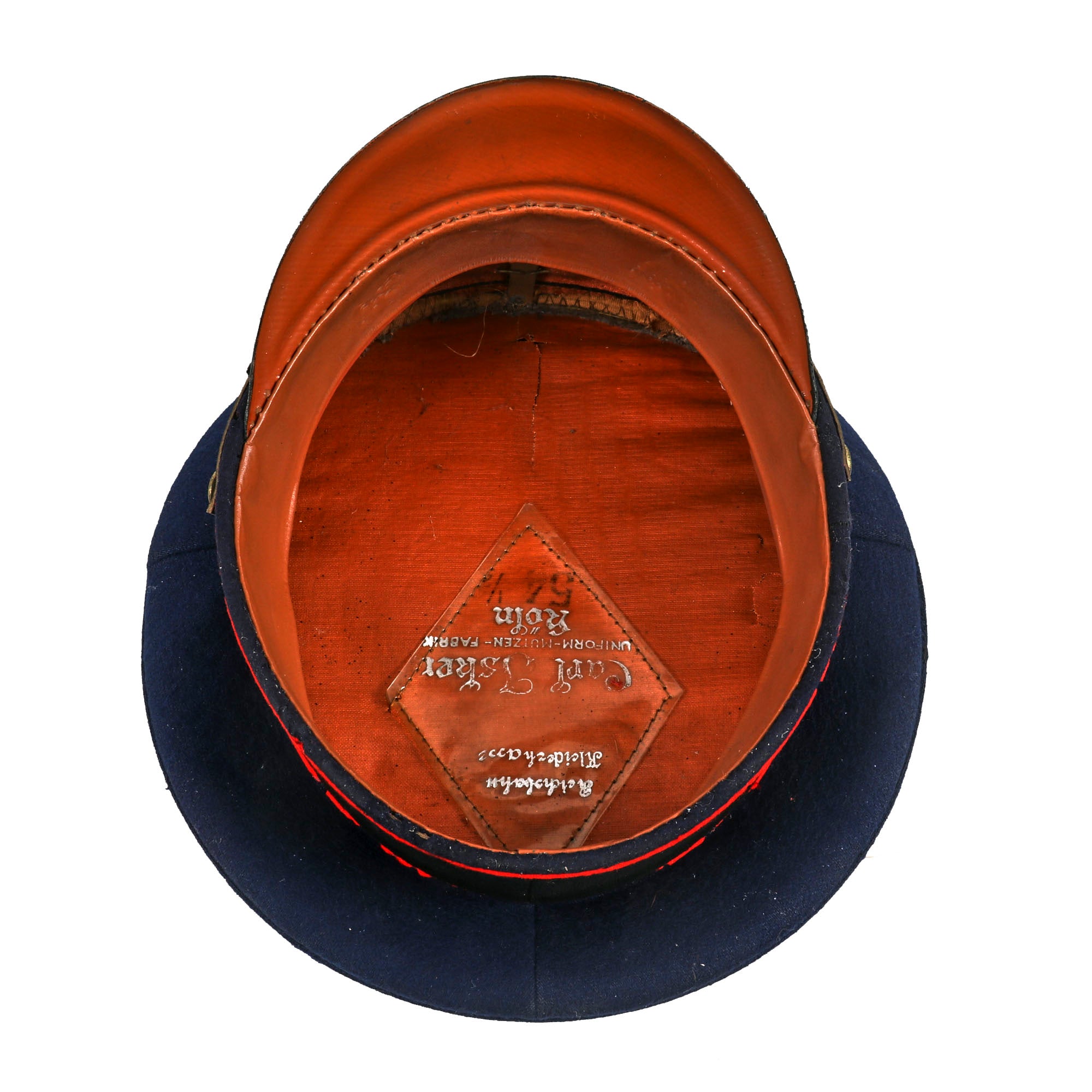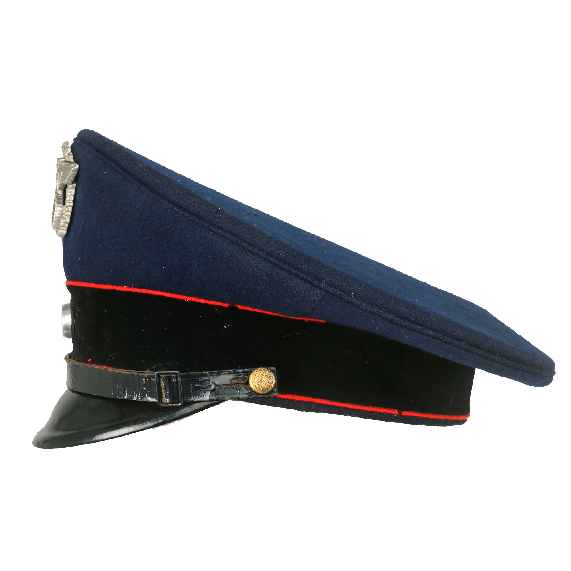 This is a high quality German made cap, which is most likely intended more for an NCO than an enlisted man. It is fabricated from very dark navy blue "doeskin" wool cloth, with a wide black velvet plush material cap band. This is flanked by two rows of carmine red (karminrot) color piping around the circumference, the Protection Police Truppenfarbe (troop color) for the Fire branch. The crown stiffener is still present, giving it a very sharp look.