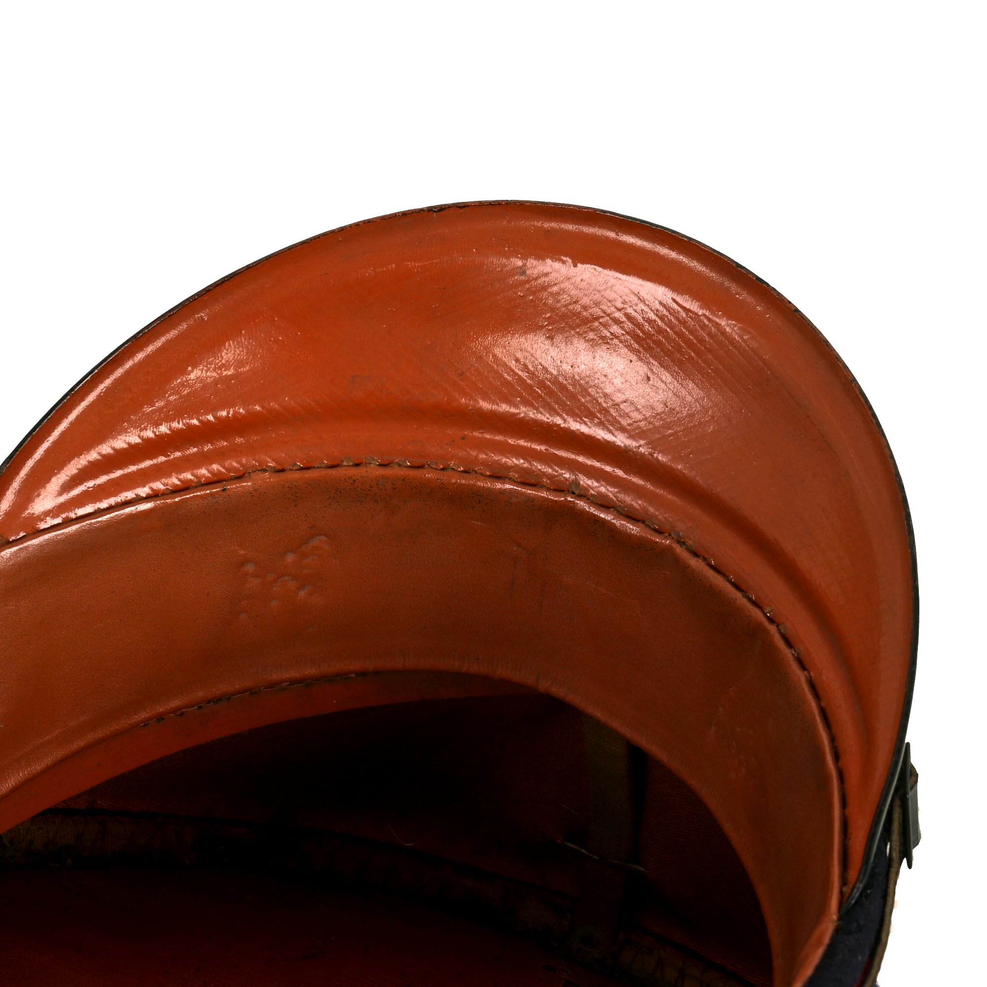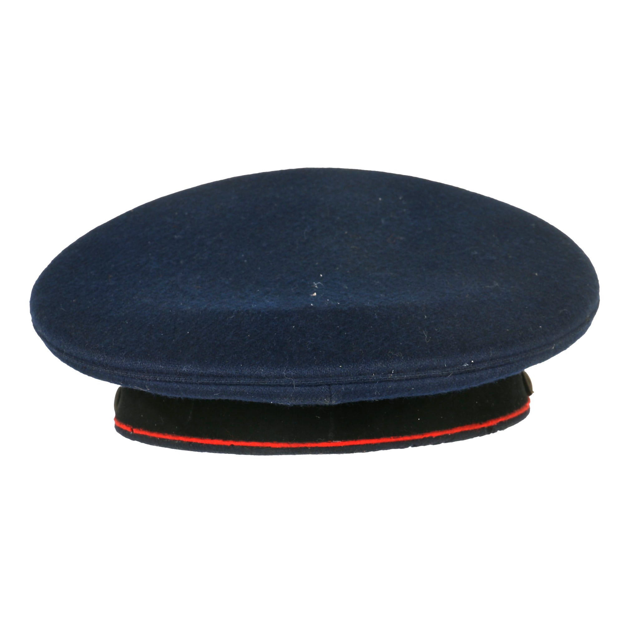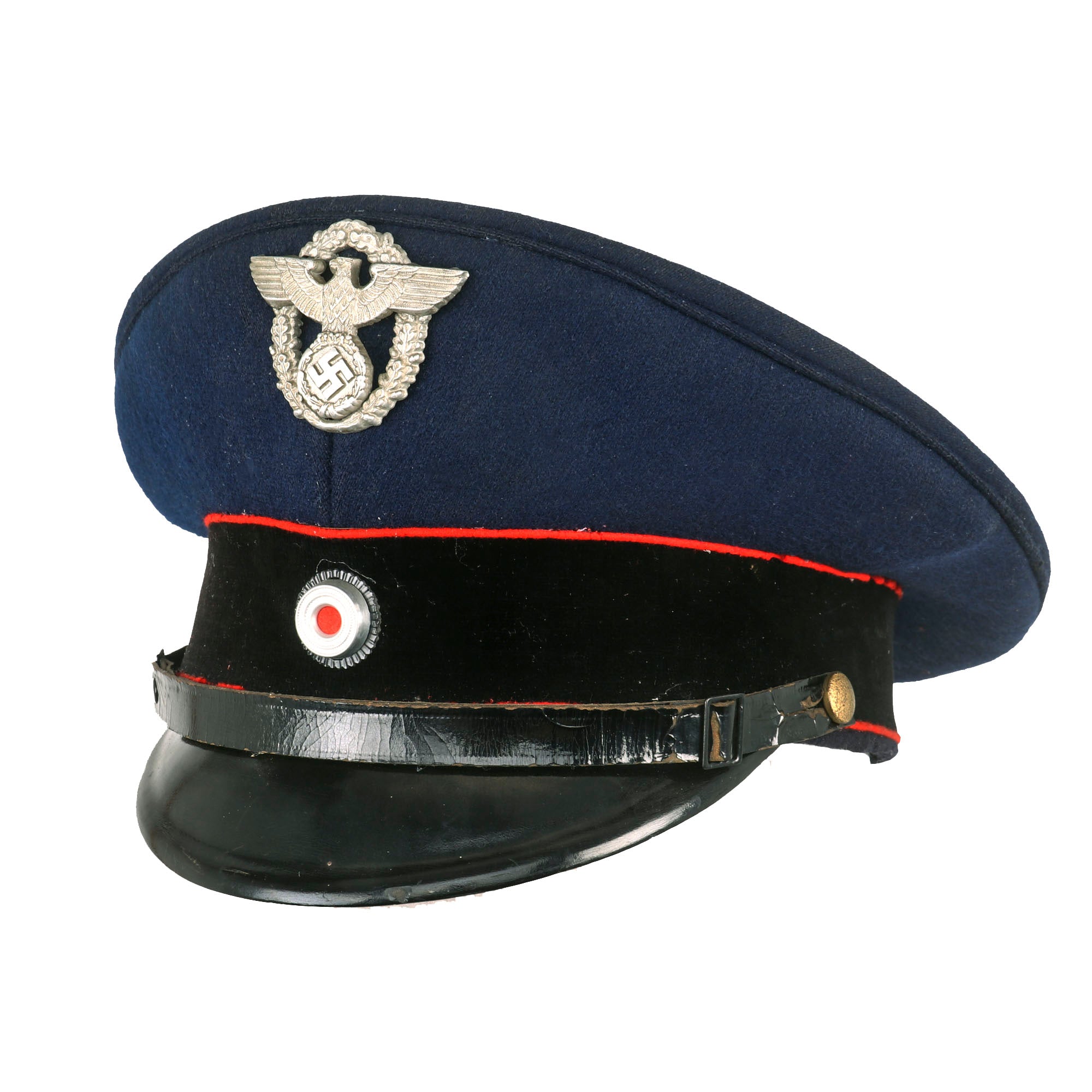 This is a high quality German made cap, which is most likely intended more for an NCO than an enlisted man. It is fabricated from very dark navy blue "doeskin" wool cloth, with a wide black velvet plush material cap band. This is flanked by two rows of carmine red (karminrot) color piping around the circumference, the Protection Police Truppenfarbe (troop color) for the Fire branch. The crown stiffener is still present, giving it a very sharp look.