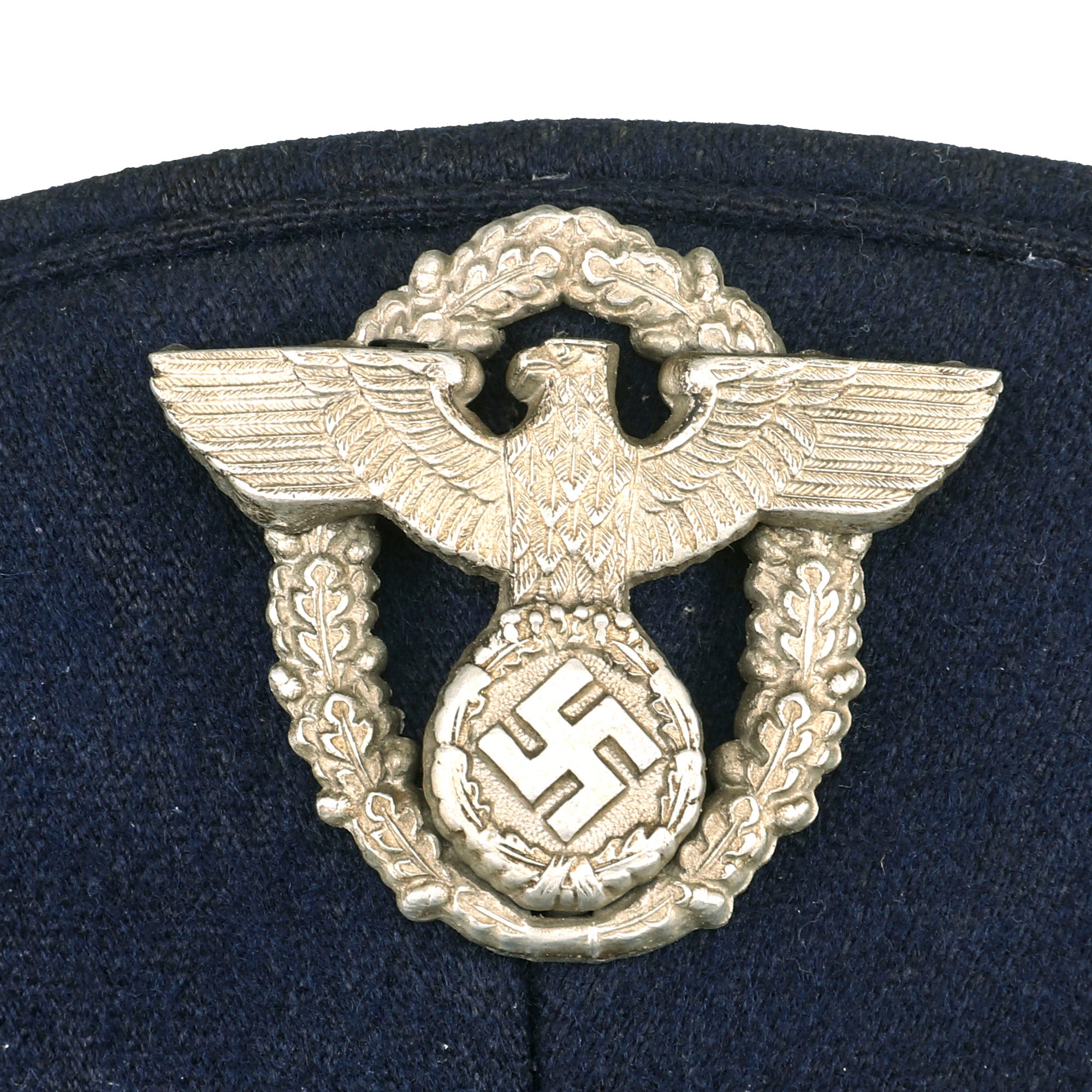 Cap is decorated with the correct insignia, including an aluminum Ordnungpolizei wreathed eagle on the crown, with the classic metal Tri-color cockade below, still bearing its vibrant red felt insert. This is reverse of how they usually are, but would be exactly correct if the Reichsbahn insignia was replaced with the police eagle. Both are in very good shape, with just a bit of oxidation and antiquing on the eagle. The EM/NCO chinstrap is in very good condition, showing some nice checking to the finish, and is held in place by the pebbled gold buttons.