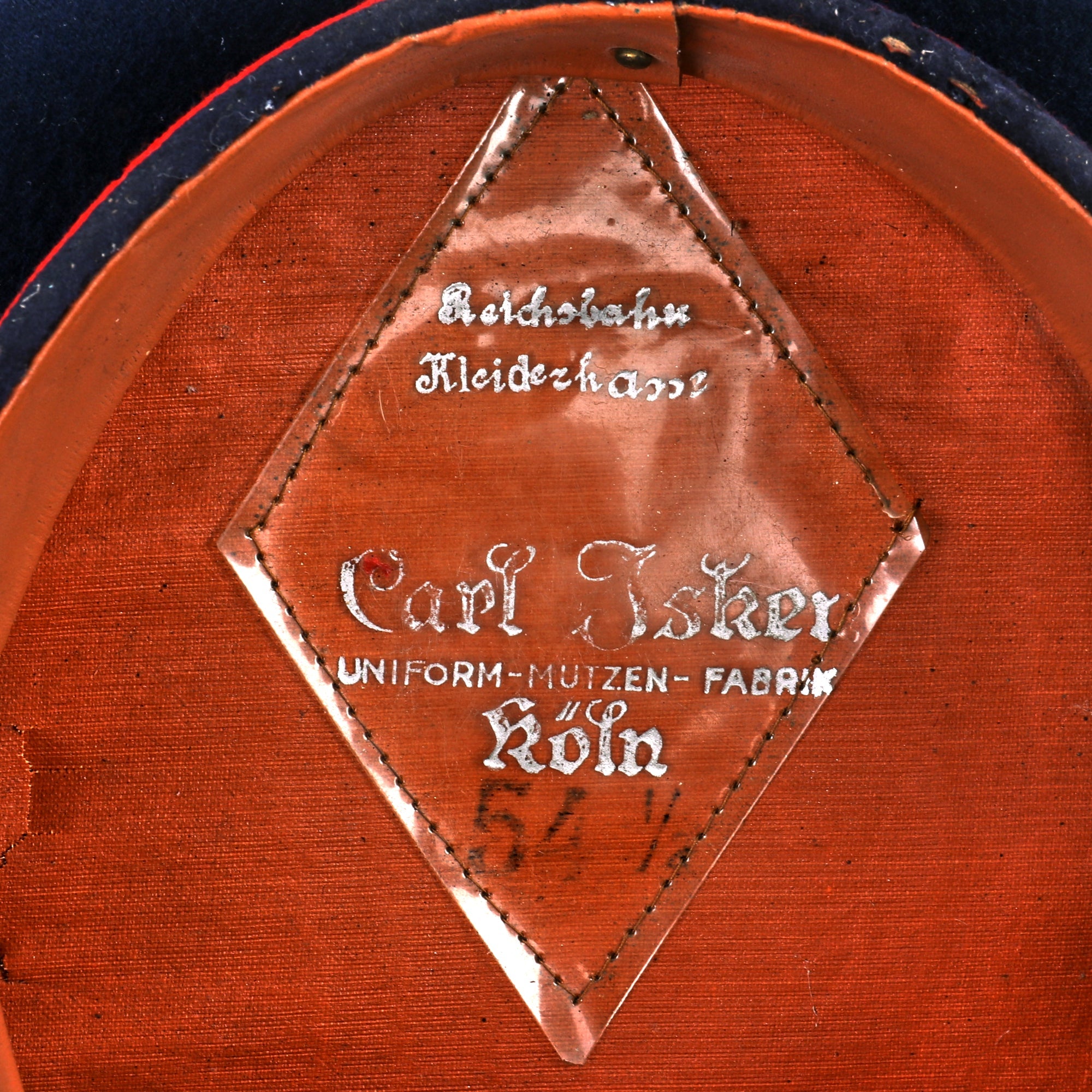 Based on these markings, we believe that this cap was converted from a Reichsbahn railway cap, either during original manufacture or later. The caps were very similar in color and piping color, so a cap on hand may have been used.