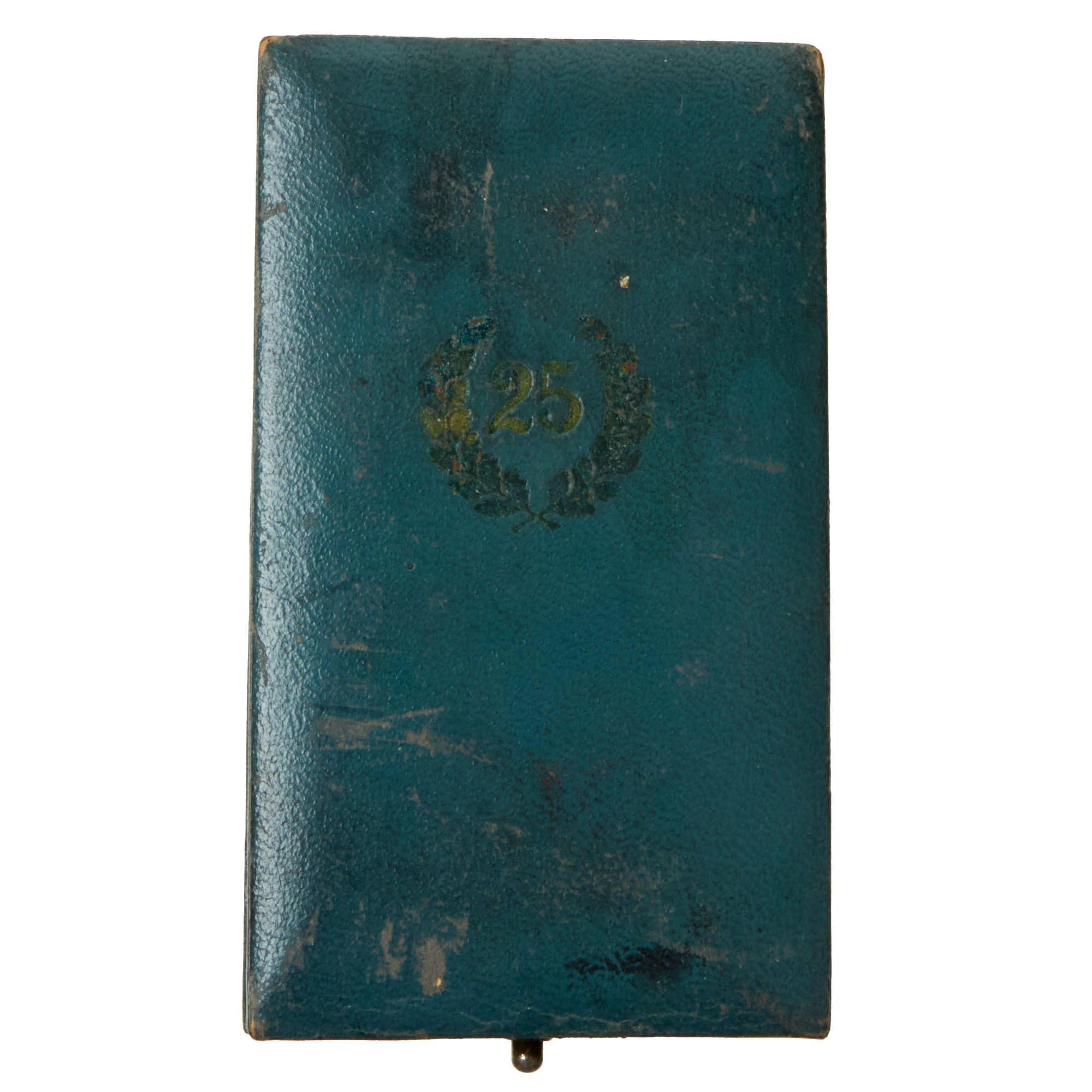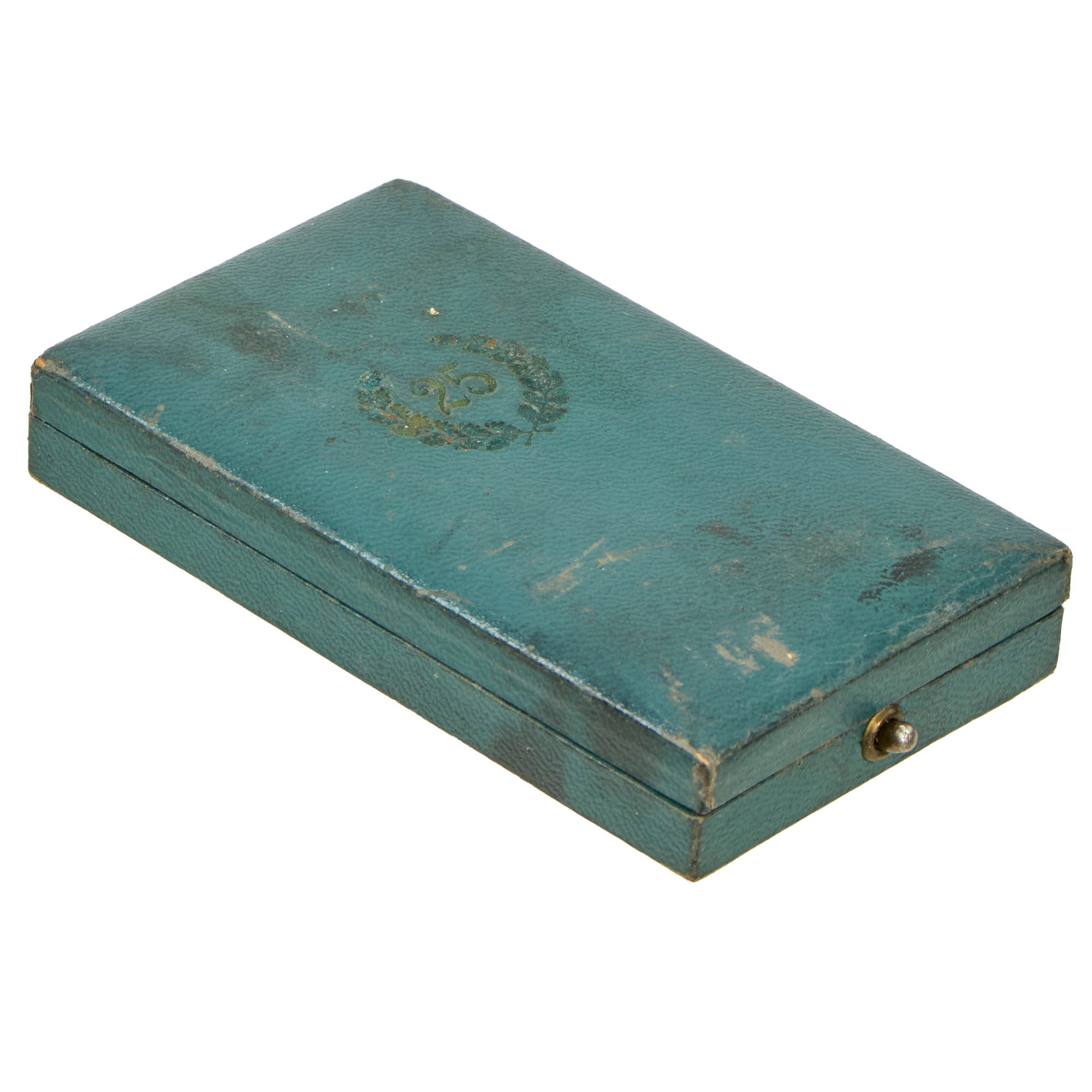 This example is the First Class award, for 25 years of service, and is in very good condition, with the correct blue ribbon with the civic police insignia embroidered on it. The gilding on the award is retained at nearly 100%, showing no real wear or oxidation. The ribbon does show a bit of fading and wear, with signs that it was attached to a medal bar or uniform before.