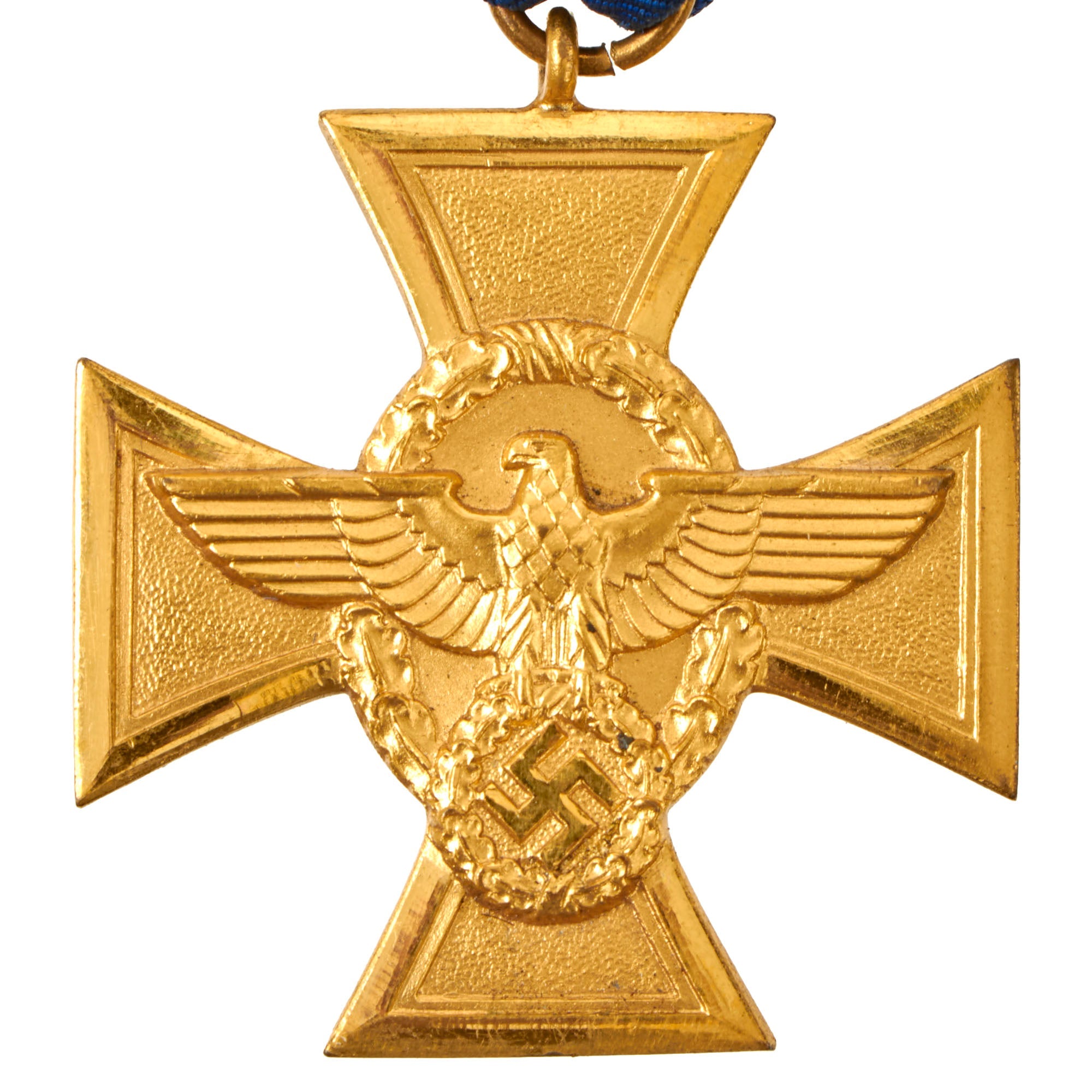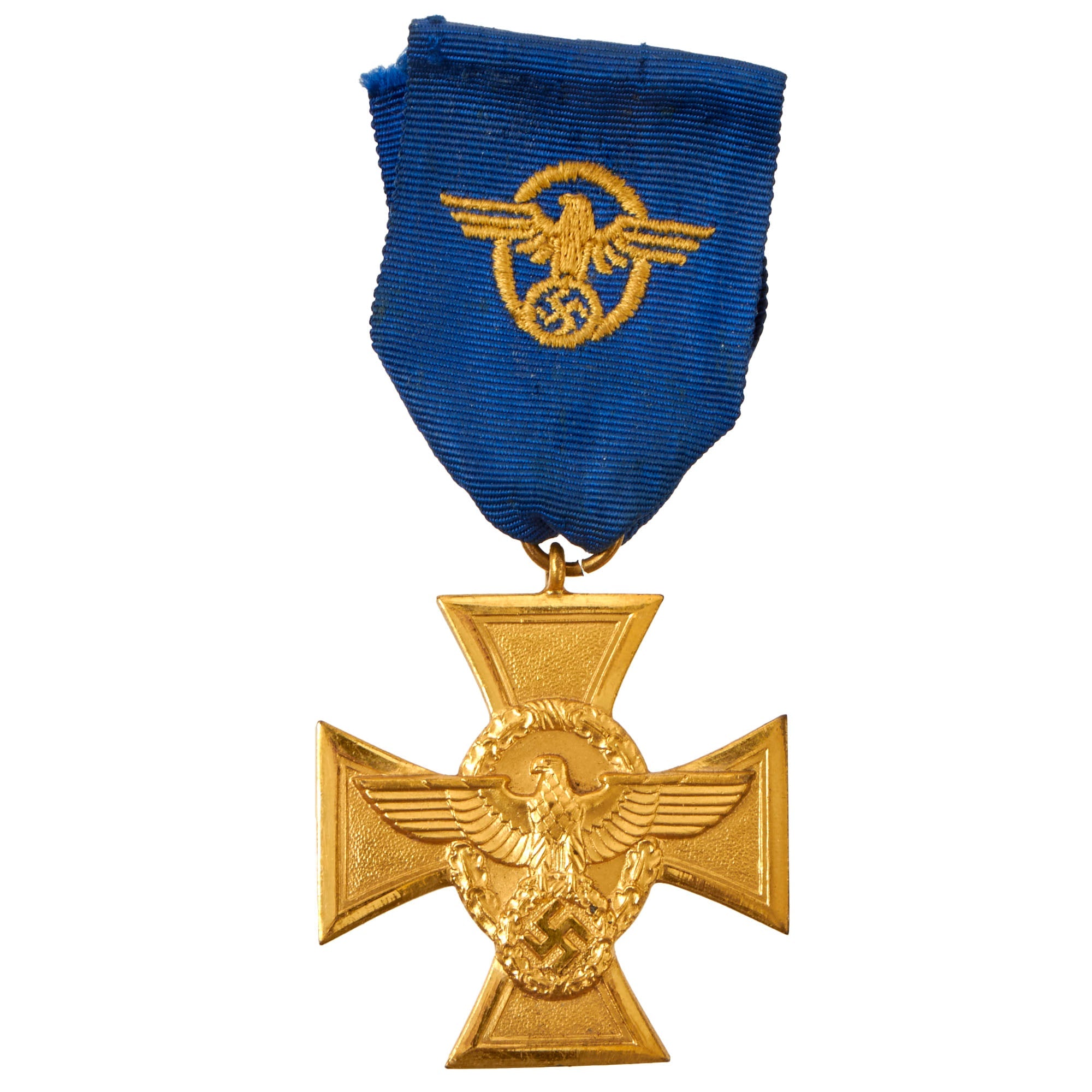 On 30 January 1938, Adolf AH ordered the institution of an award for members of the police force who met qualifications based on length of service. The award was given in three grades to men who had served for eight, eighteen, and twenty-five years. The design of all three medals had the police insignia, which consisted of a national eagle emblem surrounded by a wreath, on the obverse side. The third class award was a silver medal, the second class a silvered cross, and the first class a gold cross.