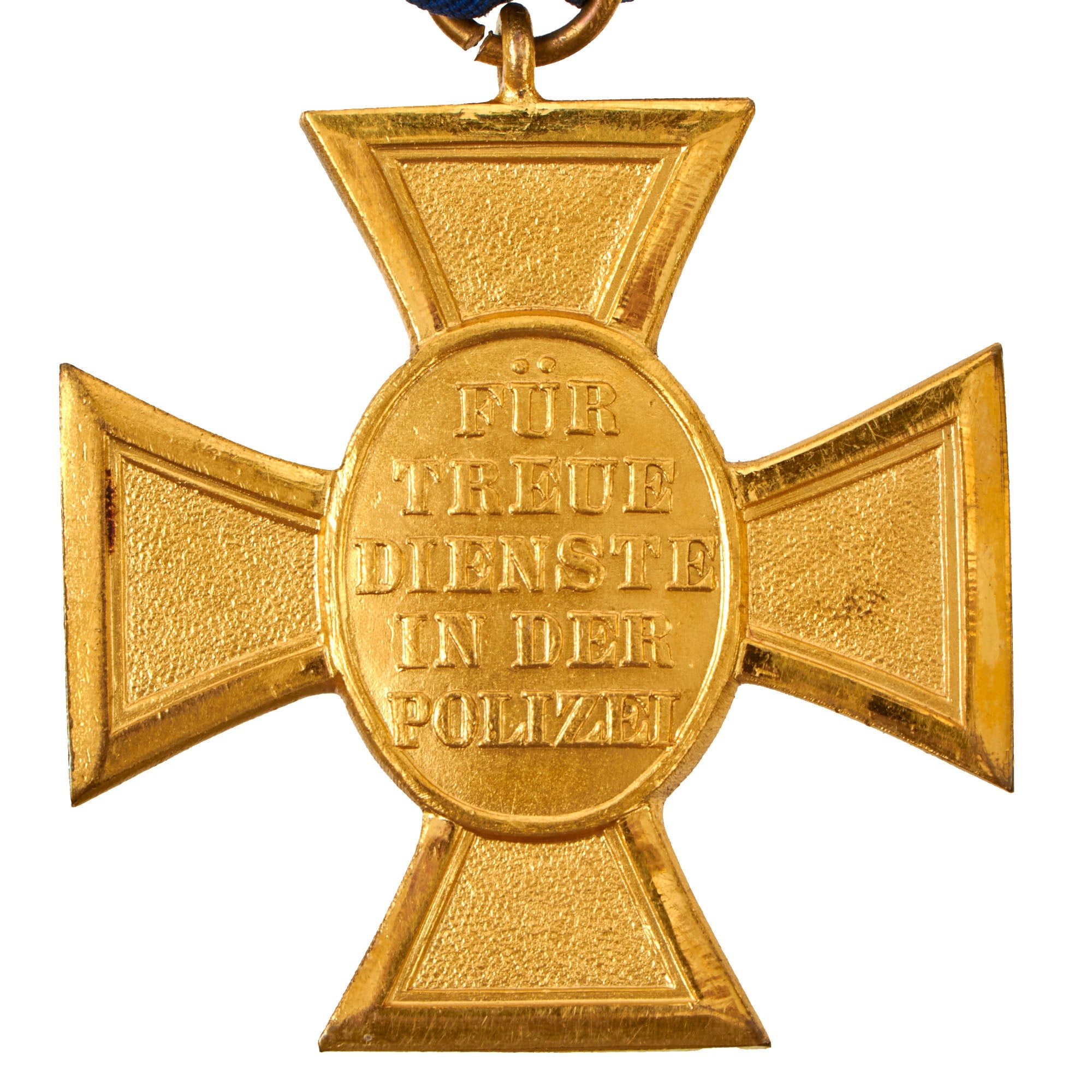 All three awards were emblazoned with the inscription FÜR TREUE DIENSTE IN DER POLIZEI ("For faithful service in the Police") on the reverse. There was a 40 year award designed and authorized during WWII, but there are no records of anyone earning it due to the end of the War and the NSDAP Party.