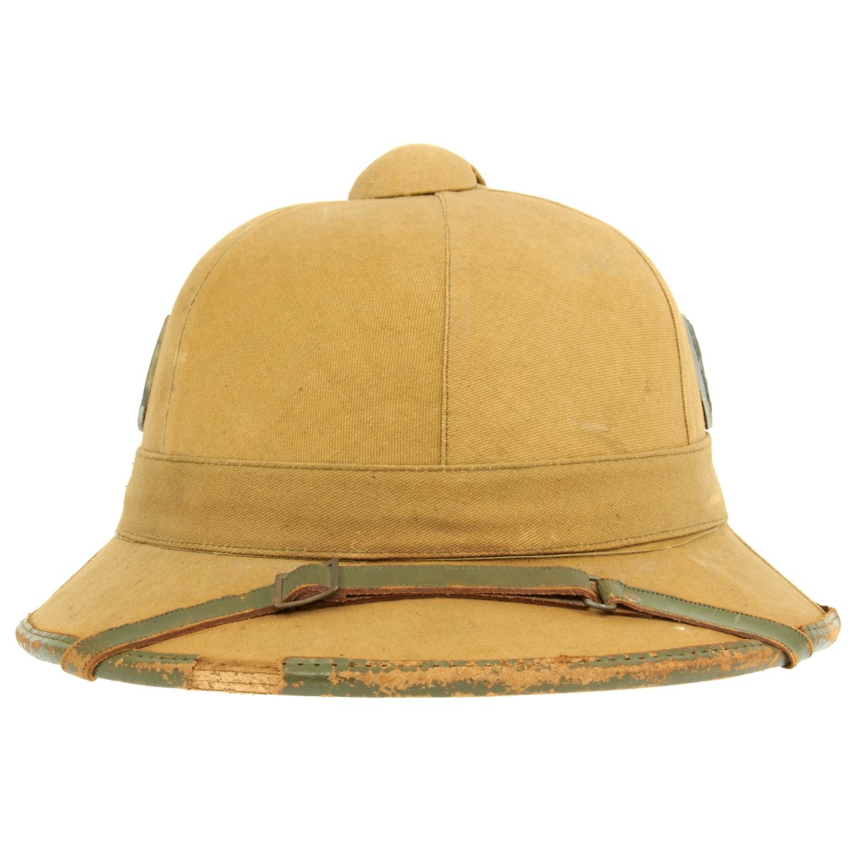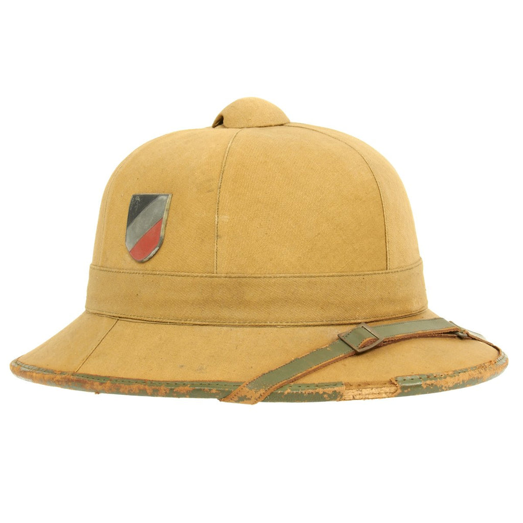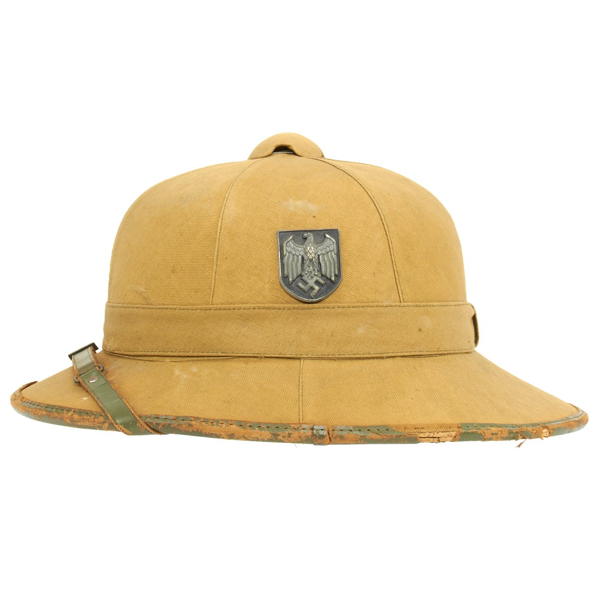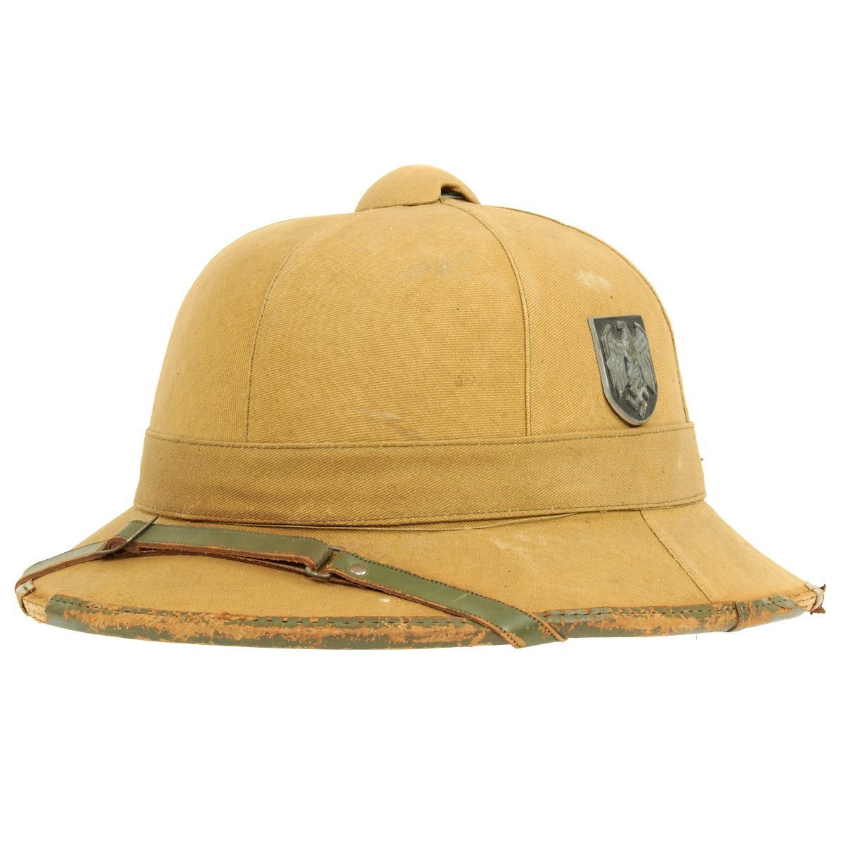 Original Item: On first deployment to North Africa in 1941, Afrikakorps infantry were issued with the traditional European sun helmet known as Tropische Kopfbedeckung, of the type known to the British forces as the solar topi (or topee). In the German case, these were made of pith, had prominent ventilation holes in the crown, were khaki in color and bore two metal shields; on the right the national colors and on the left the German eagle. There were several models made, with the first model like this having cotton outer covering made of fabric panels sewn together.