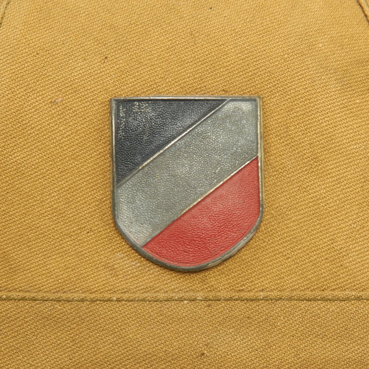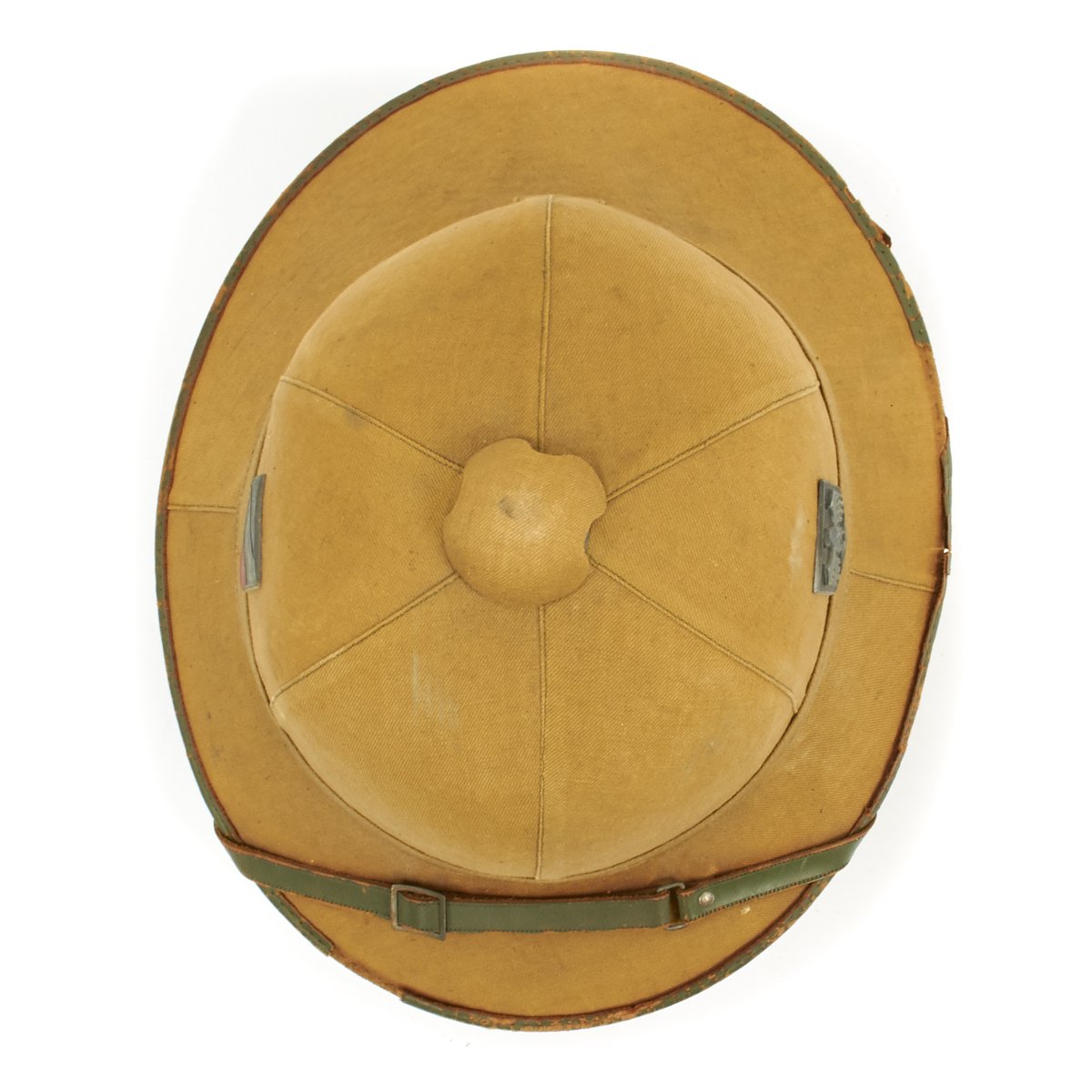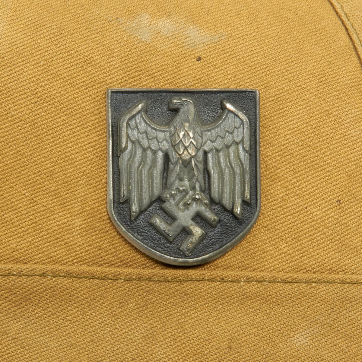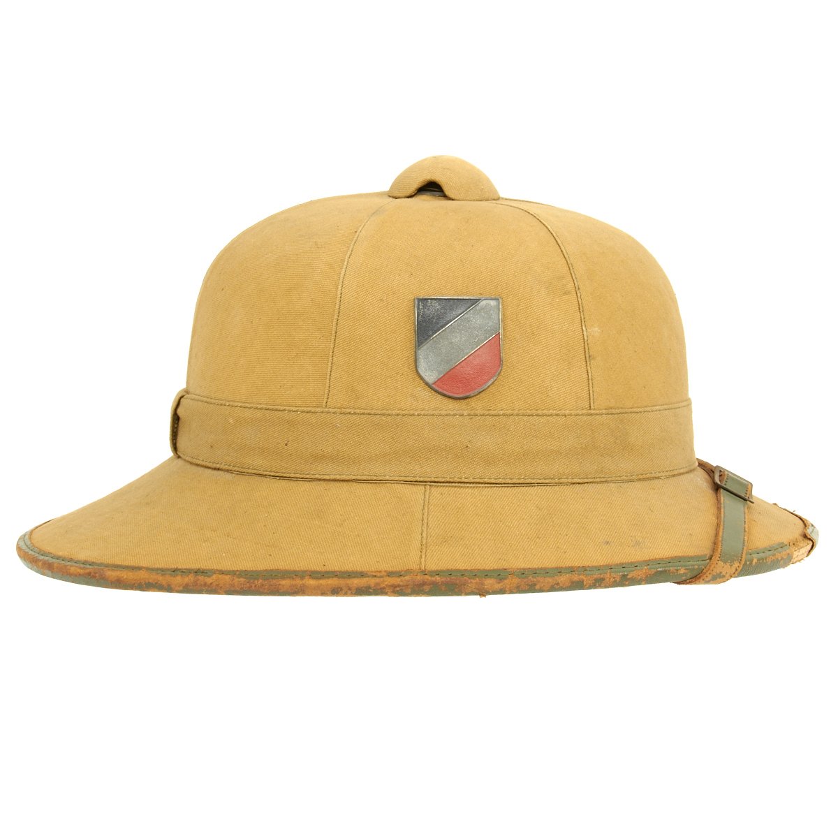Original Item: On first deployment to North Africa in 1941, Afrikakorps infantry were issued with the traditional European sun helmet known as Tropische Kopfbedeckung, of the type known to the British forces as the solar topi (or topee). In the German case, these were made of pith, had prominent ventilation holes in the crown, were khaki in color and bore two metal shields; on the right the national colors and on the left the German eagle. There were several models made, with the first model like this having cotton outer covering made of fabric panels sewn together.