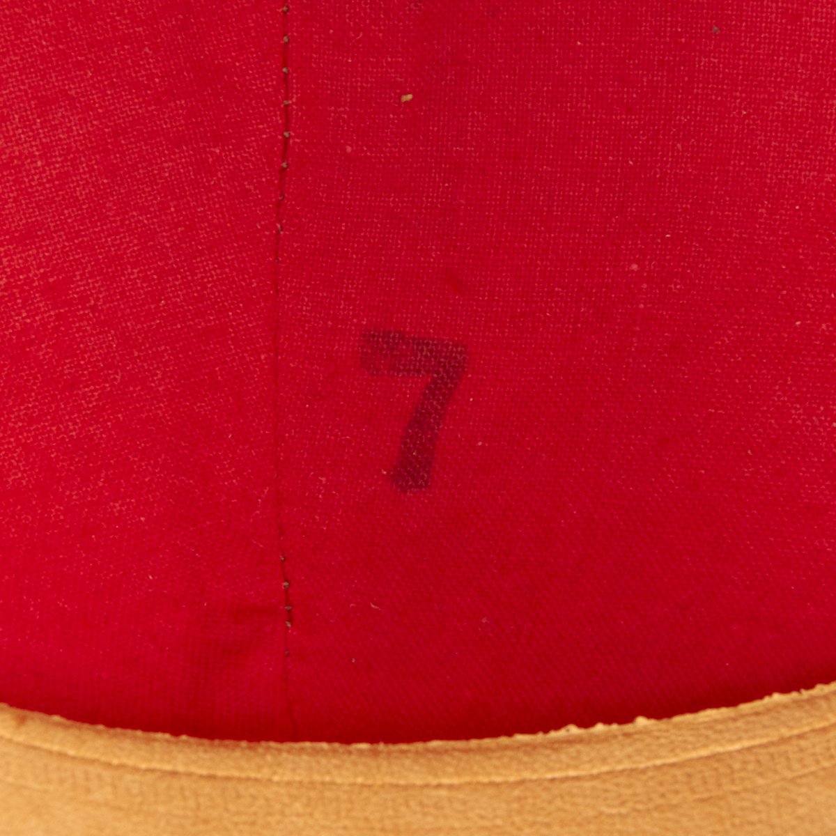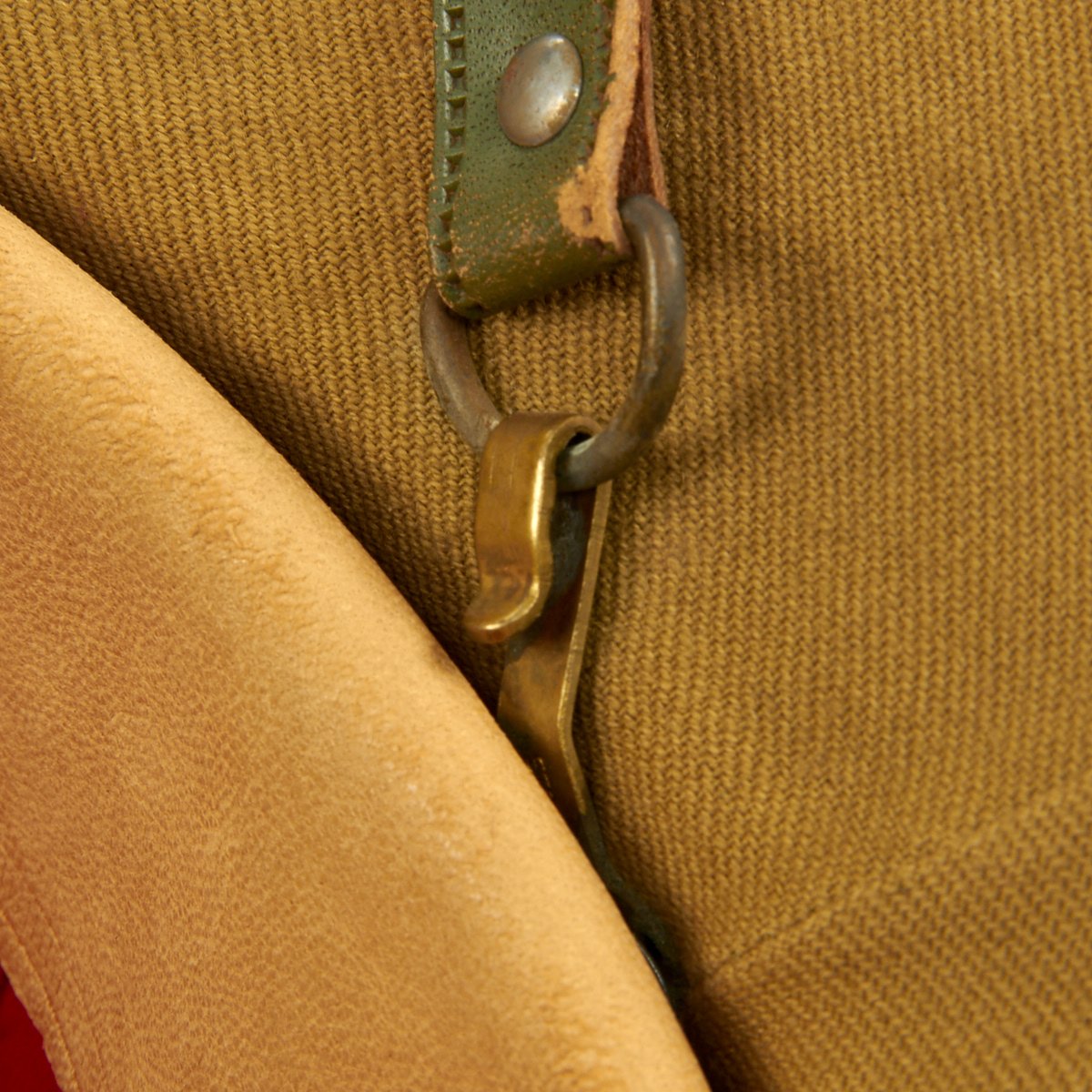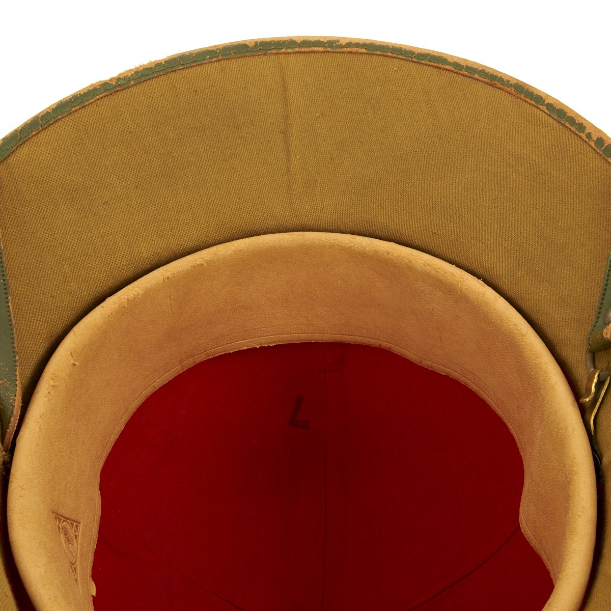 The interior of the helmet still has the original red cotton covering intact, and it only has minimal fading and staining, and is stamped 7. The liner itself is in very good condition, with the leather still supple. The felt padding and fiber band are still in excellent condition, with almost no signs of age. The underside of the leather sweatband is marked with size 57, and is also maker marked and dated: