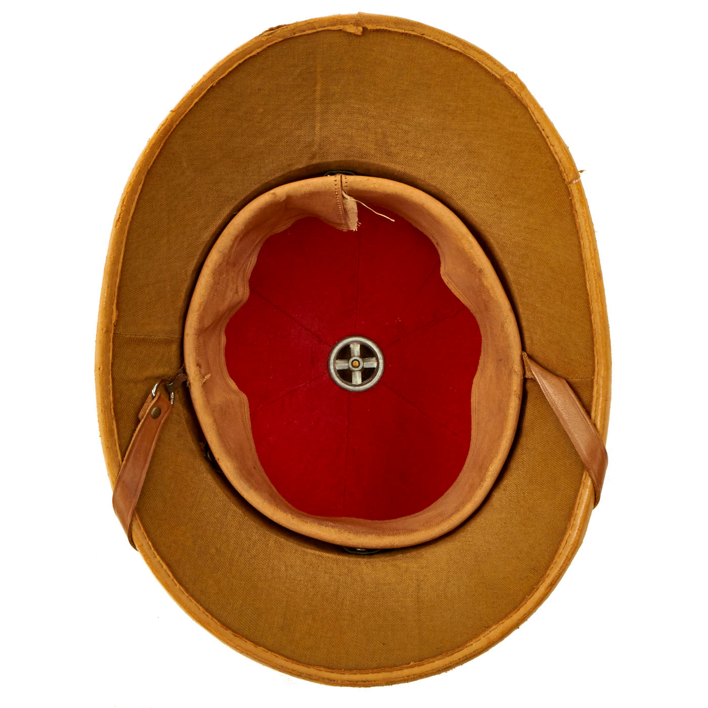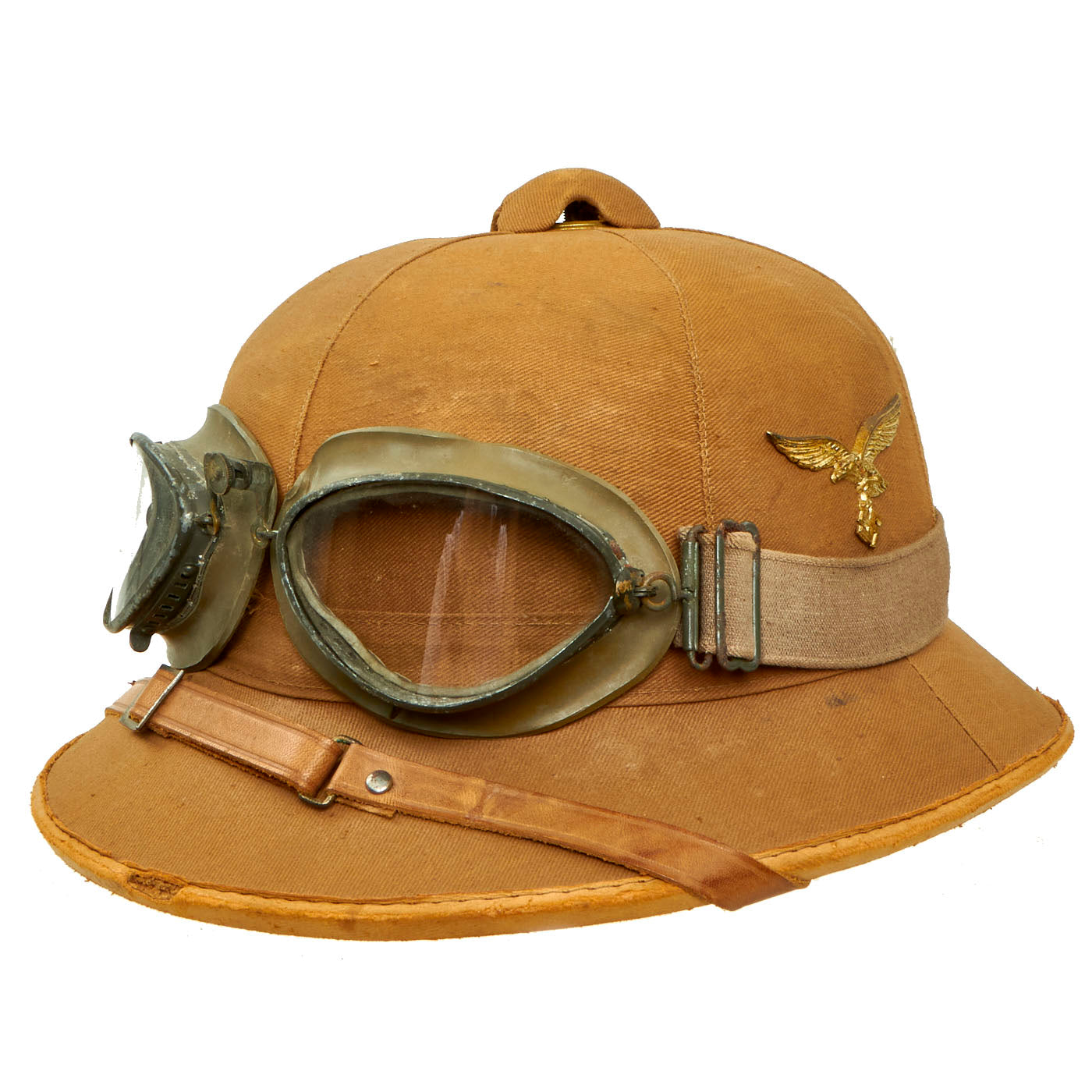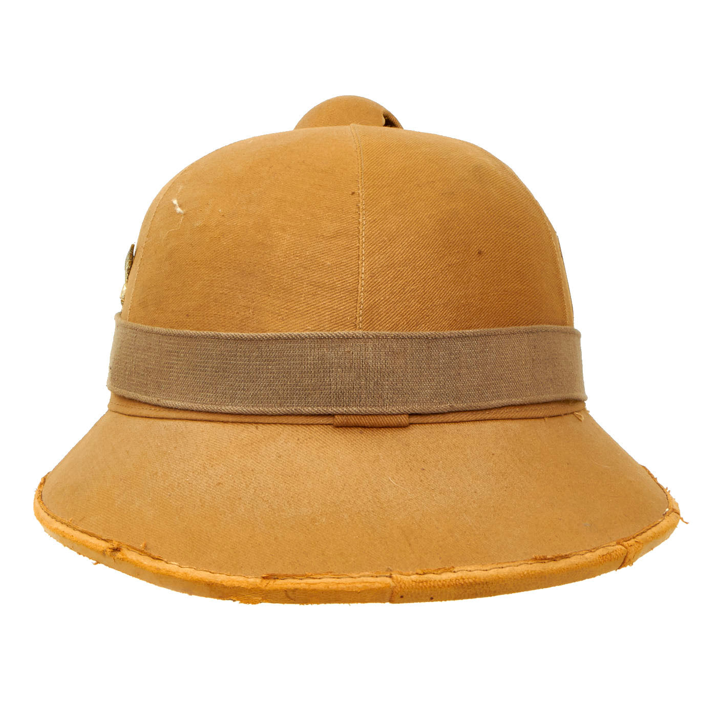 Original Item: Only One Available. On the first deployment to North Africa in 1941, Afrika Korps infantry were issued with the traditional European sun helmet known as Tropische Kopfbedeckung, of the type known to the British forces as the solar topi (or topee). In the German case, these were made of pith, had prominent ventilation holes in the crown, were khaki in color and bore two metal shields; on the right the national colors and on the left the German eagle. There were several models made, with the first model like this having cotton outer covering made of fabric sewn together.
