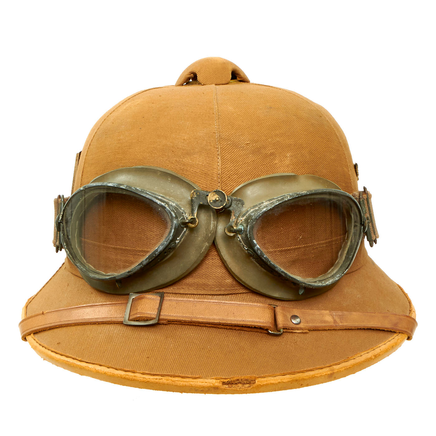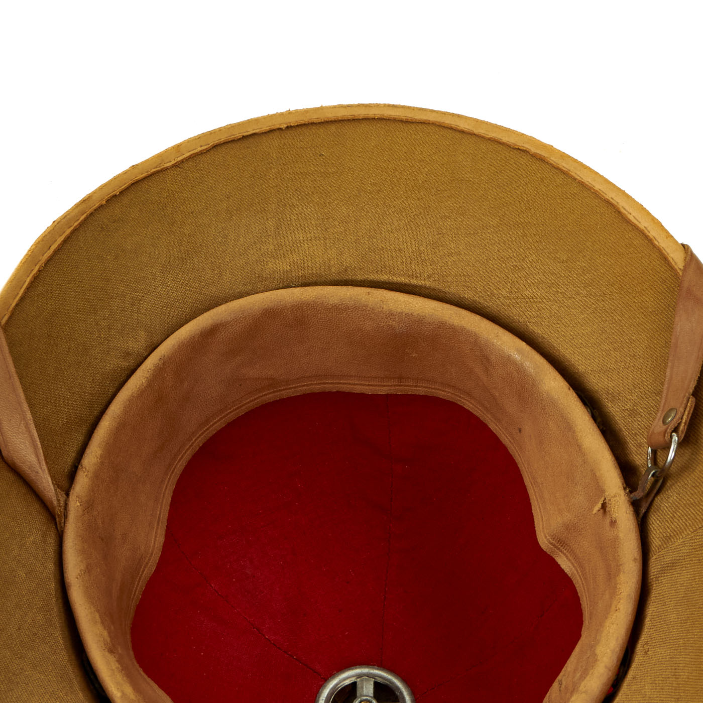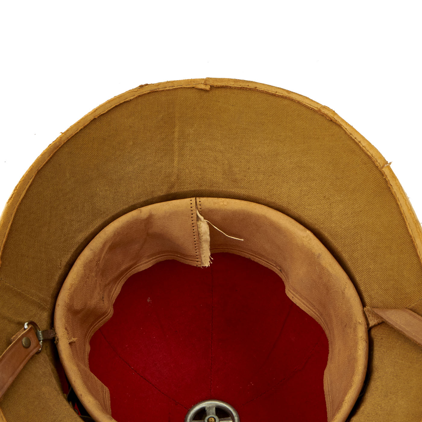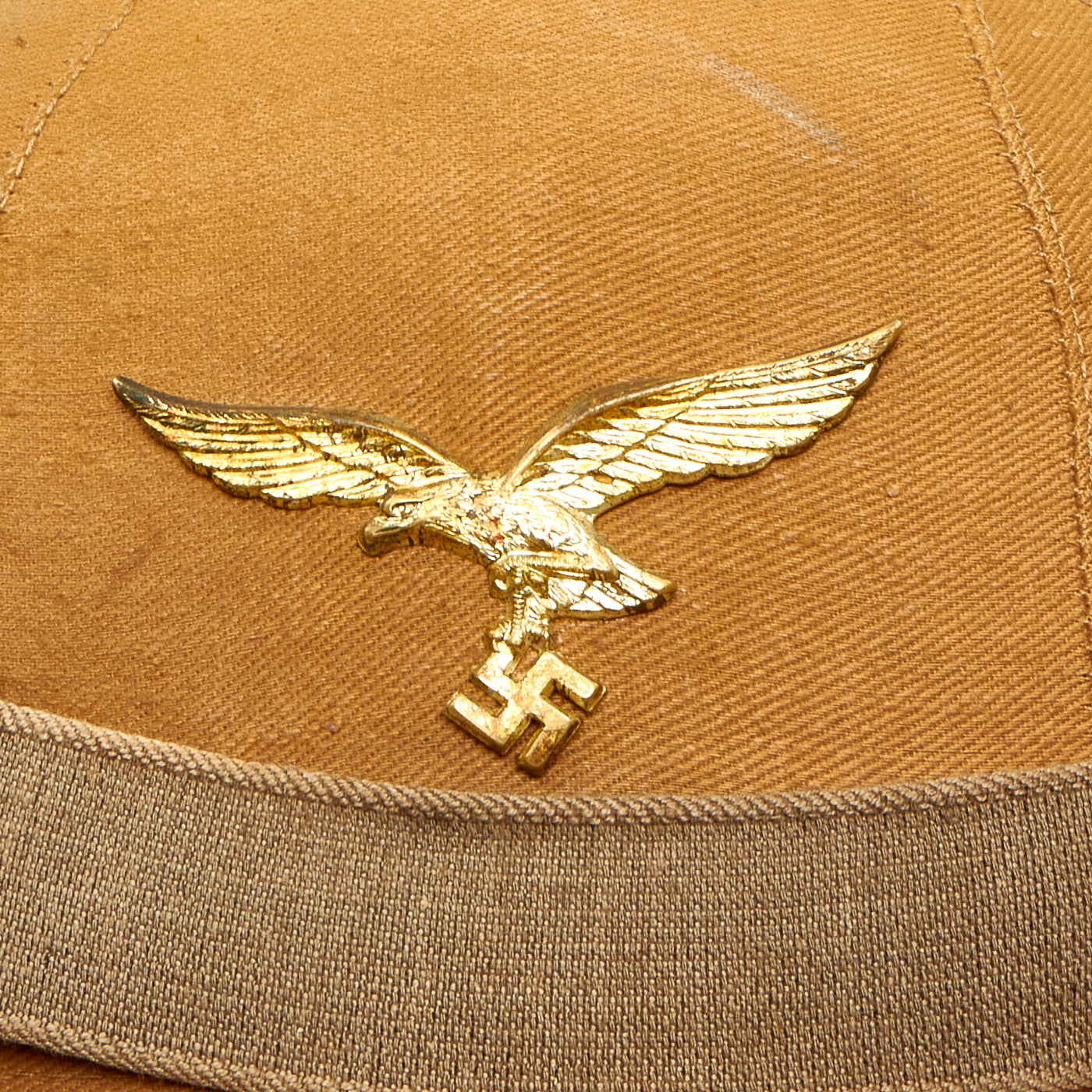 Original Item: Only One Available. On the first deployment to North Africa in 1941, Afrika Korps infantry were issued with the traditional European sun helmet known as Tropische Kopfbedeckung, of the type known to the British forces as the solar topi (or topee). In the German case, these were made of pith, had prominent ventilation holes in the crown, were khaki in color and bore two metal shields; on the right the national colors and on the left the German eagle. There were several models made, with the first model like this having cotton outer covering made of fabric sewn together.