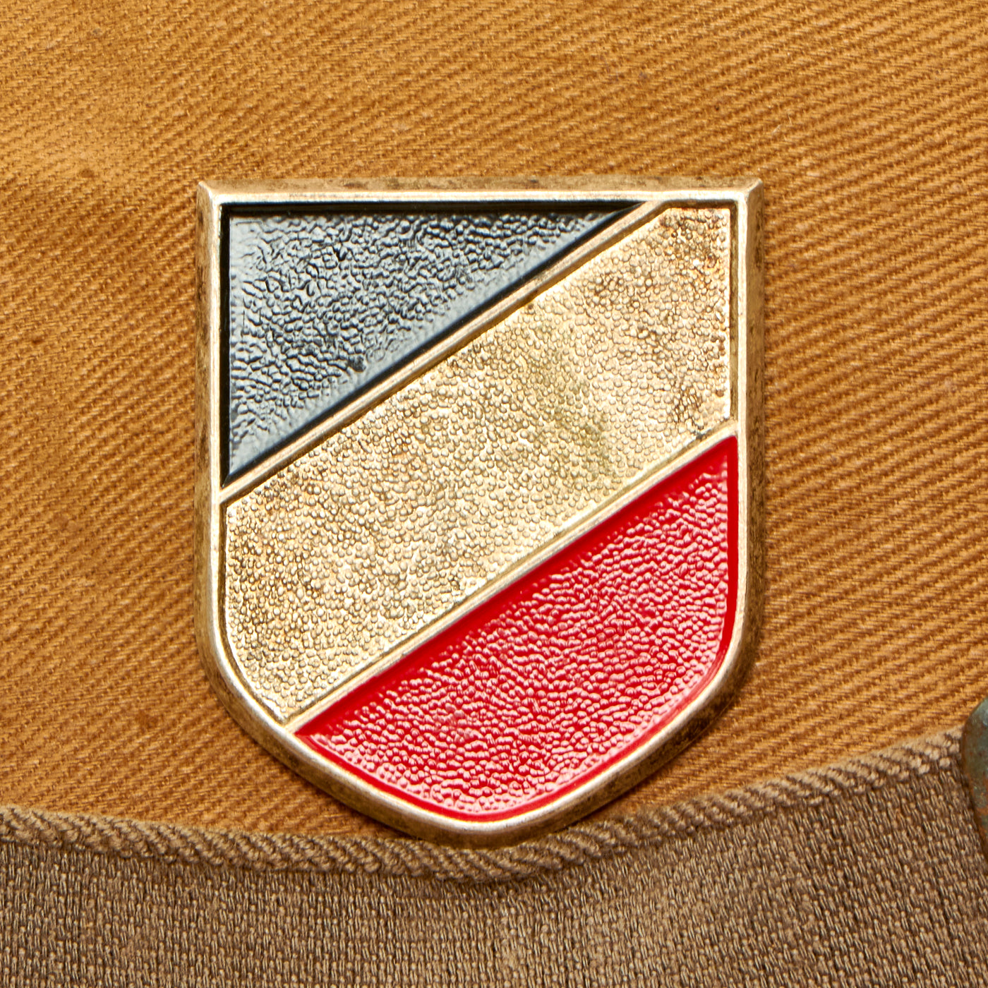 Metal badges are totally genuine and show minor wear. The early droop tail eagle pin is crisp and the original as mounted to the helmet.