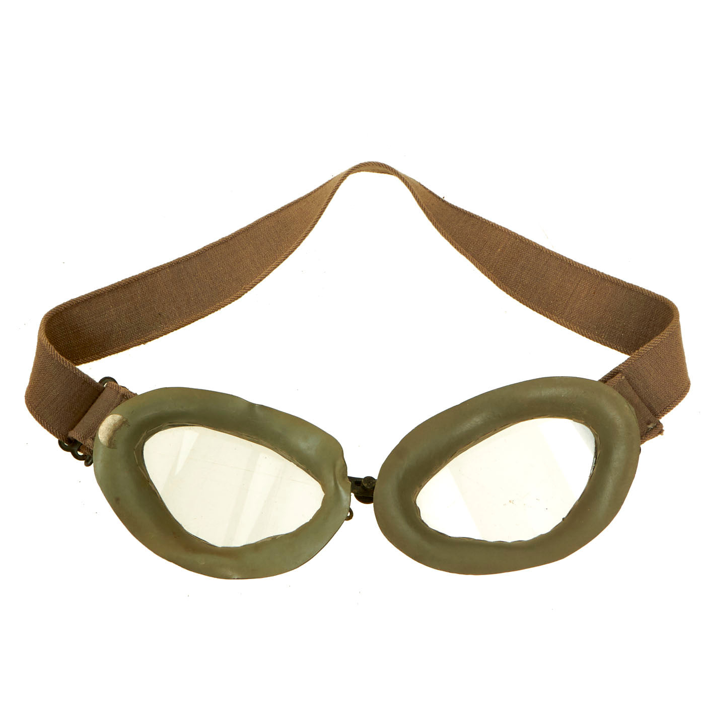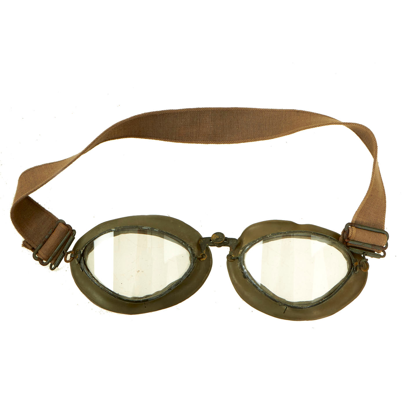 Googles in the standard teardrop design, with aviator-style clear glass lenses, Luftwaffe grey painted aluminum frames with rubber eye sockets, each of the eye sockets stitched to the framework of the googles, each of the frames have five ventilation vents along the top and bottom edges, the frames linked together by an aluminum nose bridge with a single screw fit adjustment, maker marked SuG and 59 on the front of the nose bridge, ribbed olive green elasticized headband strap with sliding metal fit adjustment buckle, elongated loops with hooks attaching the headband to the frames on either side, the googles themselves attached to the frames by small metal clips which also act as locking clips to secure the lenses in the frames.